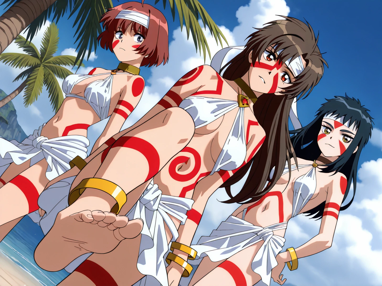 1girls, solo, little girl, short stature, flat chest, (childish ?????:1.5), (???????), shimabara yuuhi lifting one leg to show the soles👣 arch of the foot palm, foot on viewer, blue black hair, short disheveled bangs, jagged cowlick, long locks, medium long hair, thick eyebrows, (raised eyebrow, squinting:0.6), half opened one eye, sharp golden eyes, small breasts, solo, (provocation, evil smile, smug:0.5), (5toes), crotch of toes, spread toes, toenails, feet, blush, ass visible through thighs, armpit, navel, collarbone, ribs, skinny, sweat, steam, stuffy smell, translucent skin, dynamic pose, lips gloss, red tribal tattoo swirls spin pattern all over body, red body markings, bodypaint, full-body tattoo, body writing, red facepaint, red facial tattoo, swirl breasts tattoo, swirl belly tattoo, chest tattoo, arm tattoo, leg tattoo, thigh tattoo, shoulder tattoo, butt tattoo, tribal tattoo, tribal, white ribbon forehead (hachimaki) headband, white criss-cross halter neck, white loincloth, white sarong, golden anklet, golden armlet, golden bangle, golden bracelet, golden choker, ??????????????????, tentacles under clothes, tentacles coming out of ????, cumpussy, cumanus, (restrained:1.6) by tentacles, (dirty crying face:0.5), (force ??????:1.5), (ahegao:0.6), (dynamic pose), (one leg up), beautiful detailed background, tentacle pit, spread ????, dripping, wet, ????? juice, ????? juice trail, ????? juice stain, (foot forcus:0.8), (ass forcus:0.8), from above, dutch angle, (cowboy shot:0.4), masterpiece, best_quality, high res image, cute face, clear skin, shiny hair, ultra detailed eyes,<lora:shimabara_yuuhi_neo_ranga_IllustriousXL01_lora_20241002_epoch_18+12+12:0.8>