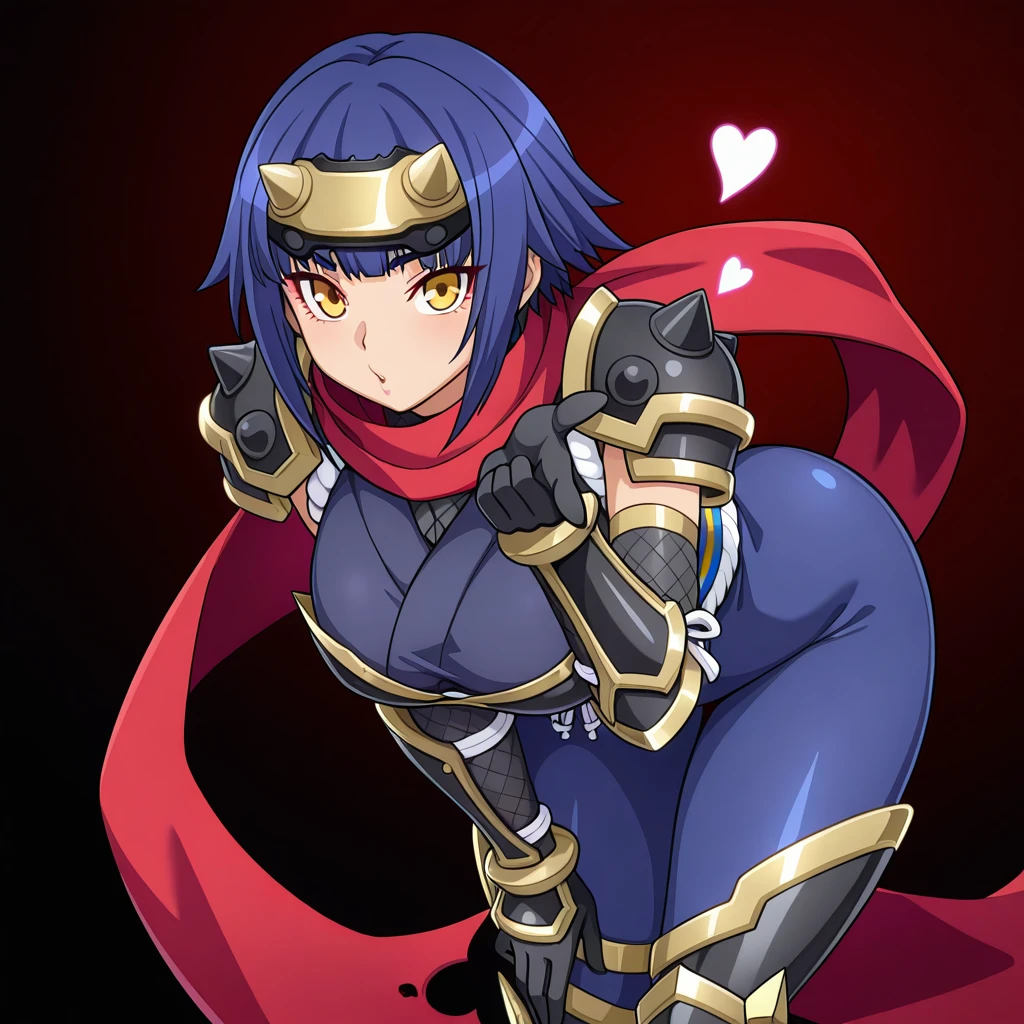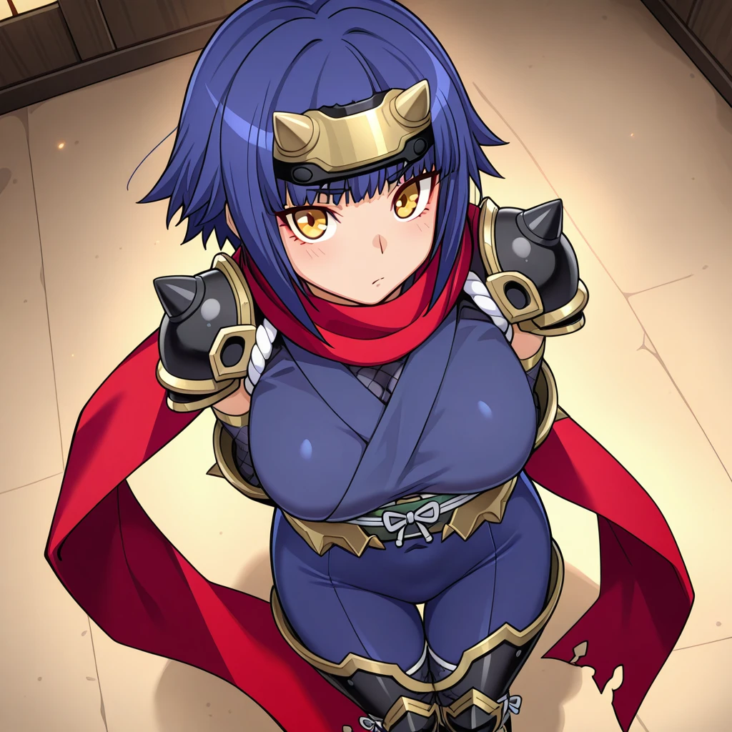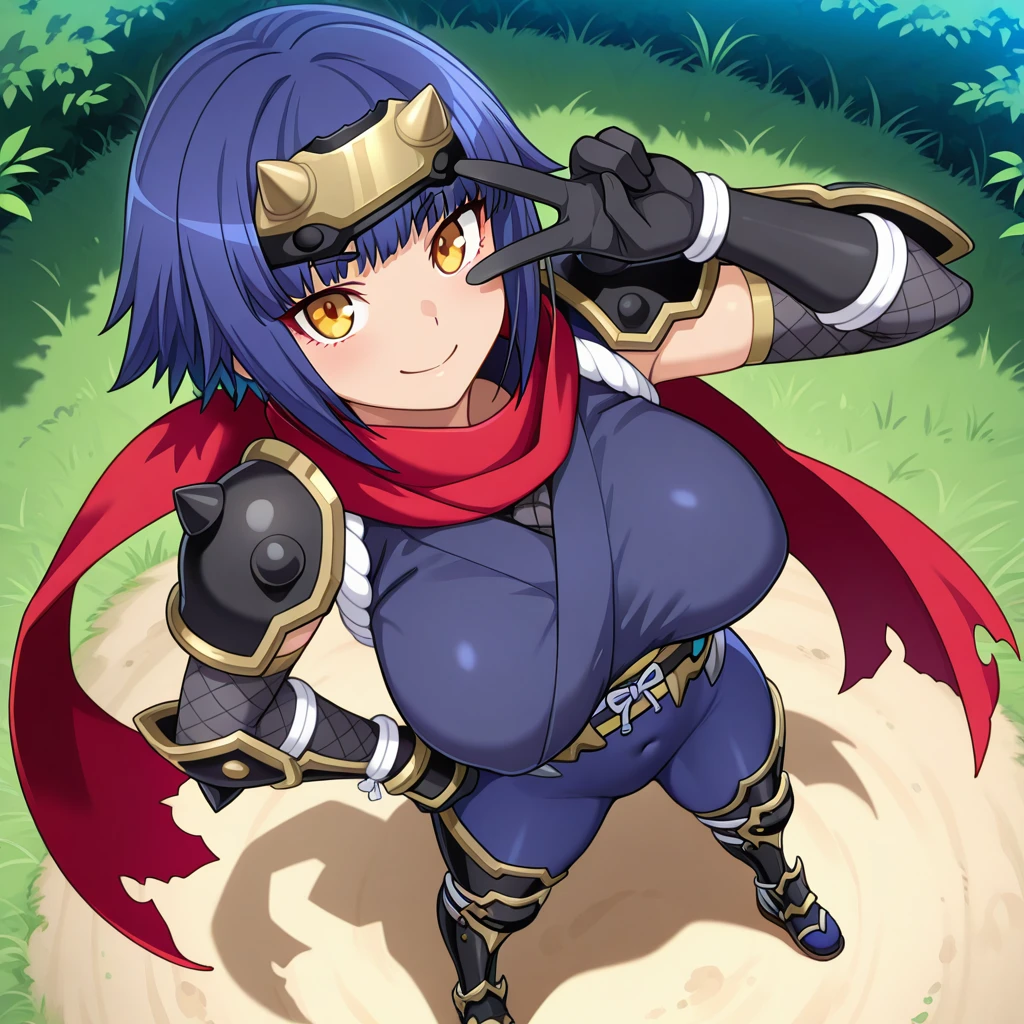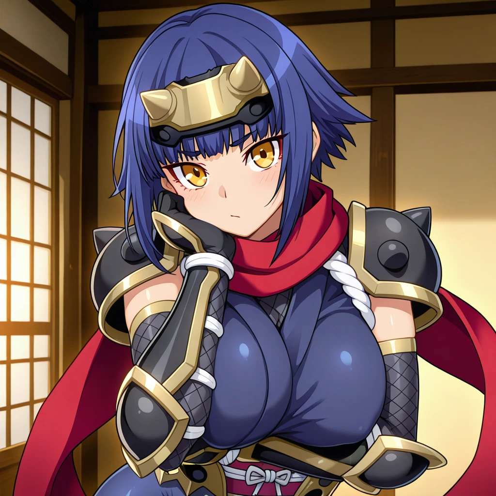 ewkaguya, 1girl, solo, short hair, blue hair, yellow eyes, large breasts, forehead protector, red scarf, armor, fishnets, elbow gloves, blue bodysuit, obi, white rope, shoulder armor, vambraces, greaves