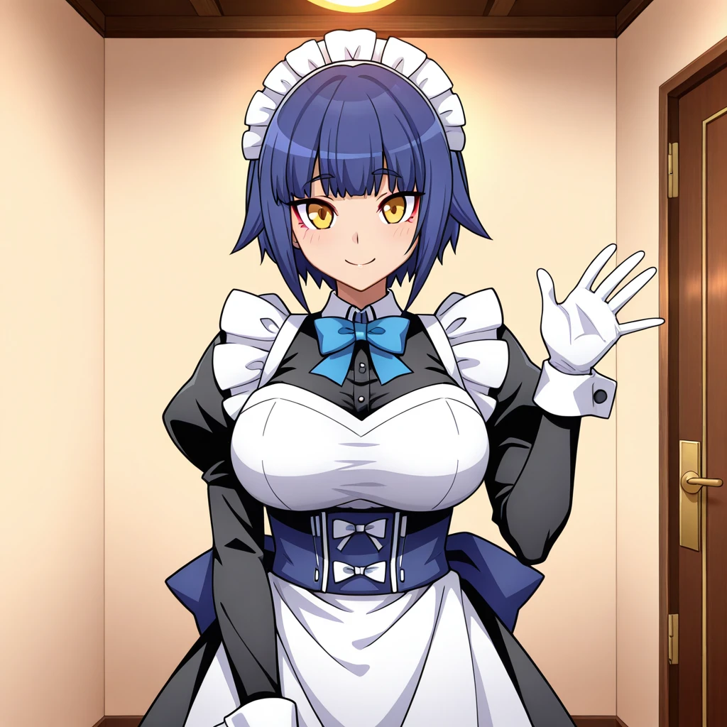 ewkaguya, 1girl, solo, short hair, blue hair, yellow eyes, large breasts, maid, maid headdress, gloves, apron, white gloves, dress, blue bow
