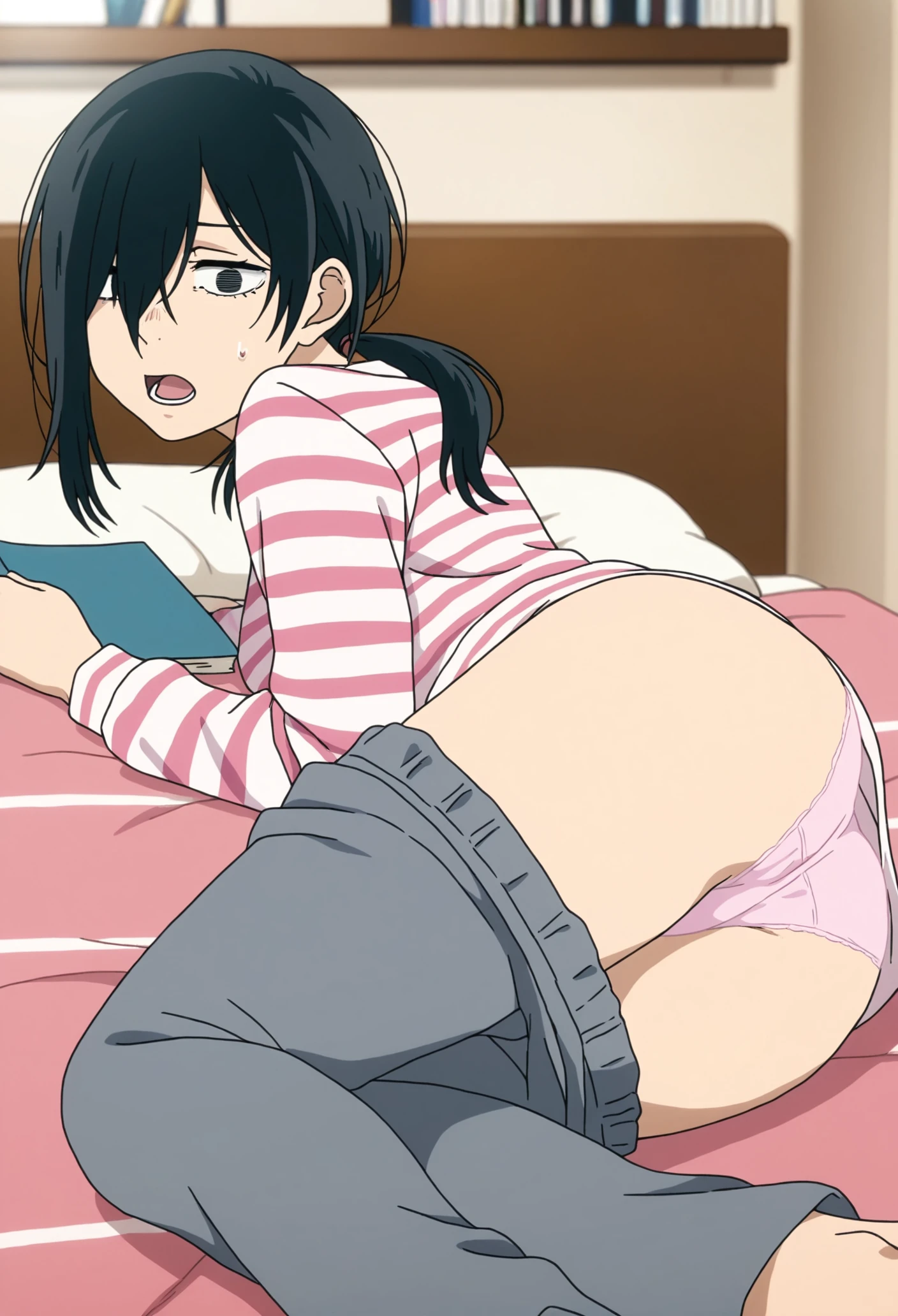 kyoko_1726, black hair, medium hair, low ponytail, black eyes, bangs, hair between eyes,