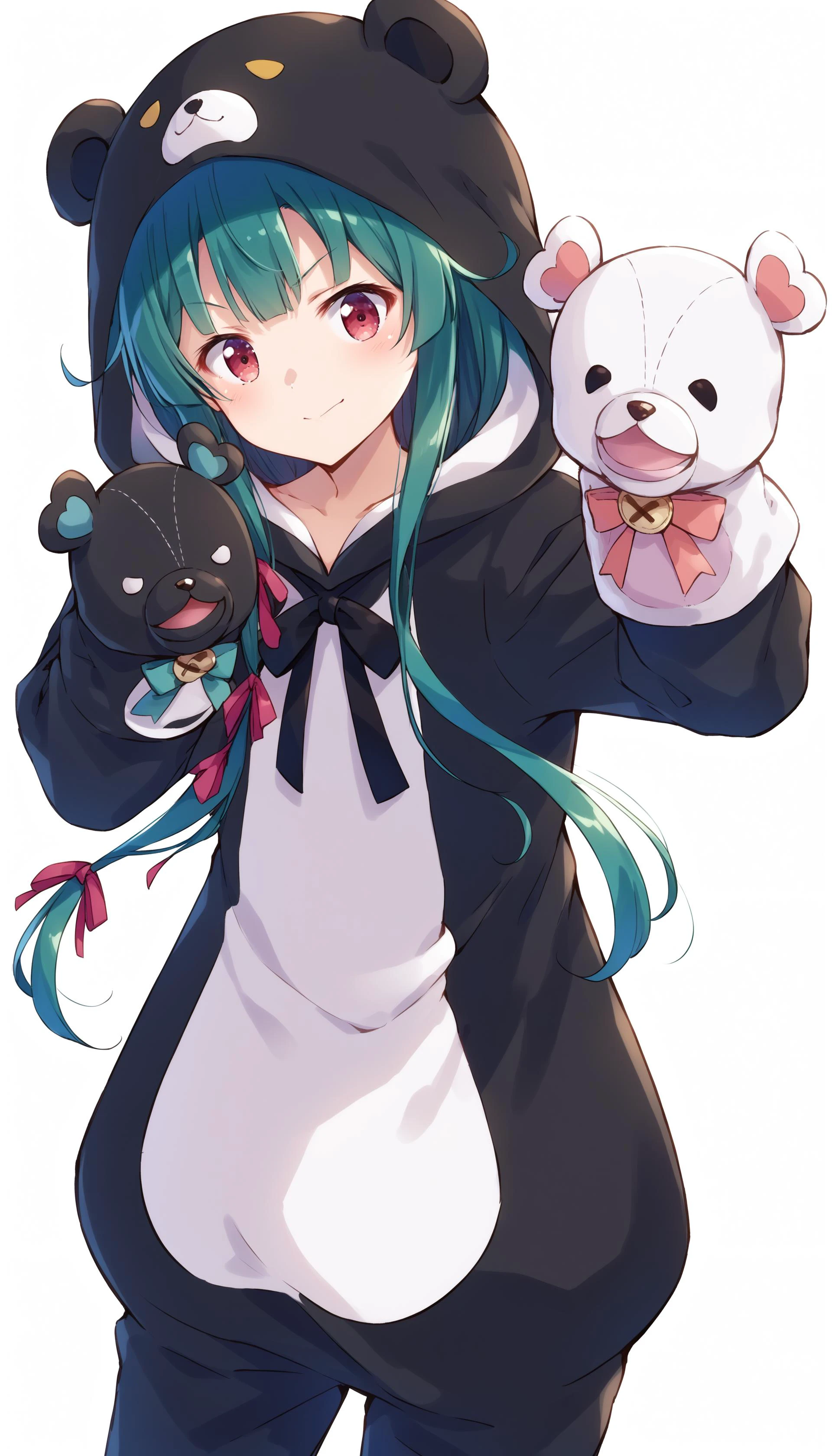 animal costume, animal ears, animal hood, bear costume, bear ears, bear hood, green hair, green ribbon, hair ribbon, hand puppet, hood, hood up, kigurumi, kuma kuma kuma bear, long hair, long sleeves, pink ribbon, pontasu, puppet, red eyes, red ribbon, ribbon, yuna (kuma kuma kuma bear), <lora:yuna_kuma_kuma_kuma_bear_pony_v1:1>