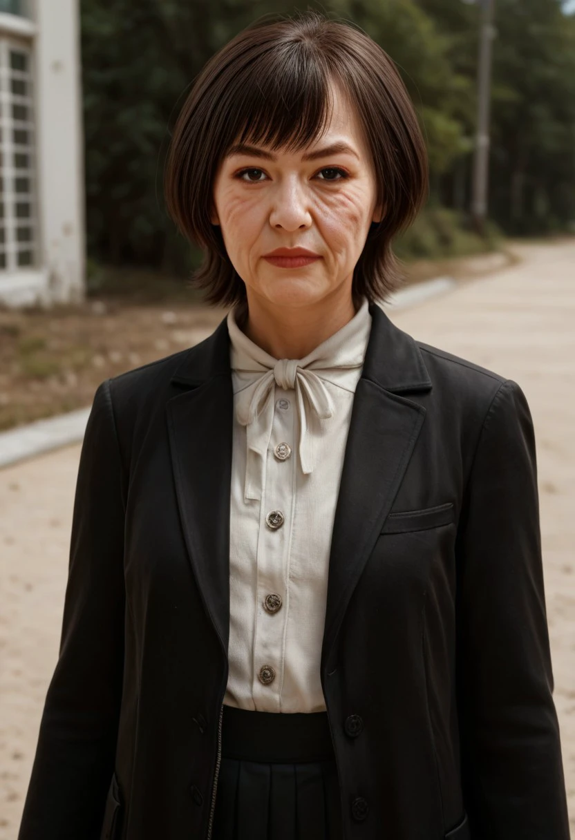 Default: Reiko_Kusumoto, gilf, old_woman, face with wrinkles, short_hair, brown_eyes, brown_hair, makeup
