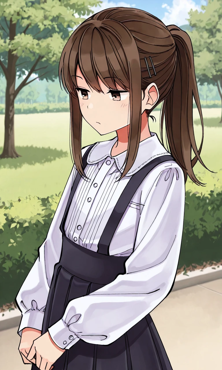 kaoruterasaki, brown hair, brown eyes, skirt, ponytail, crossdressing, long hair, suspender skirt, hairclip, black skirt, white shirt, long sleeves