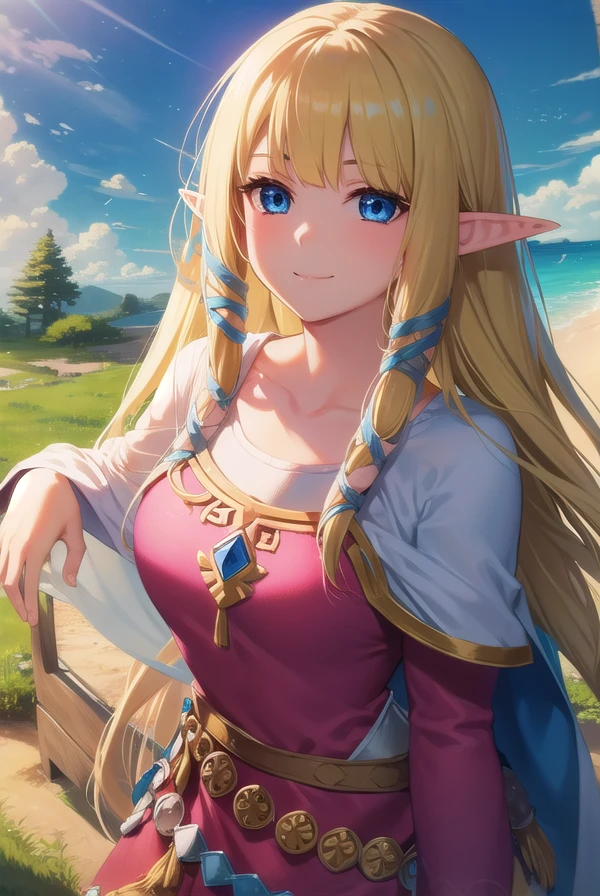 princess zelda, blonde hair, (green eyes:1.5), pointy ears, long hair, parted bangs,