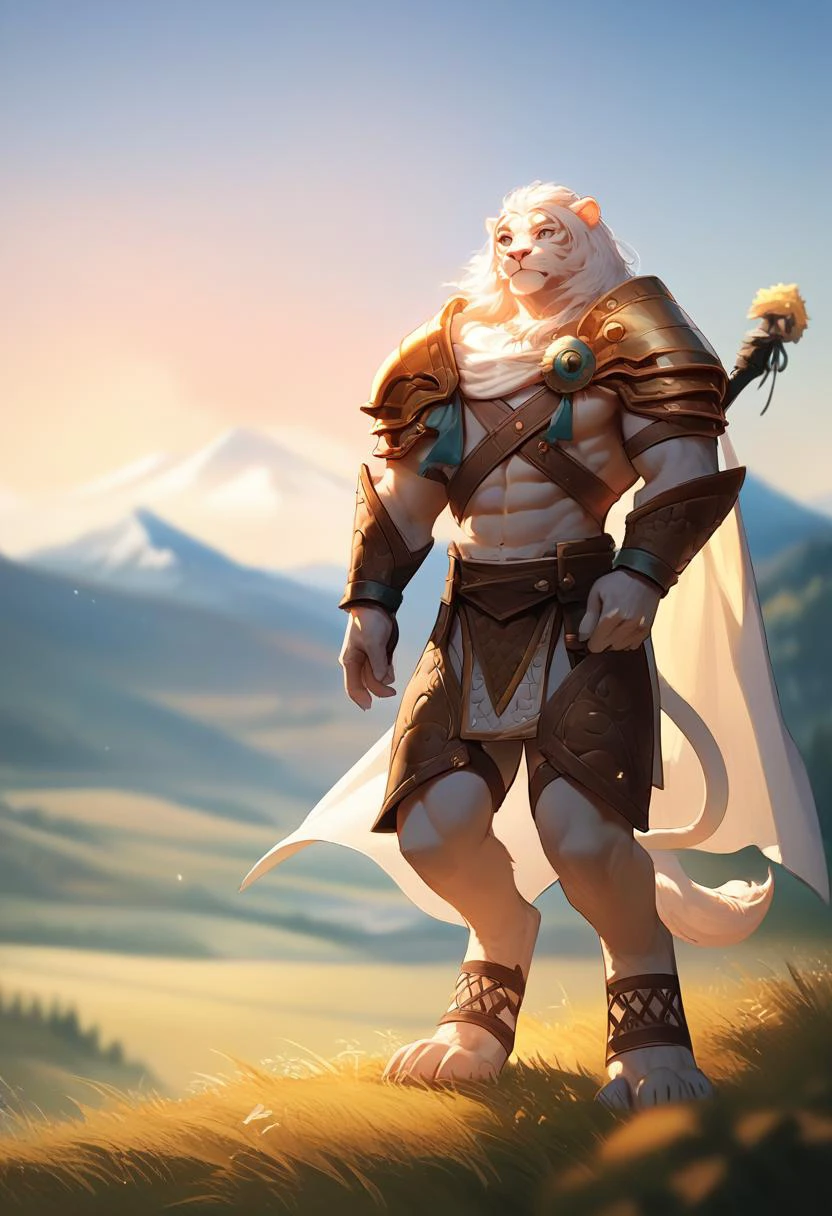 1boy, solo, male focus, solo focus, <lora:AJANI:1>, furry, furry male, muscular, white hair, armor, cape, tail, pectorals, tiger boy, tiger ears, bara, white fur,