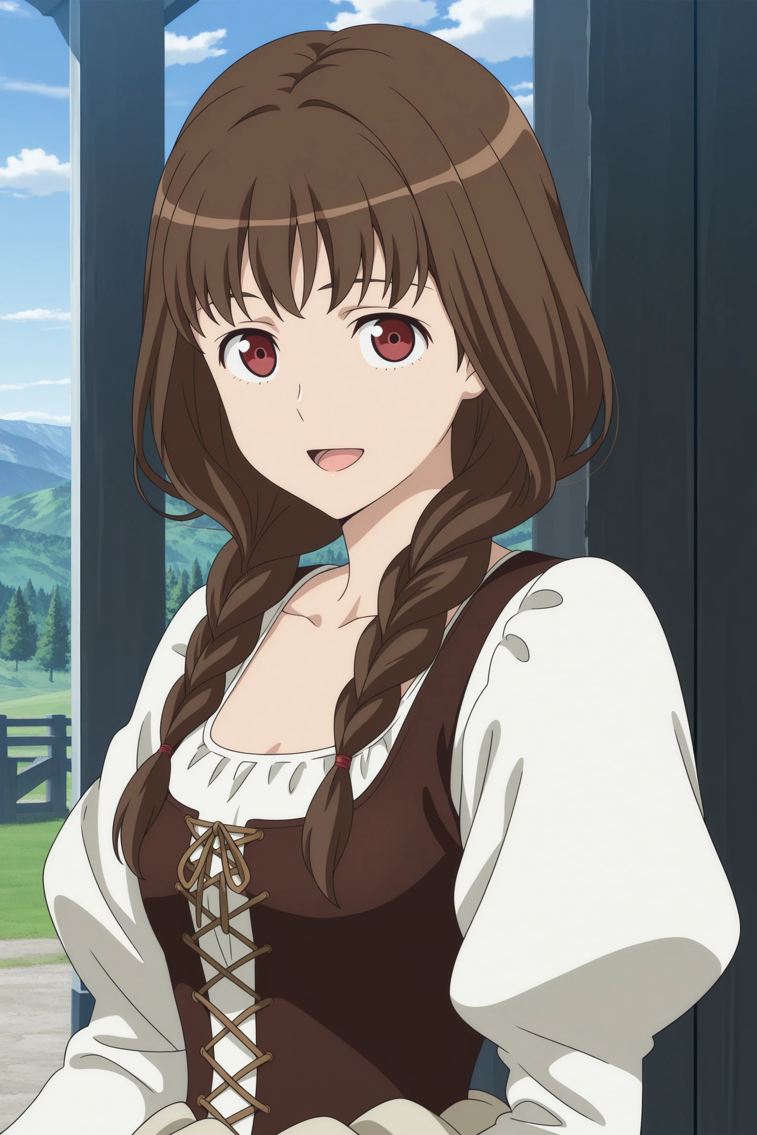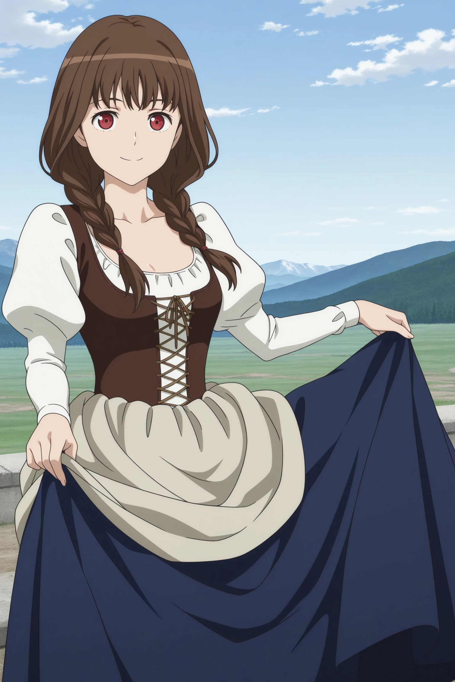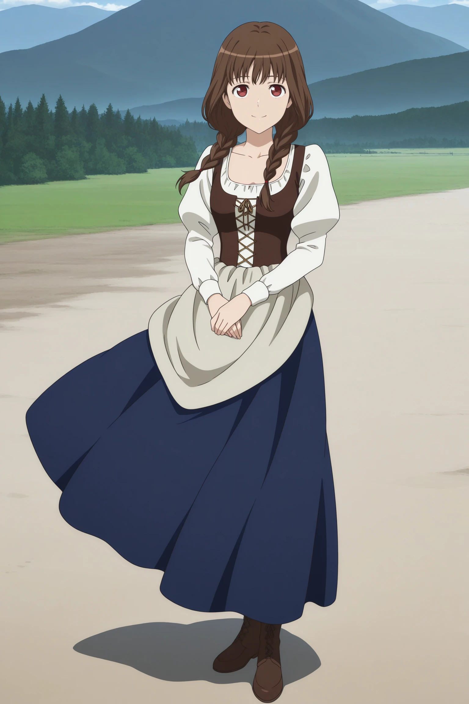 maid ane, long hair, brown hair, twin braids, hair tie, hair over shoulder, wispy bangs, red eyes, dirndl, long sleeves, puffy sleeves, white shirt, brown vest, bodice, blue skirt, long skirt, grey apron
