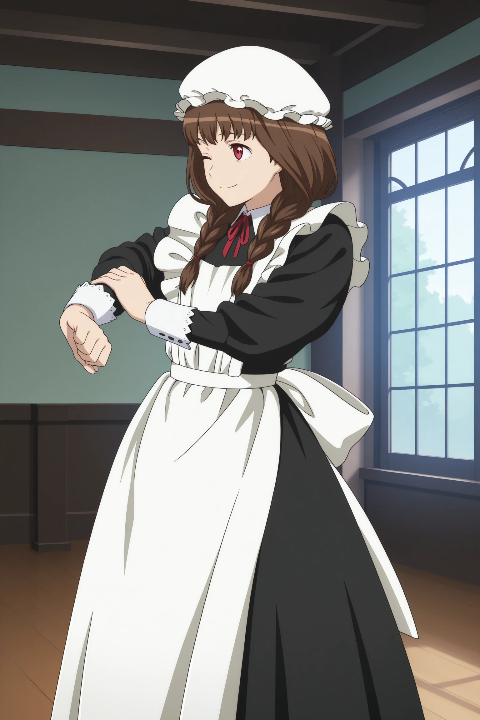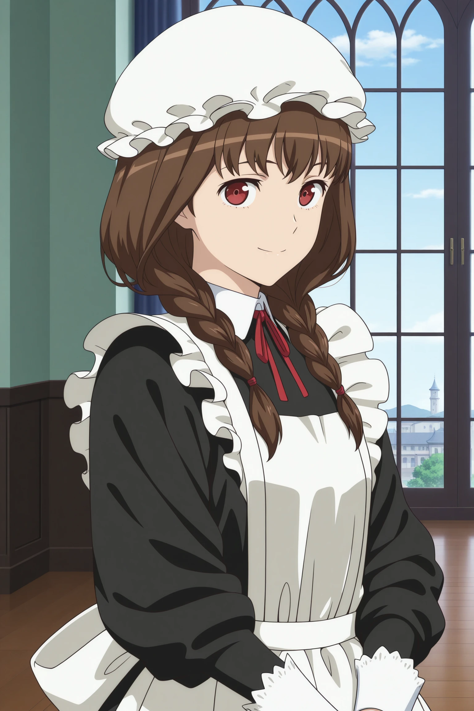 maid ane, long hair, brown hair, twin braids, hair tie, hair over shoulder, mob cap, wispy bangs, red eyes, maid, long sleeves, sleeve cuffs, black dress, long dress, maid apron, neck ribbon, red ribbon, back bow