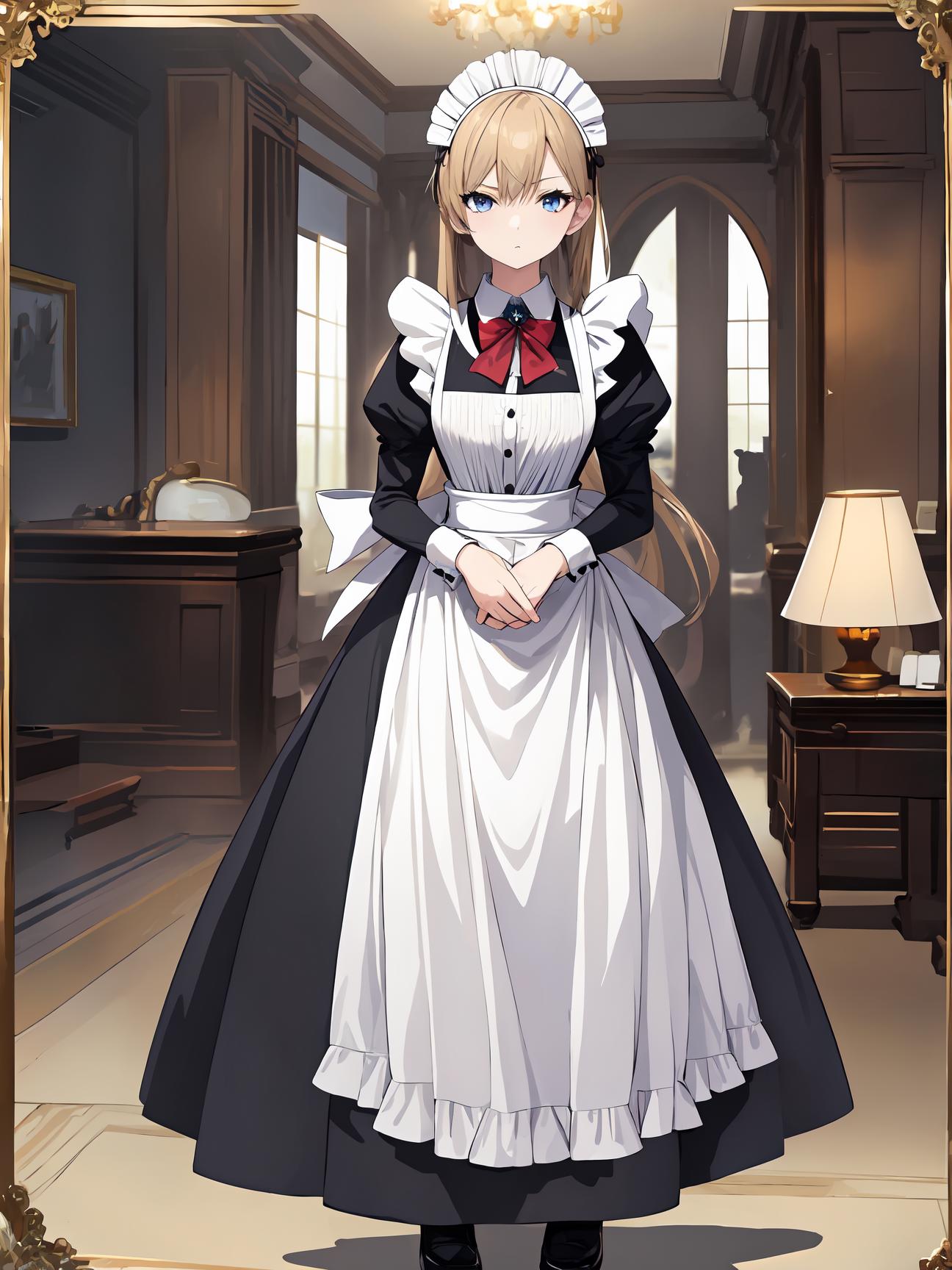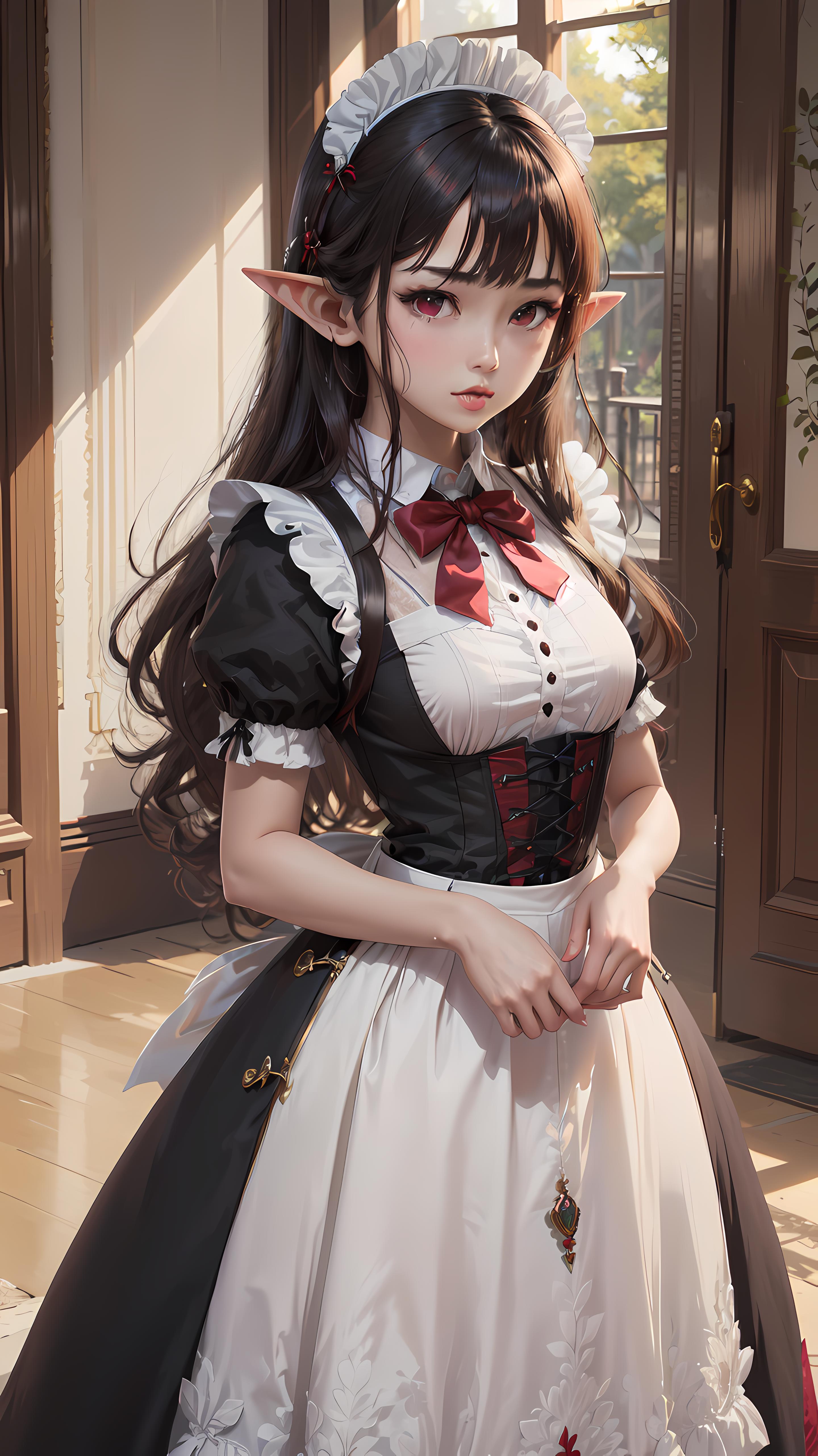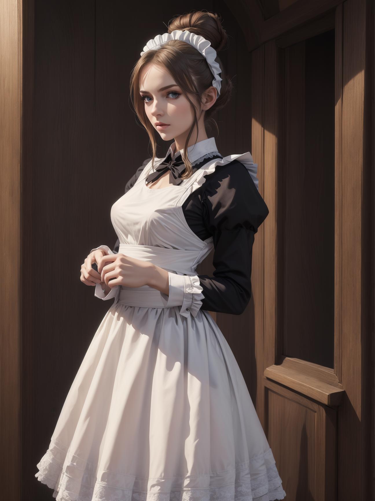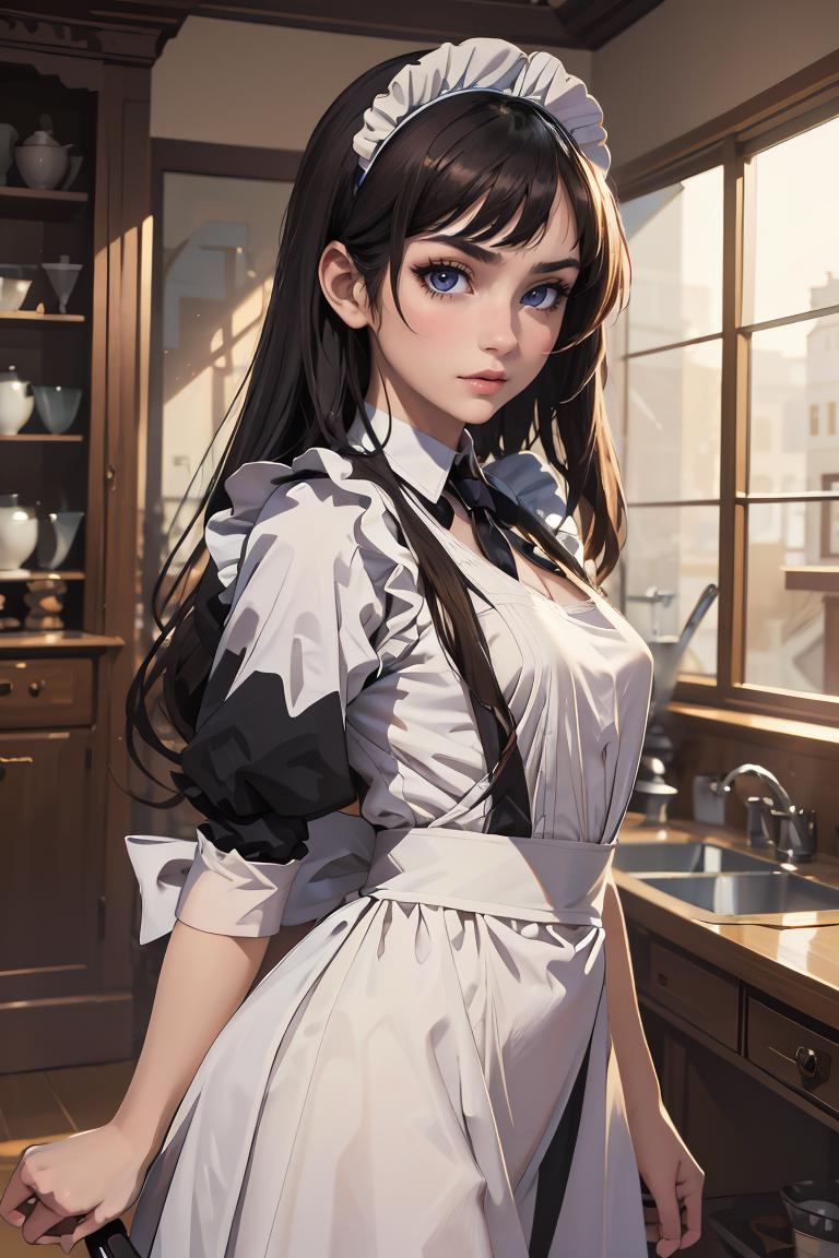 Long, functional aprons feature prominently on this style, but it is not entirely bereft of appeal with puffy sleeves and beautiful brooches, bows and frills. Colors other than black are rare, but not unheard of.