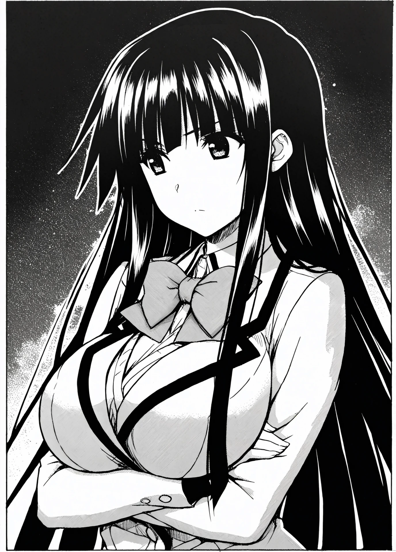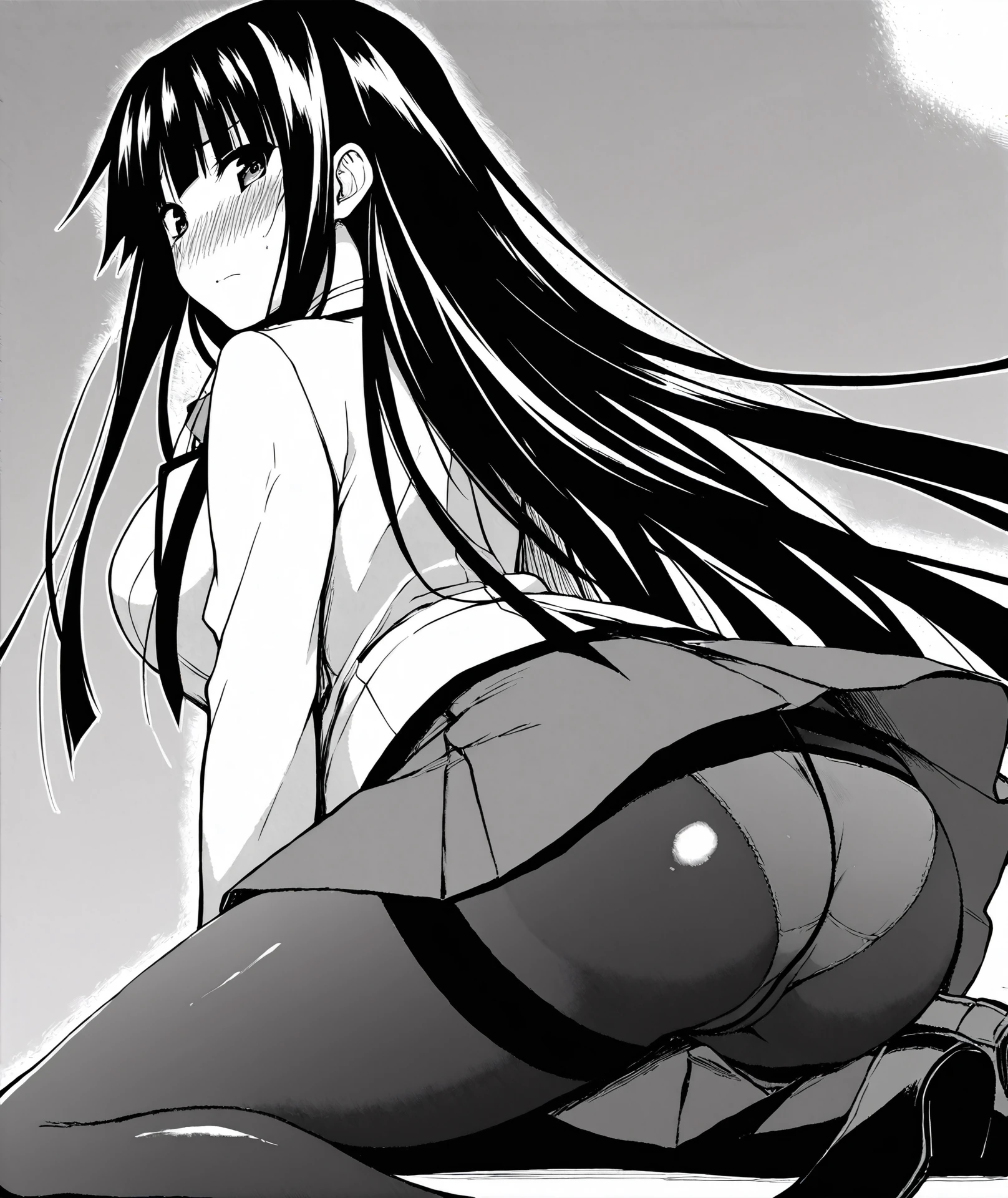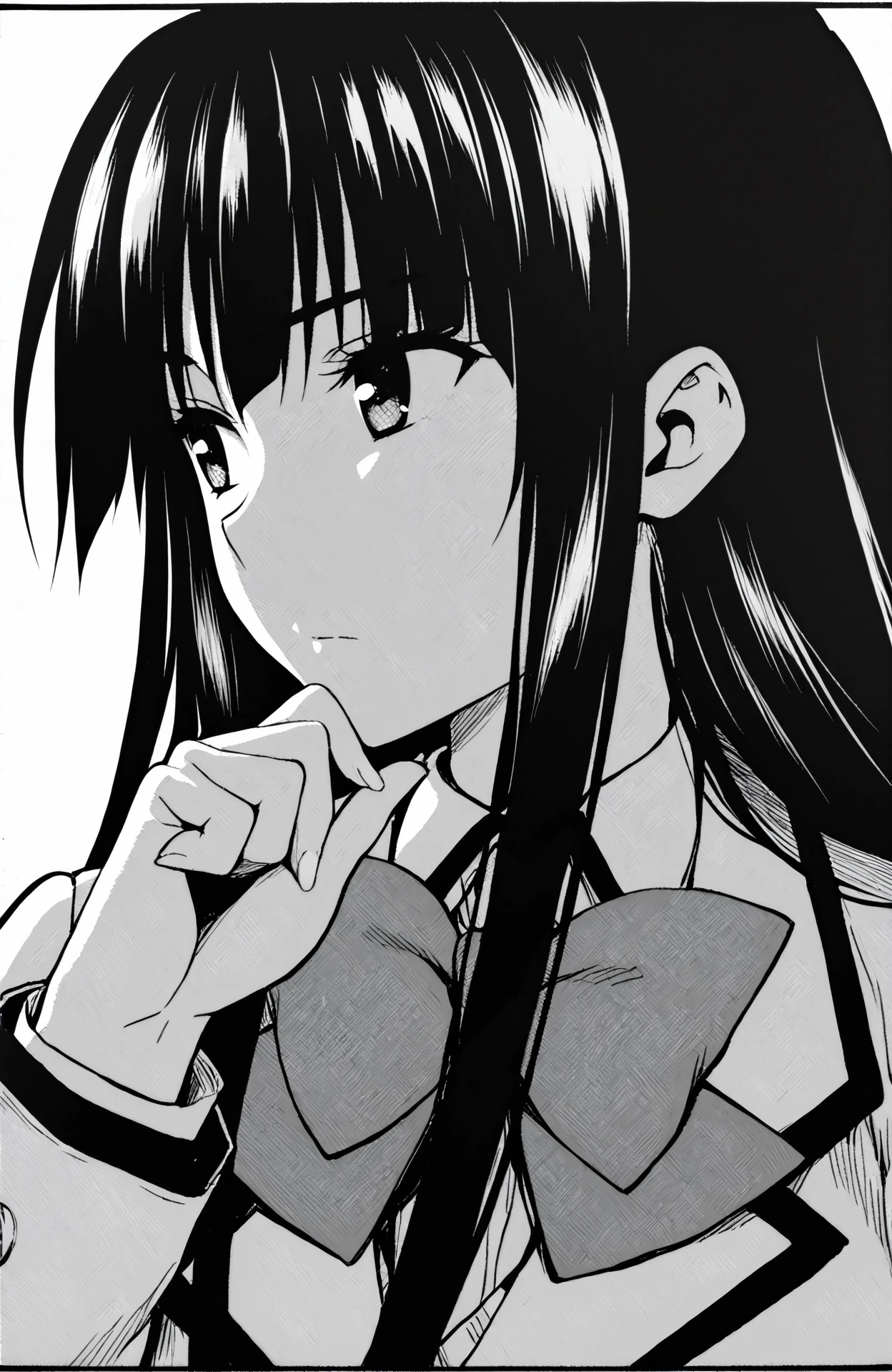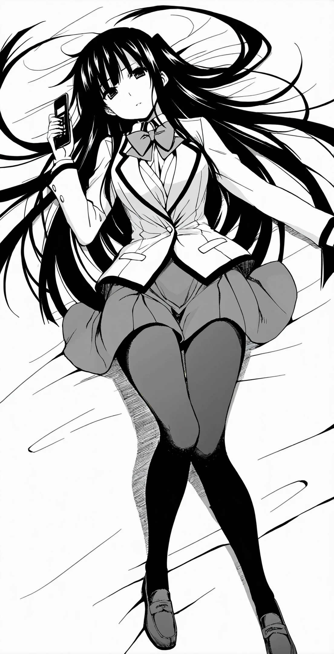 1girl, monochrome, greyscale, solo, long hair, pantyhose, school uniform, skirt, bow,jacket,