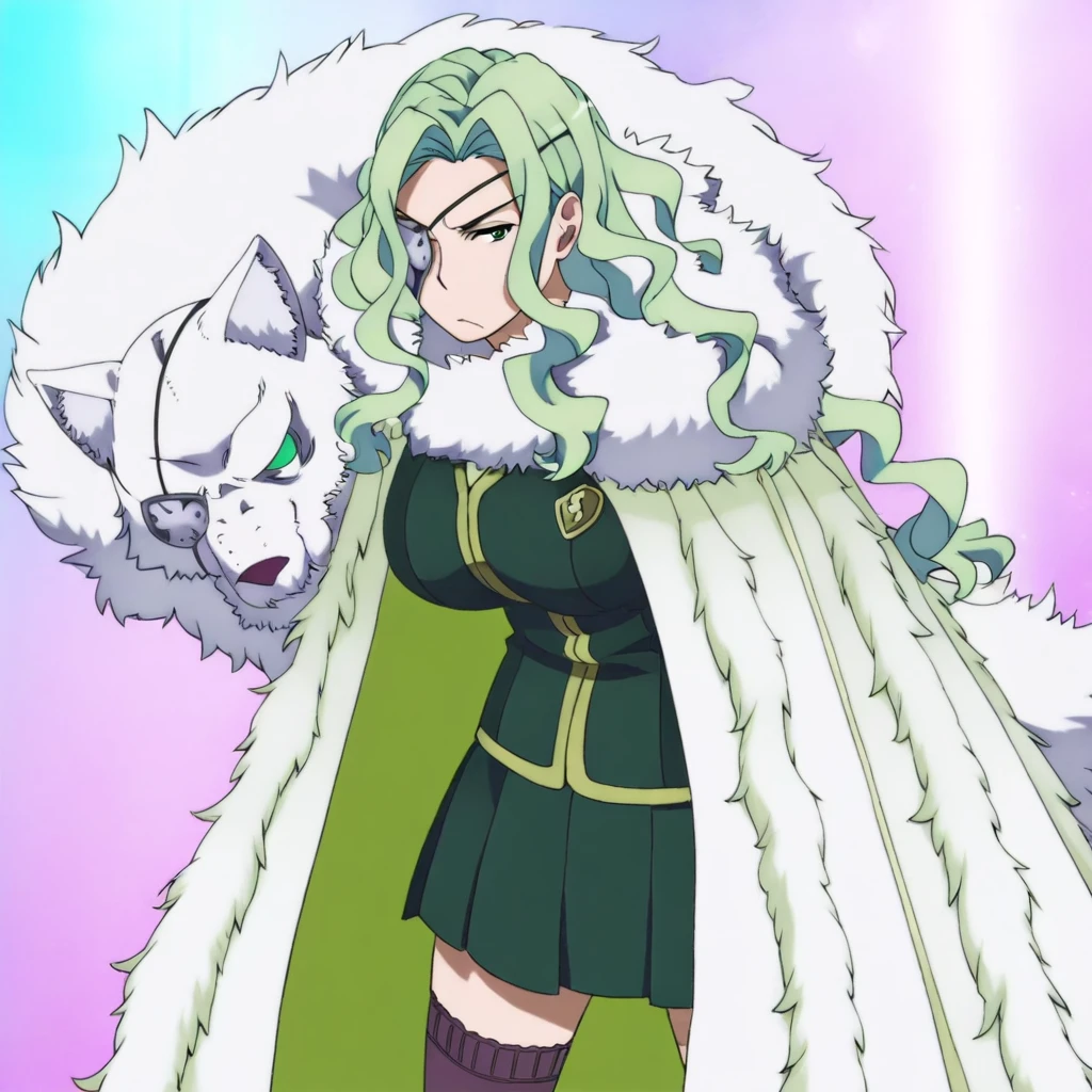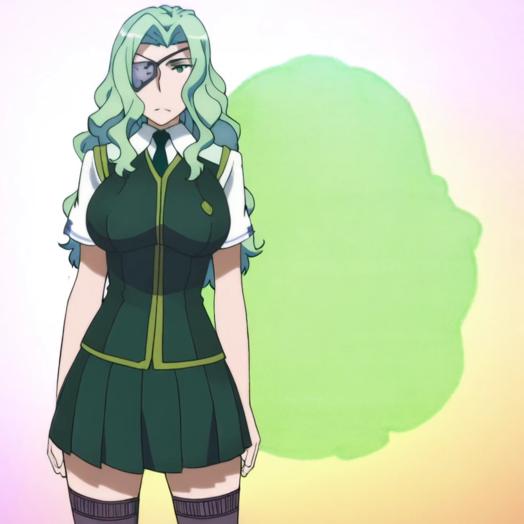 mei menowa (character), green hair, eyepatch, long hair, green eyes, large breasts, wavy hair,
