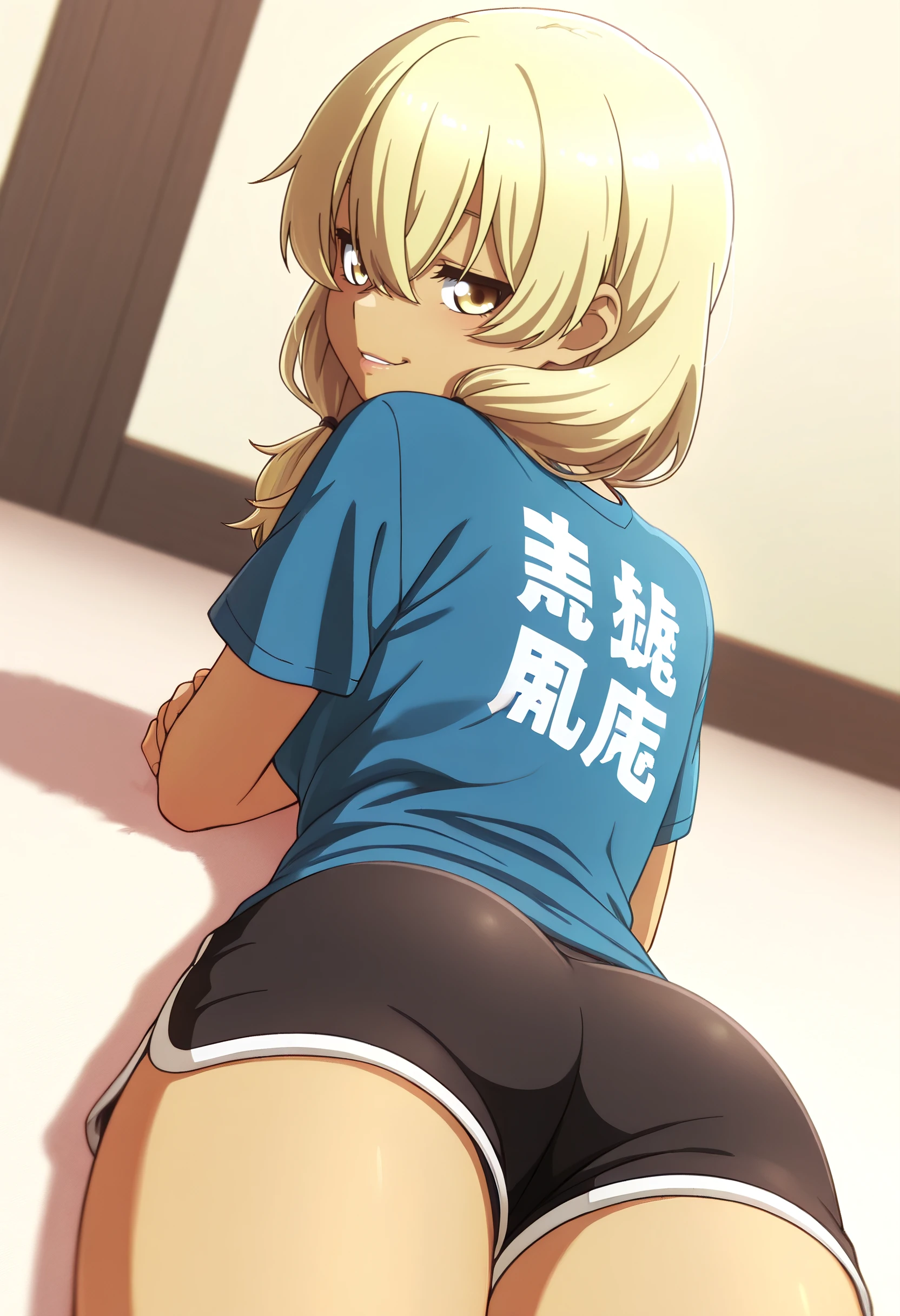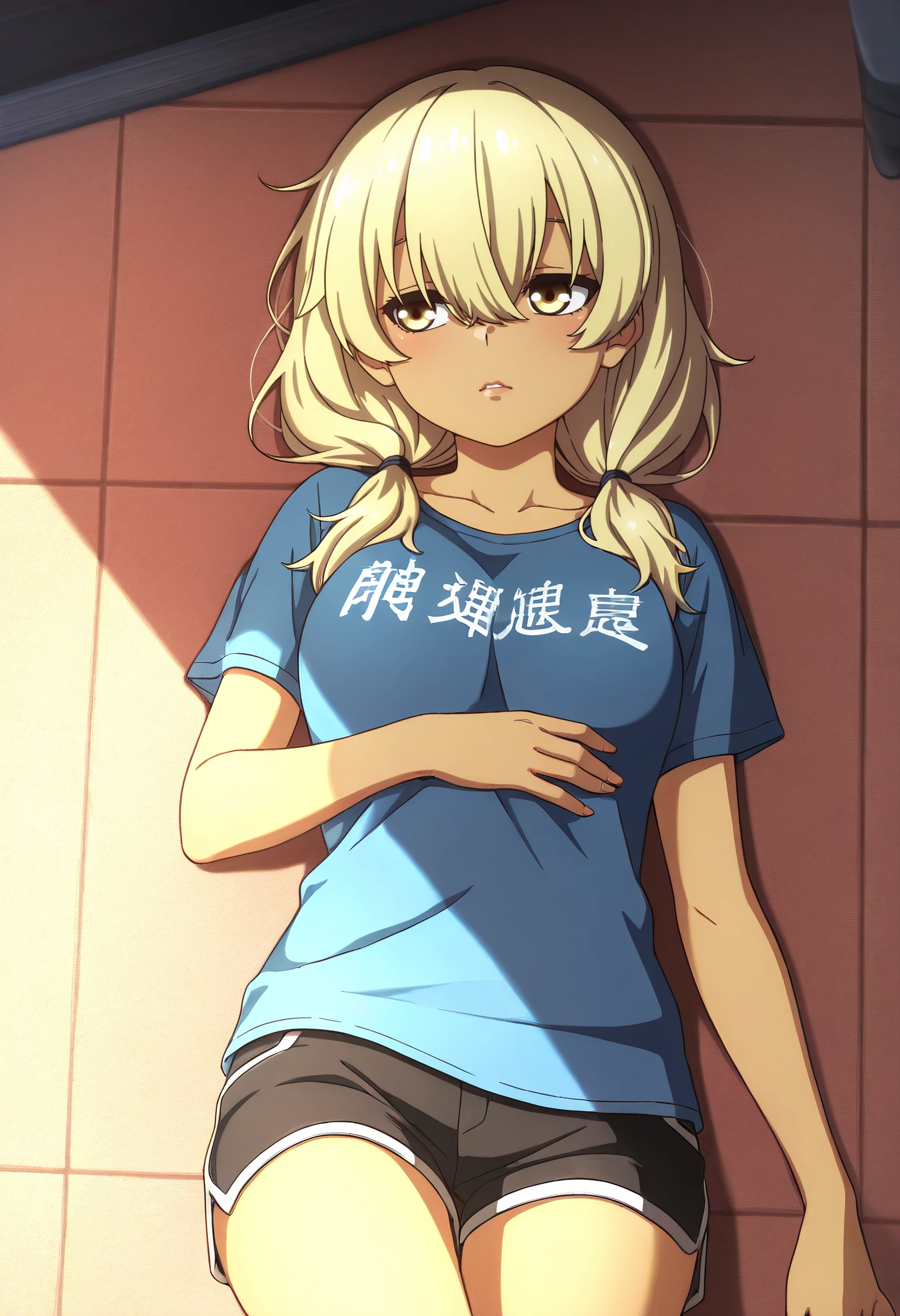 KanaShirtB, shirt, blue shirt, t-shirt, short sleeves, clothes writing, casual, print shirt, low twintails, twintails, short twintails, hair over shoulder, crossed bangs, hair tie, short shorts, shorts, black shorts,