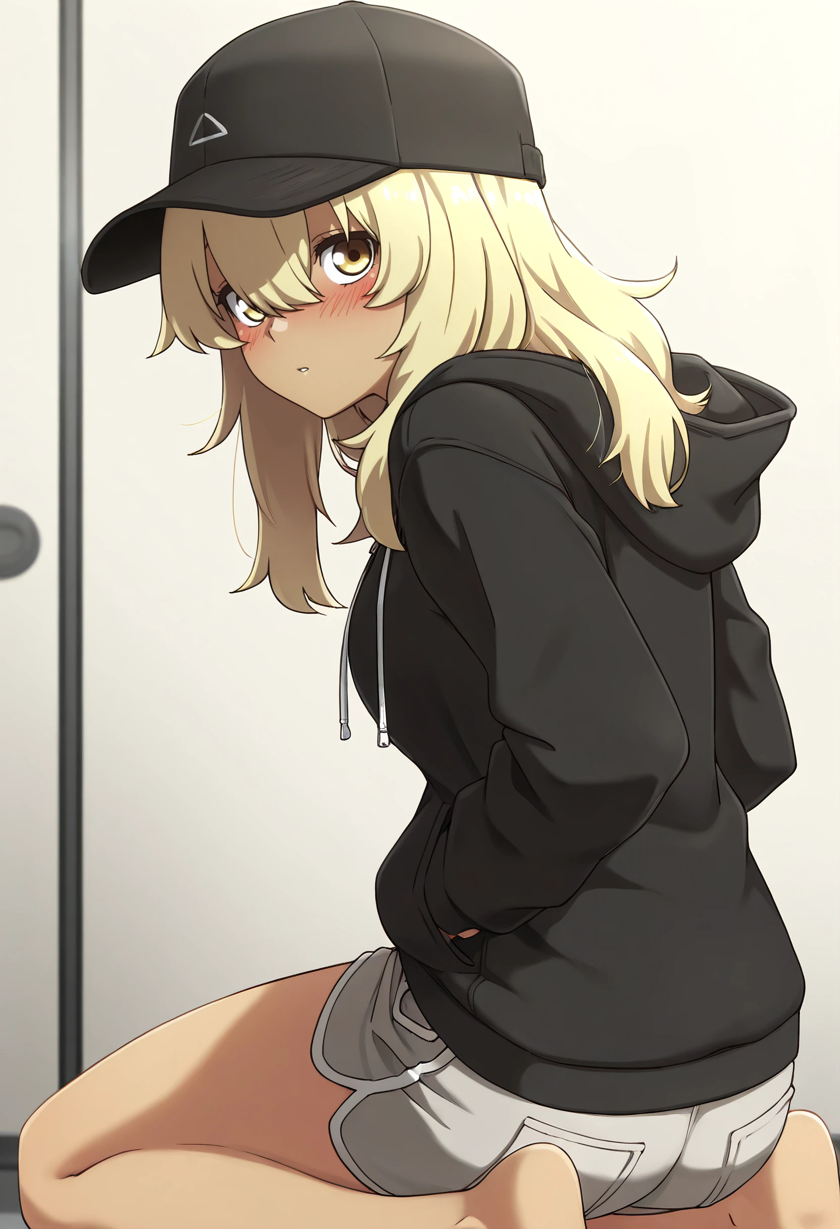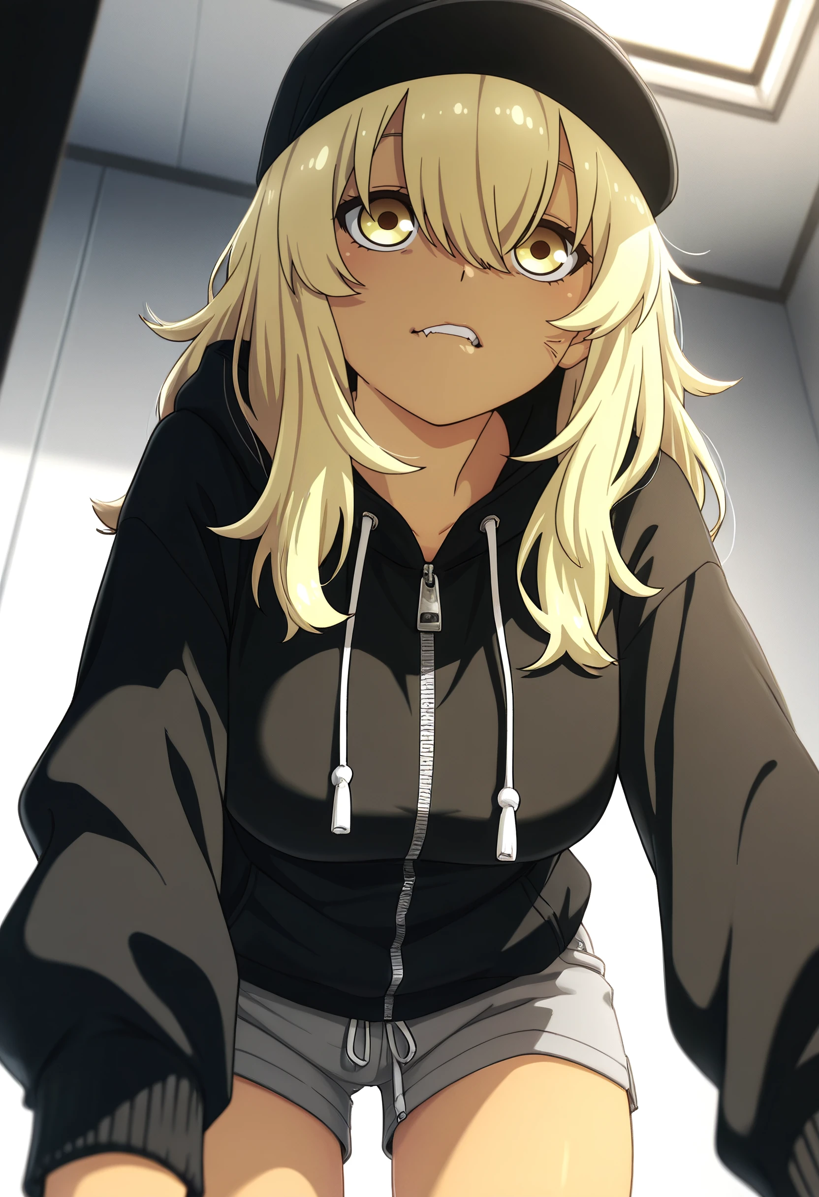 KanaHoodie, jacket, long sleeves, hood, hoodie, hood down, hat, zipper, baseball cap, zipper pull tab, hooded jacket, black jacket, drawstring, shorts, short shorts, grey shorts, black hat, black hoodie, casual,