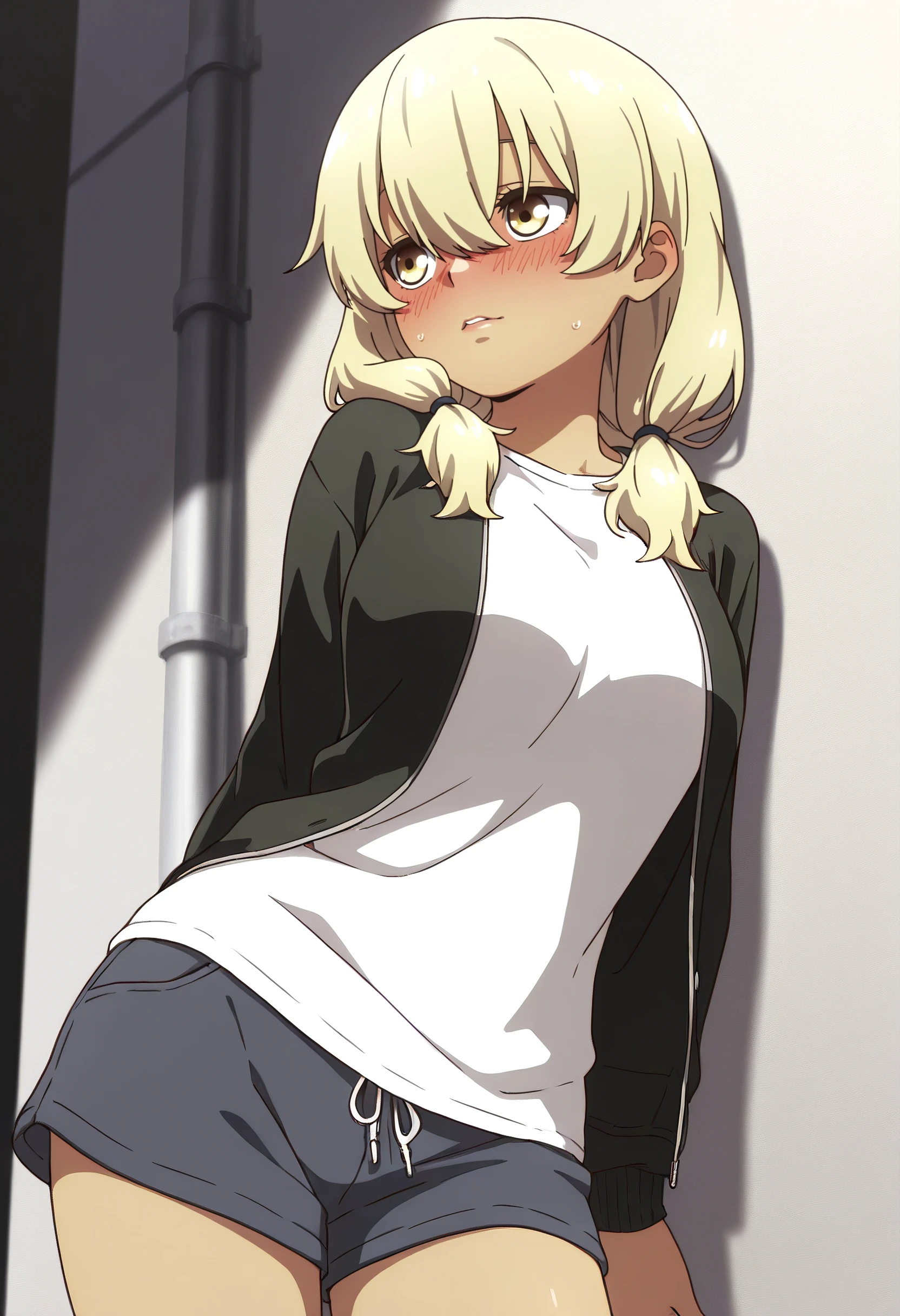 KanaJacket, shirt, twintails, low twintails, white shirt, jacket, open clothes, open jacket, hair over shoulder, long sleeves, short twintails, black jacket, raglan sleeves, casual, hair tie, shorts,