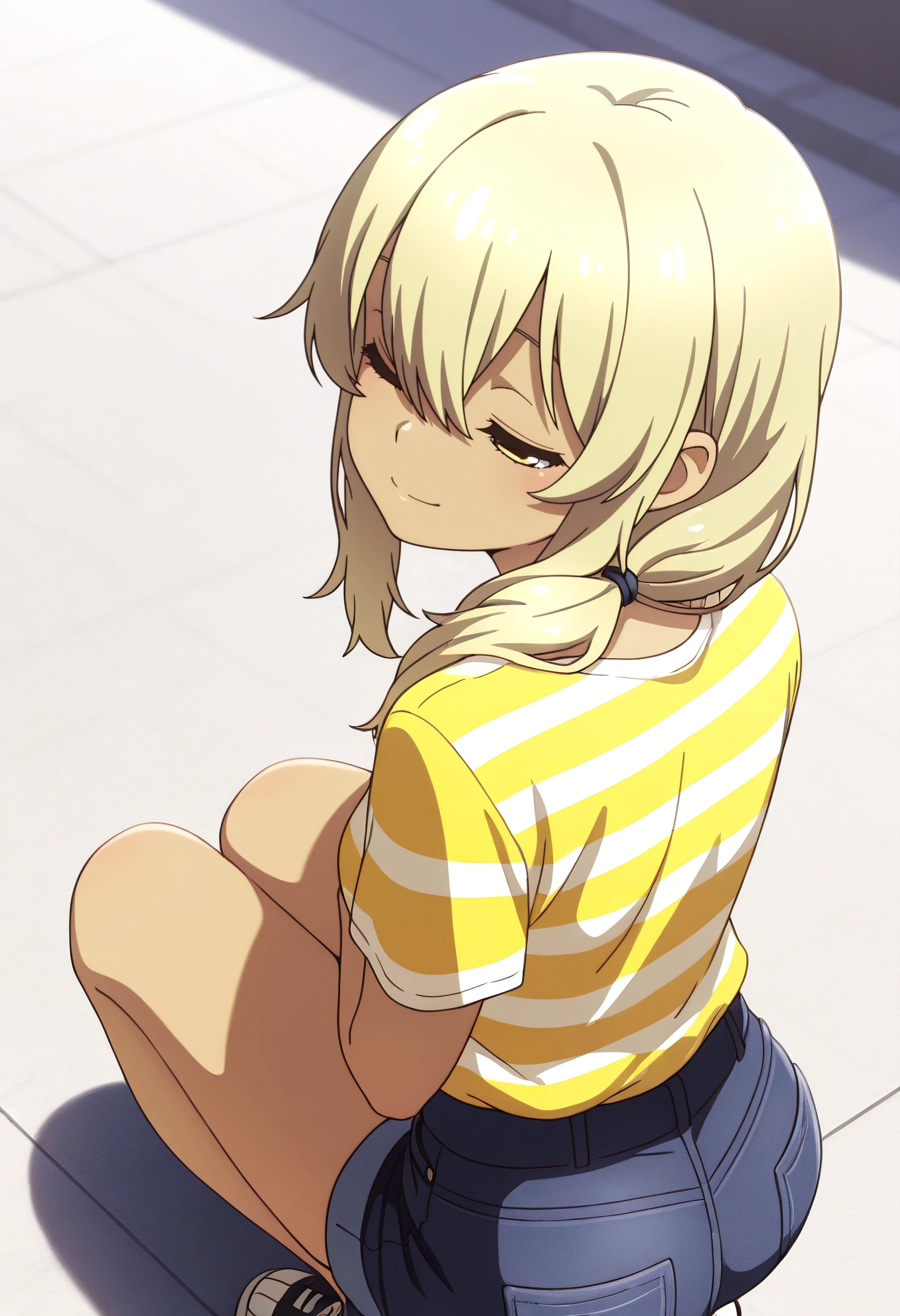KanaStriped, striped shirt, striped clothes, shirt, hair over shoulder, t-shirt, white shirt, short sleeves, yellow shirt, low ponytail, ponytail, denim, casual, hair tie, two-tone shirt, shirt tucked in, blue shorts, denim shorts,