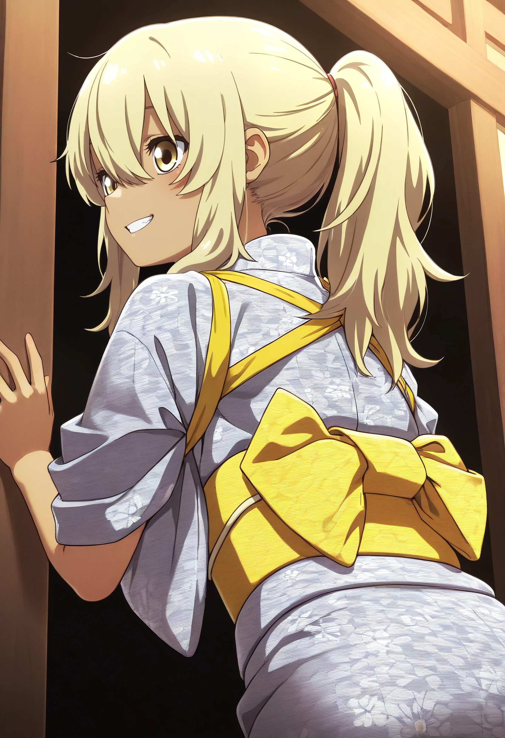 KanaKimono, japanese clothes, kimono, yukata, ponytail, tasuki, grey kimono, sleeveless, blue kimono, sleeveless kimono, sash, obi, print kimono, sleeves rolled up, yellow sash, unmoving pattern, short kimono,