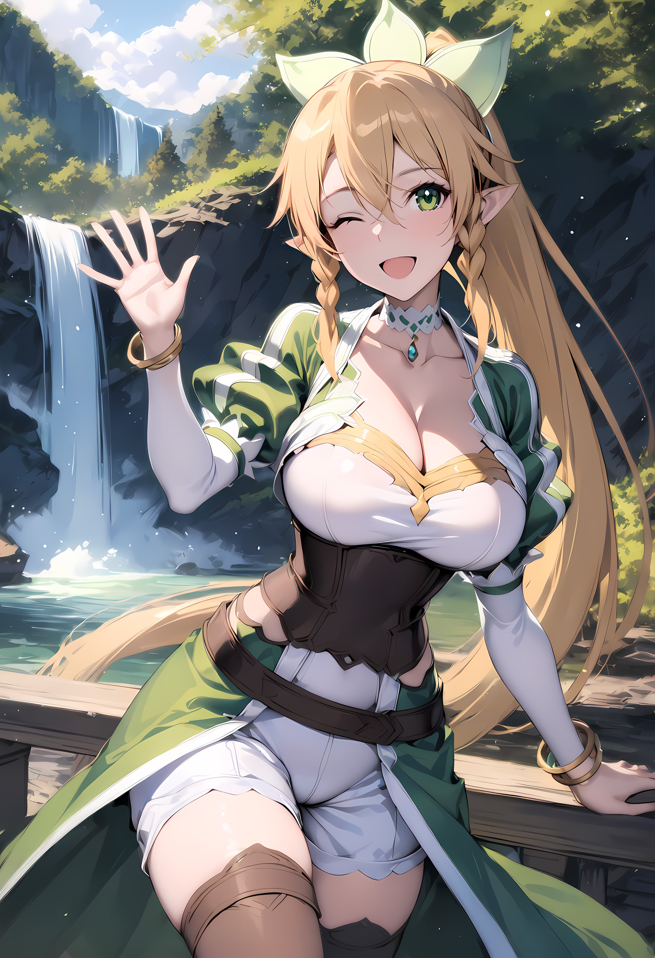 leafaalo,1girl,blonde hair, long hair, pointy ears, ponytail,braid, twin braids, green eyes, cleavage, hair between eyes, large breasts, elf, collarbone, very long hair, jewelry, hair ornament, high ponytail,