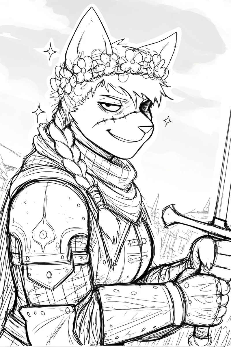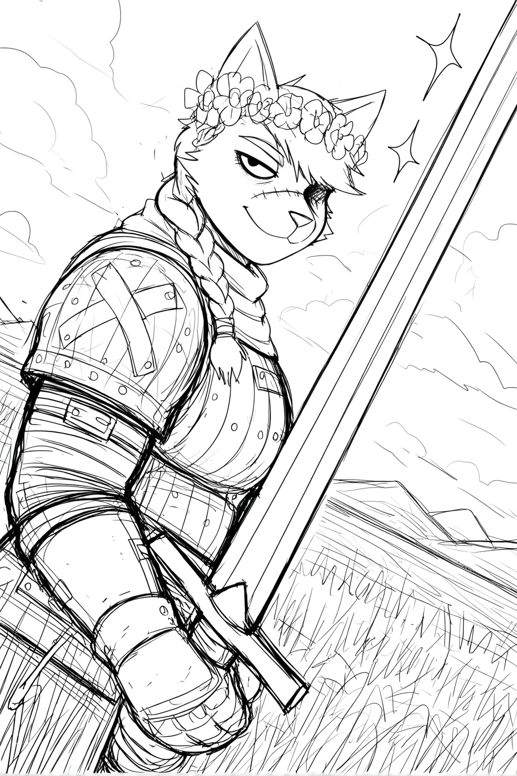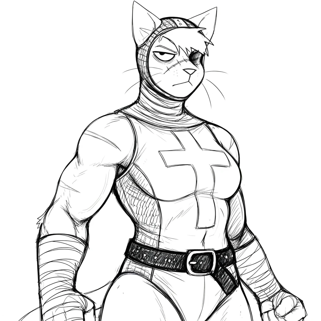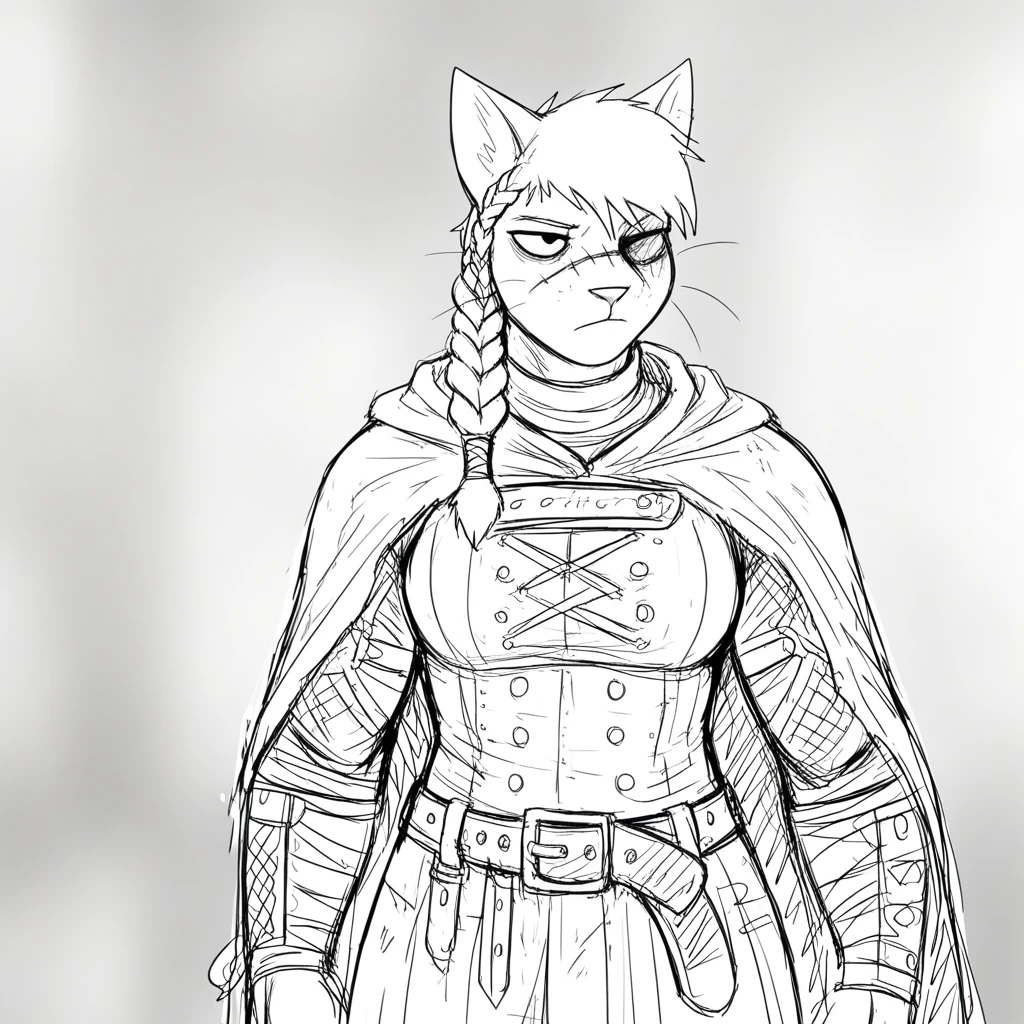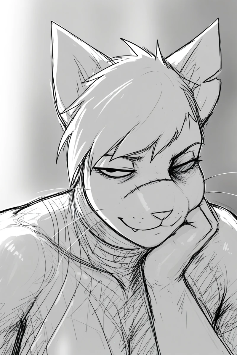 hl4diln1k_kn1ght-c4t, monochrome, light theme, sketch, solo, female, anthro, feline, domestic cat, animal ears, short hair, swept bangs, missing eye, asymmetrical face, facial scar, athletic female, philtrum, mouth closed, whiskers, 5 fingers,