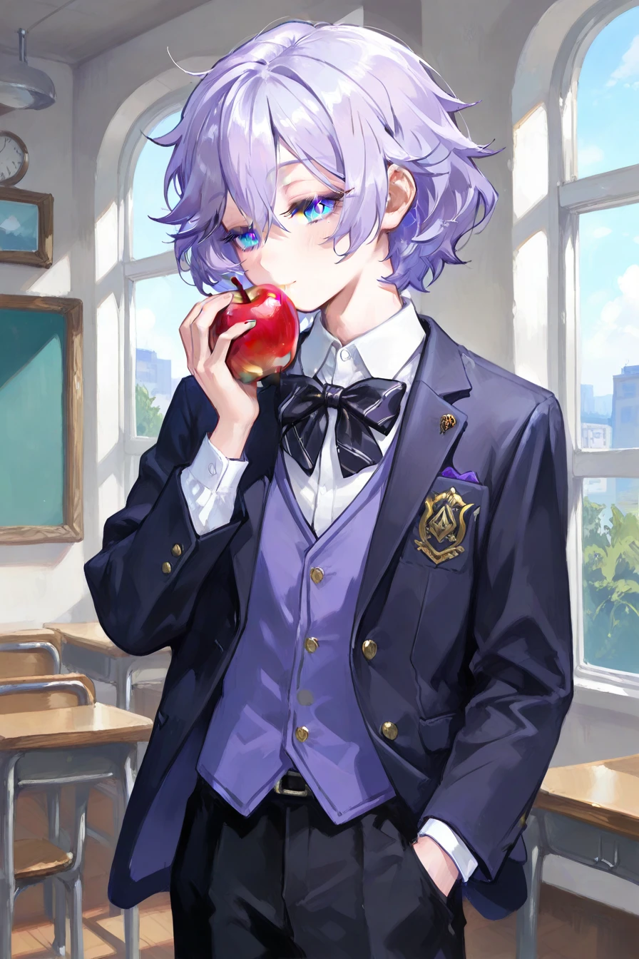For school uniform: wearing a male school uniform, black stripped bowtie, white shirt, purple vest, black blazer, open blazer, black pants, black male shoes,