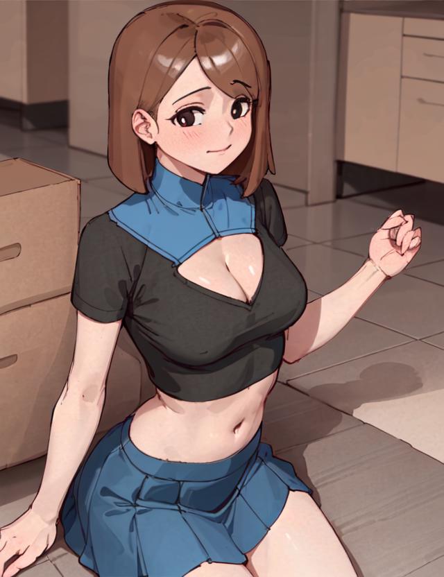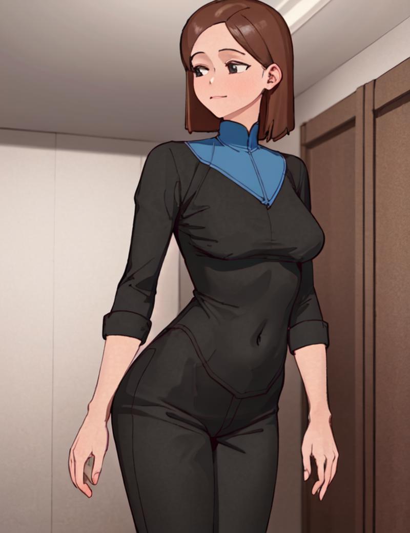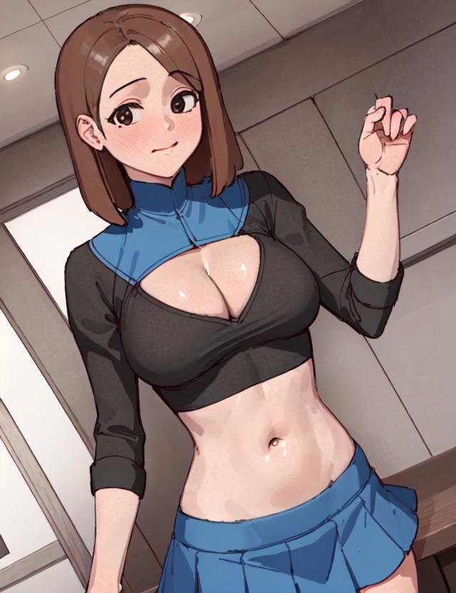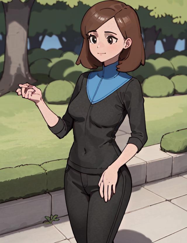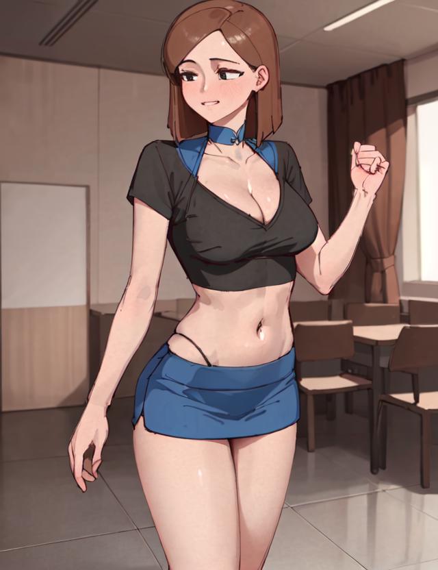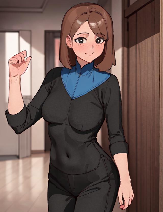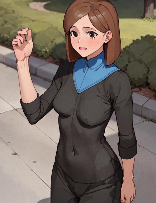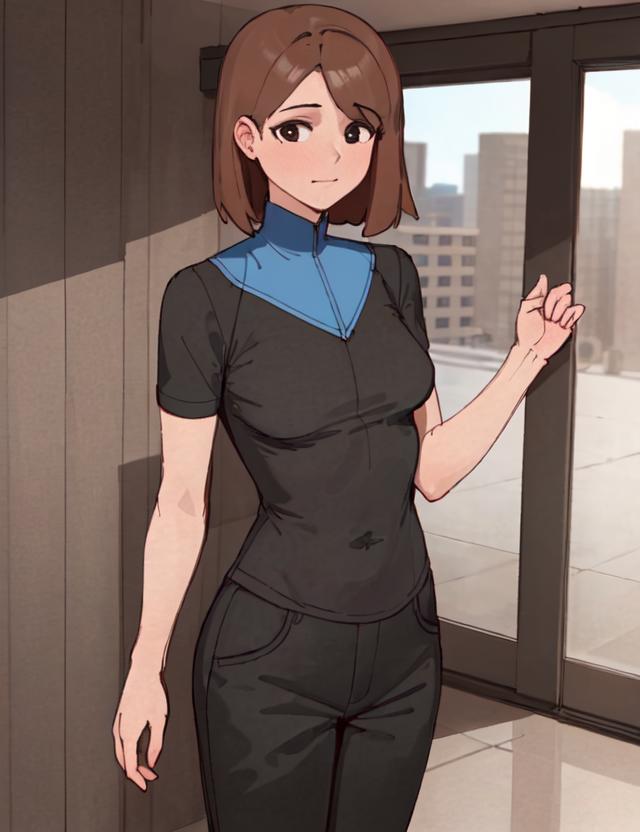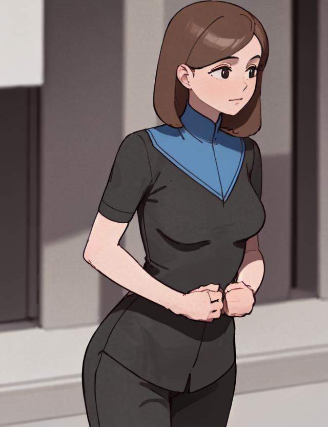 If you want to change her outfit put black shirt, black pants in negative.