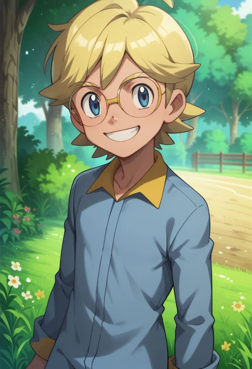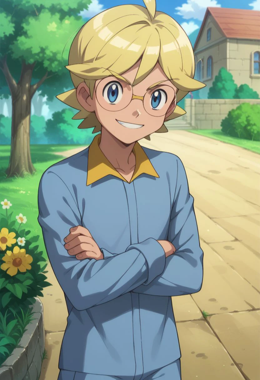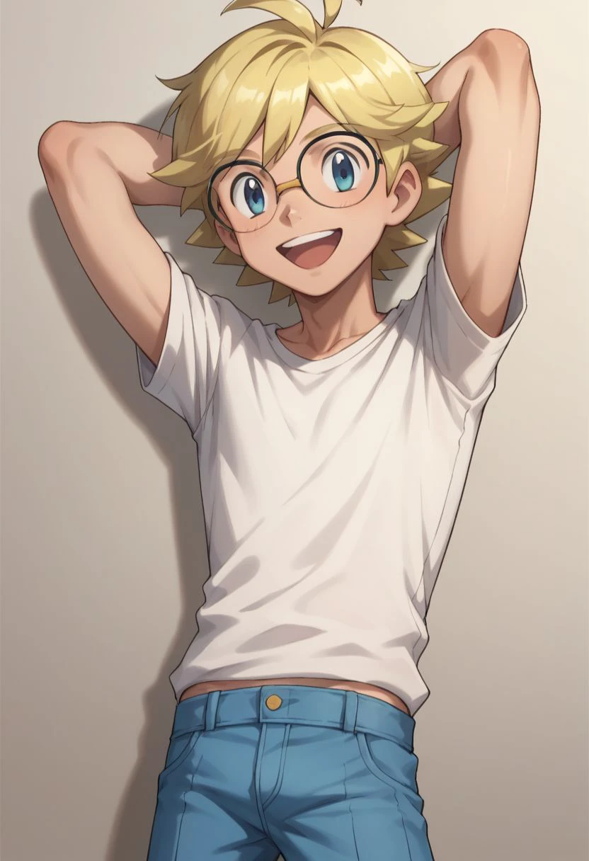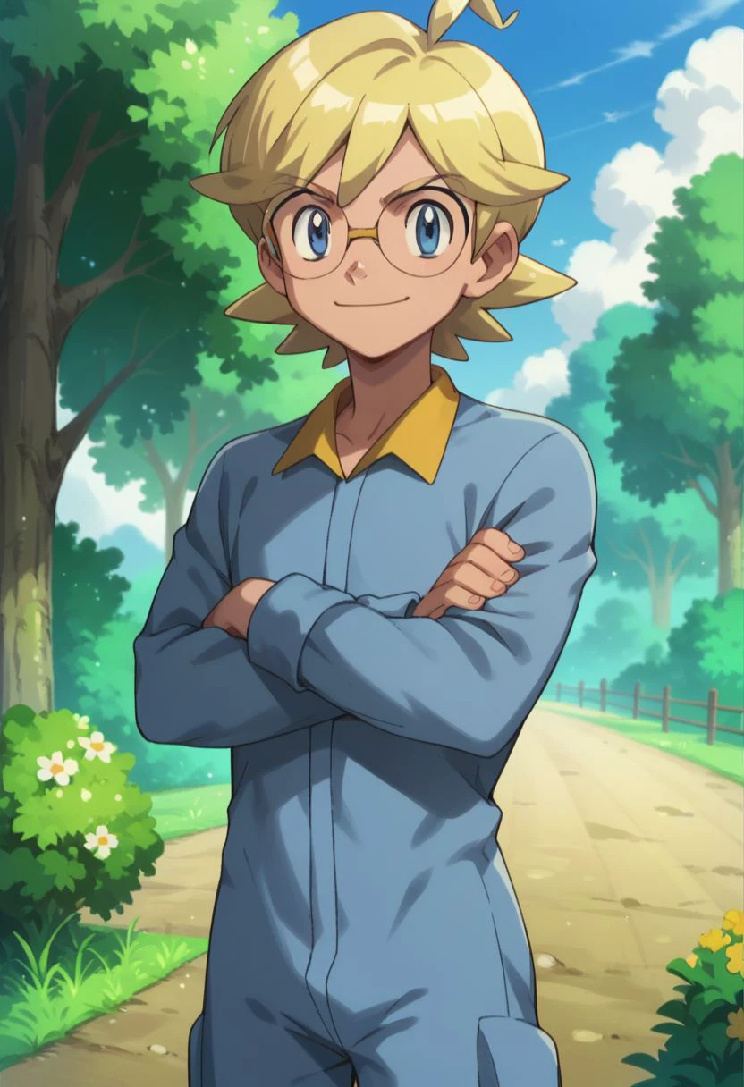 clem_2, 1boy, blonde hair, male focus, glasses, blue eyes, jumpsuit,
