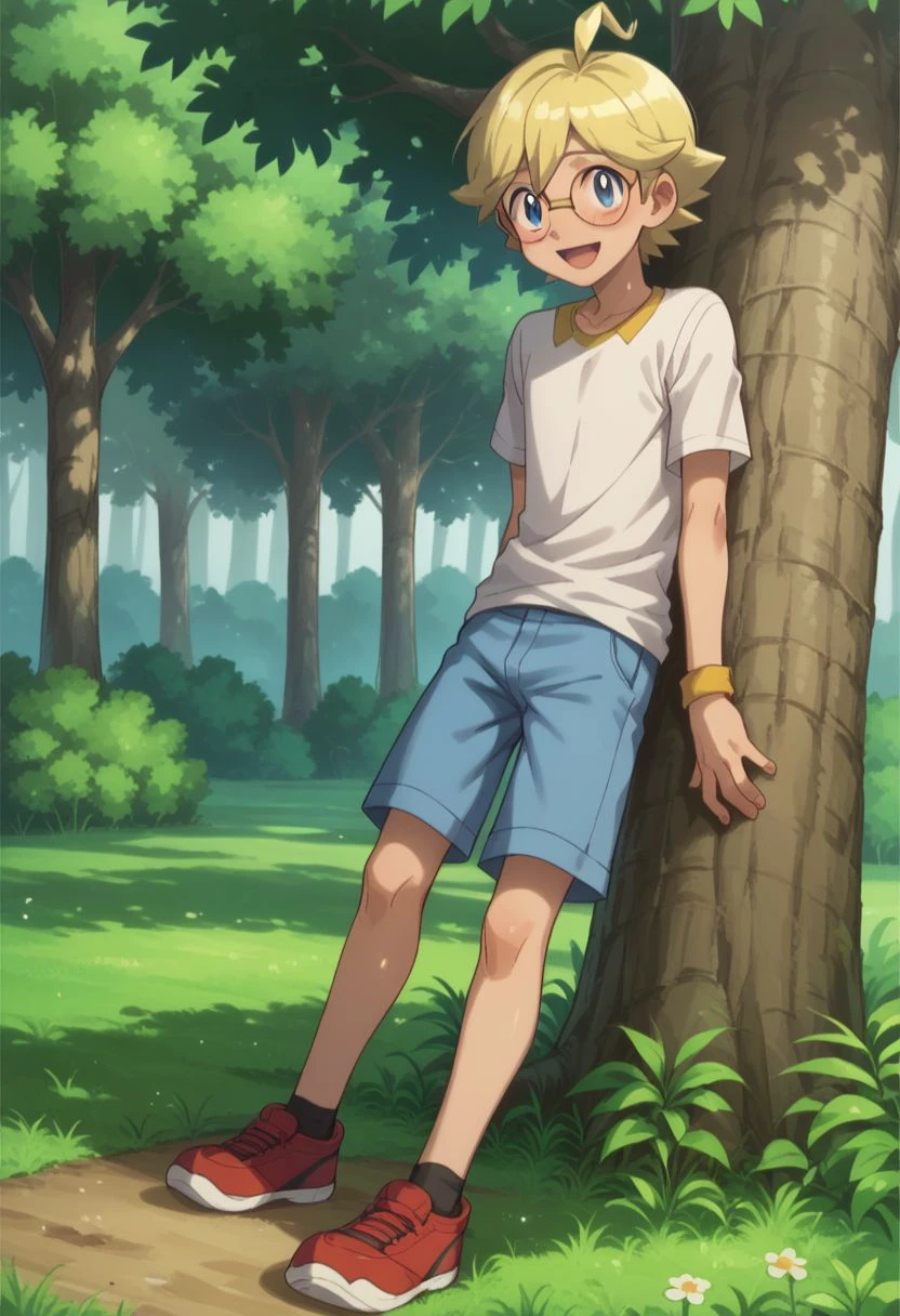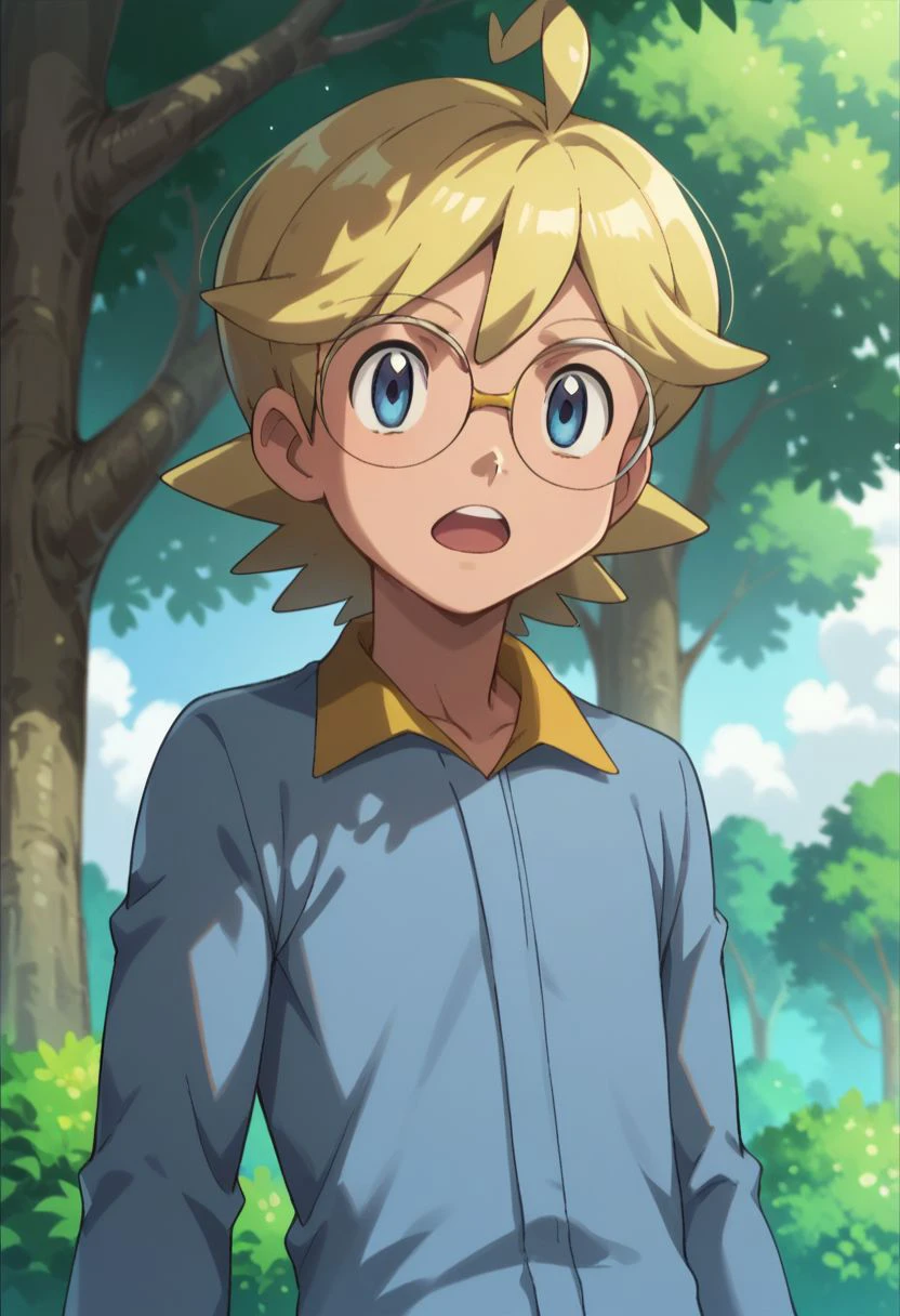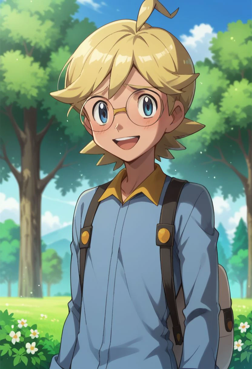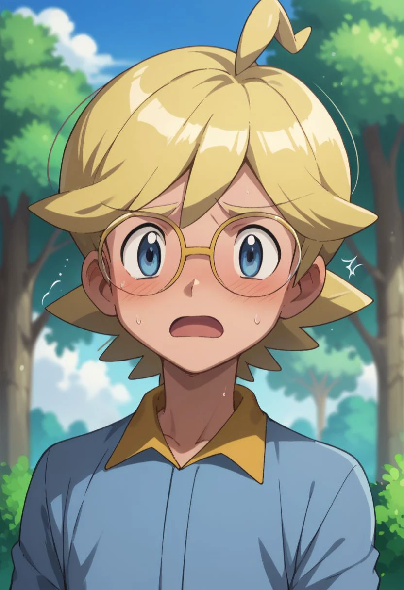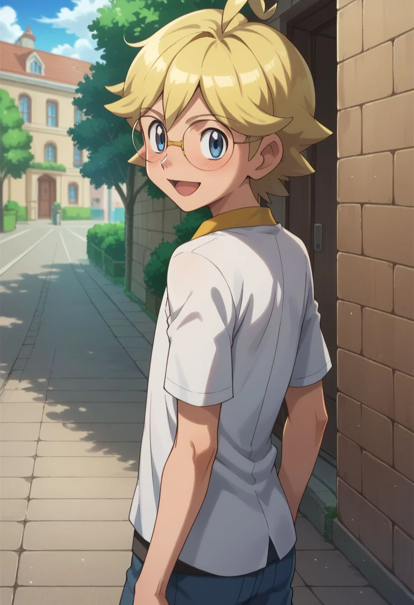 clem_2, 1boy, blonde hair, male focus, glasses, blue eyes, jumpsuit,
