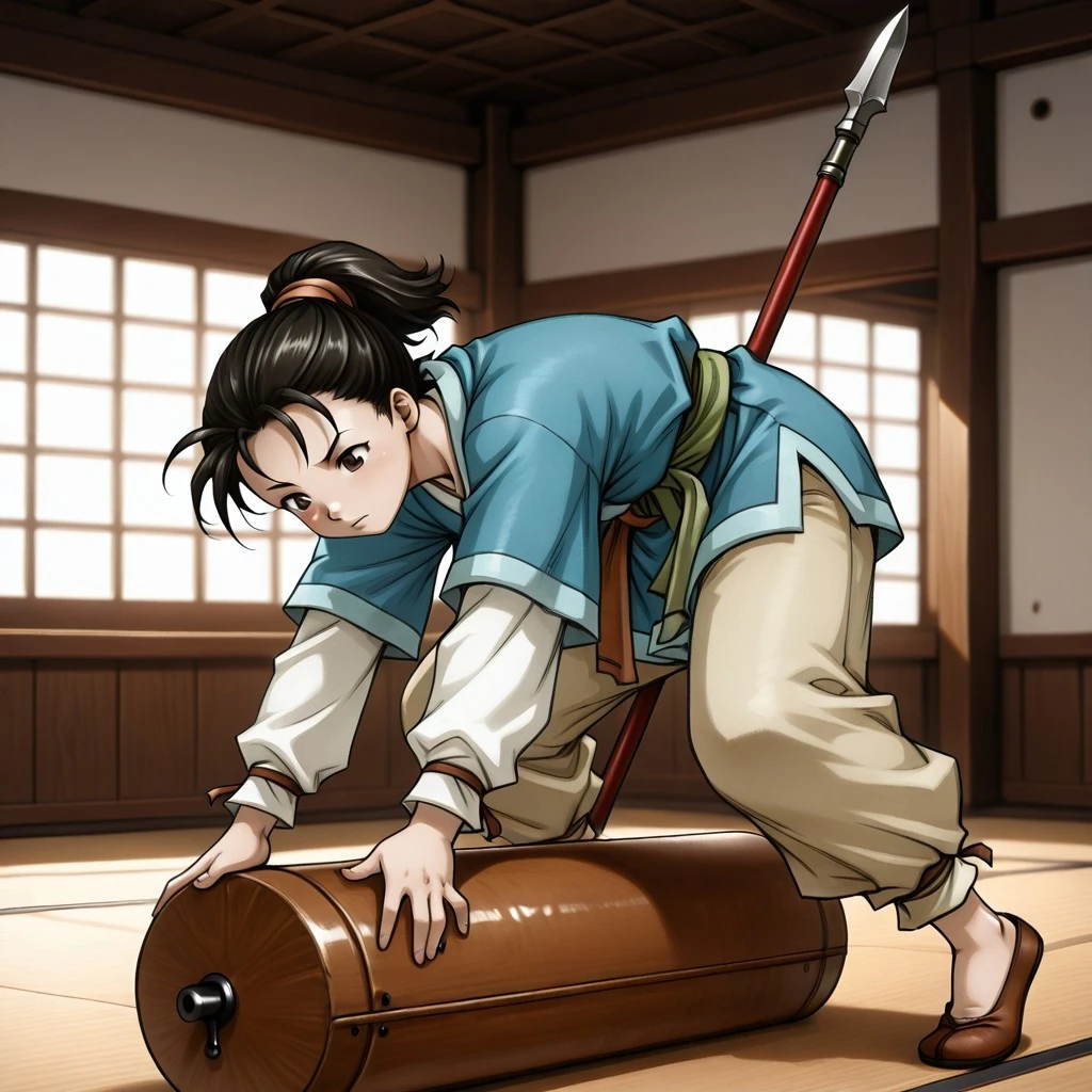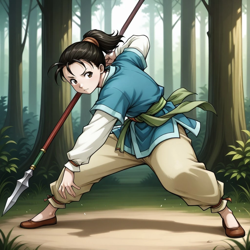 masterwork, masterpiece, best quality, highres, very aesthetic, Tomo (Suikoden), young girl, short black hair, ponytail, brown eyes, youthful face, blue kimono top, white undershirt, light blue robe, green sash, brown belt, beige pants, rolled-up pants, brown flats, wooden staff