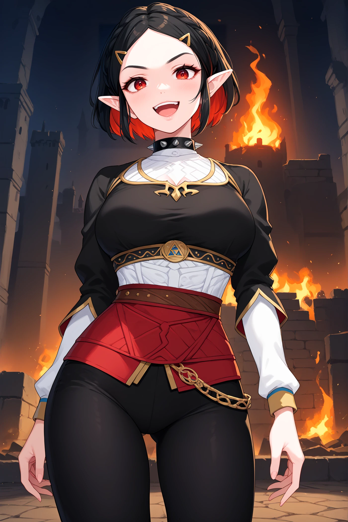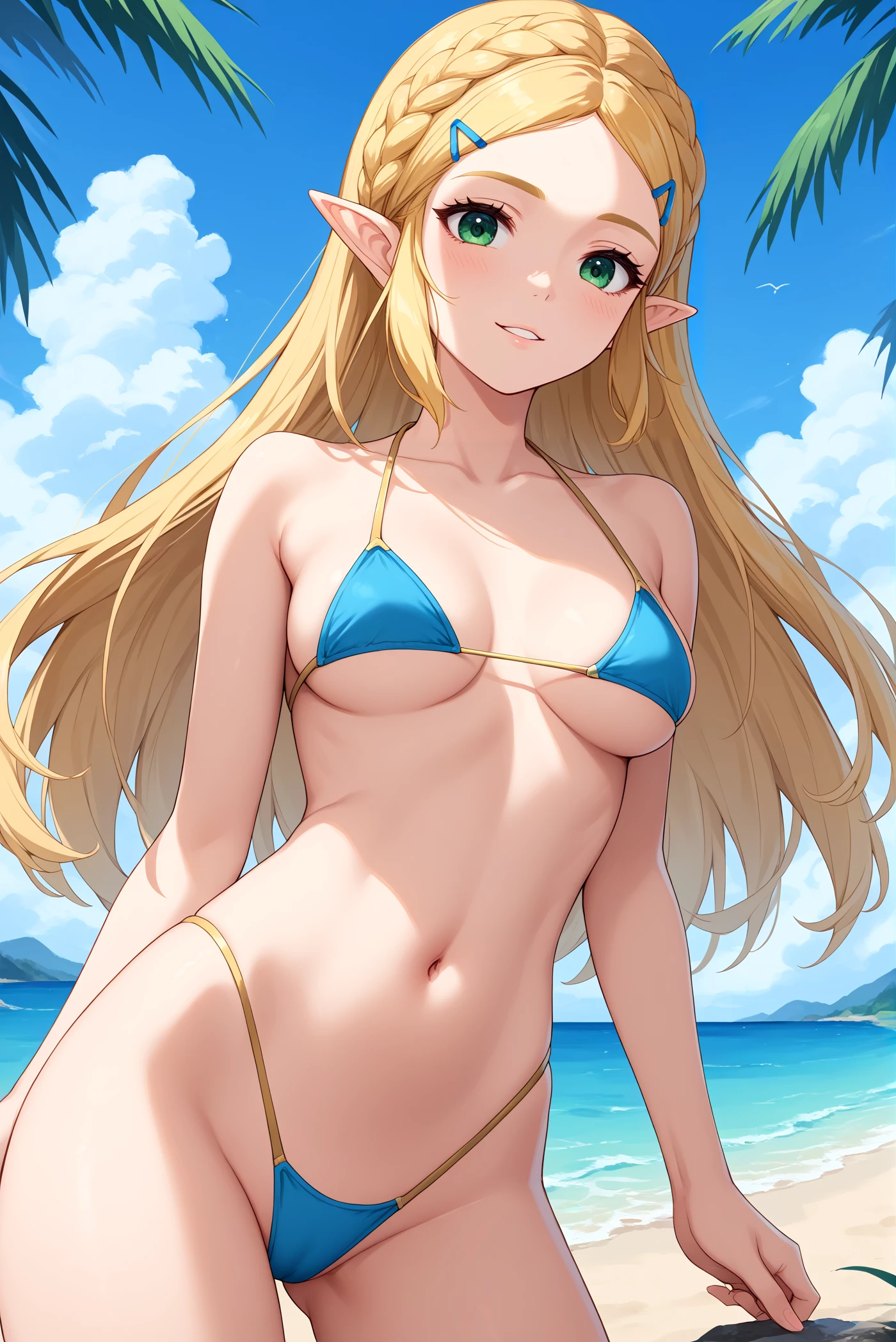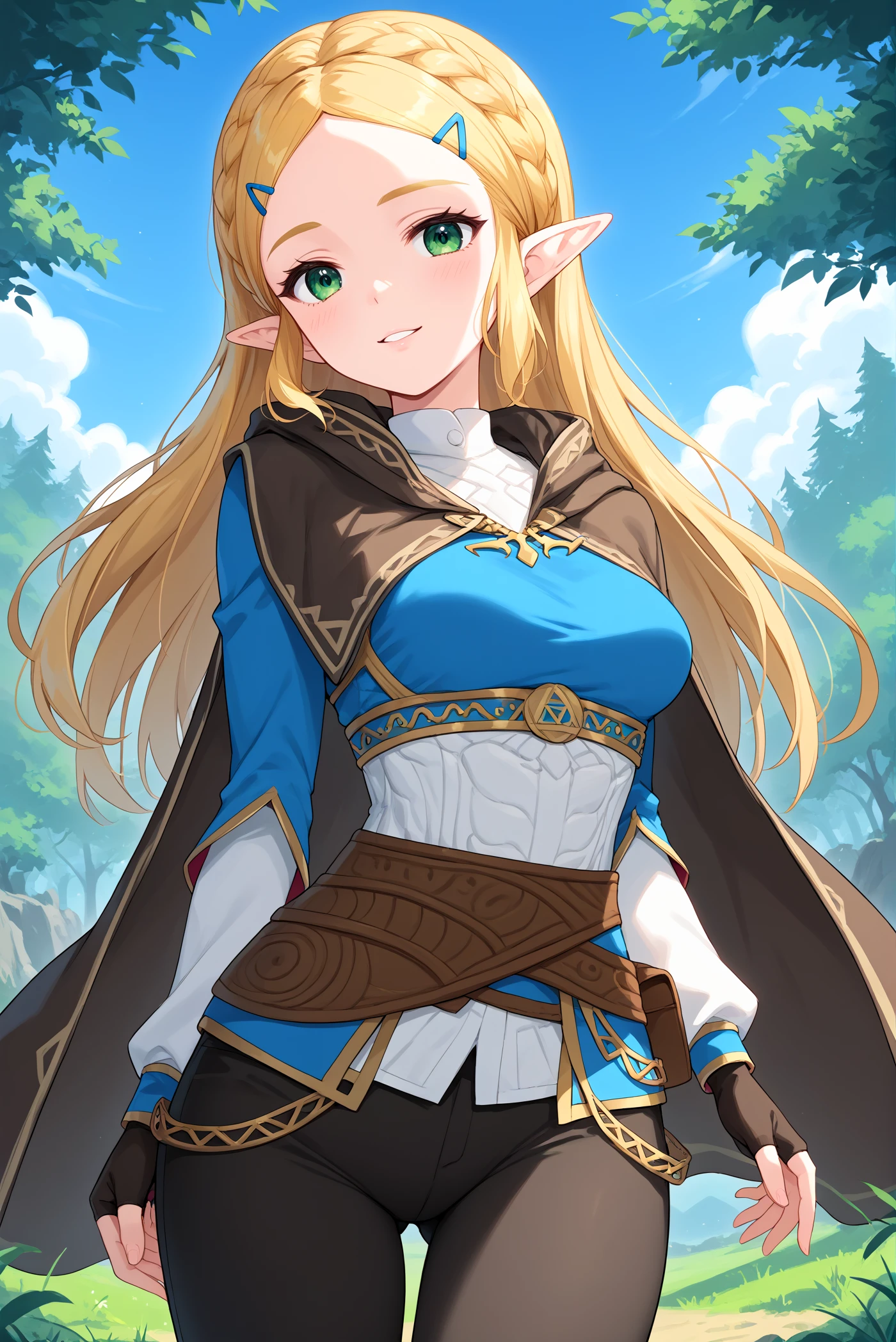 Base prompt: z3ld4, blonde hair, short hair, pointy ears, hair ornament, hairclip, crown braid, green eyes, parted bangs,