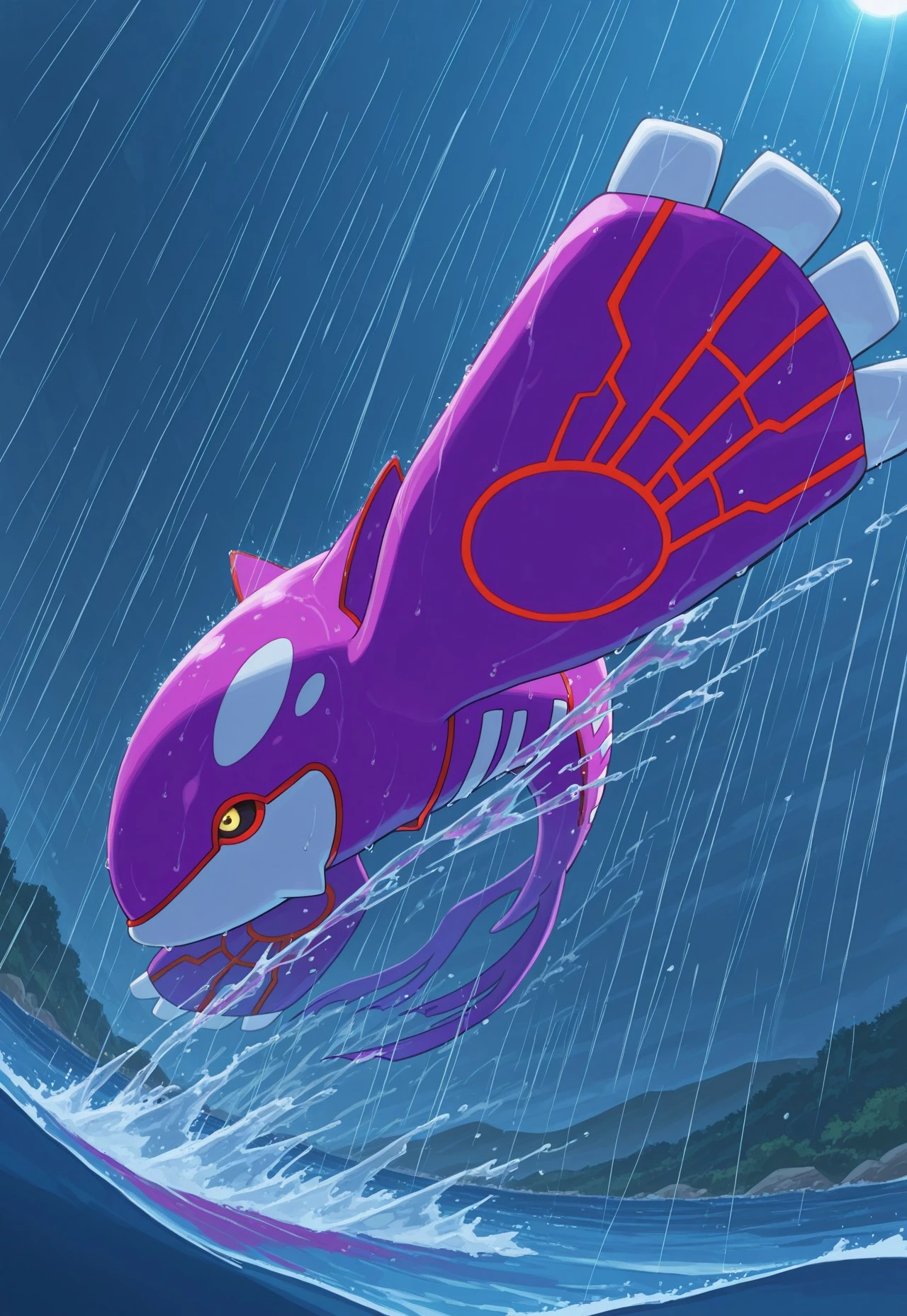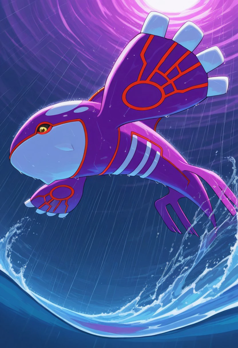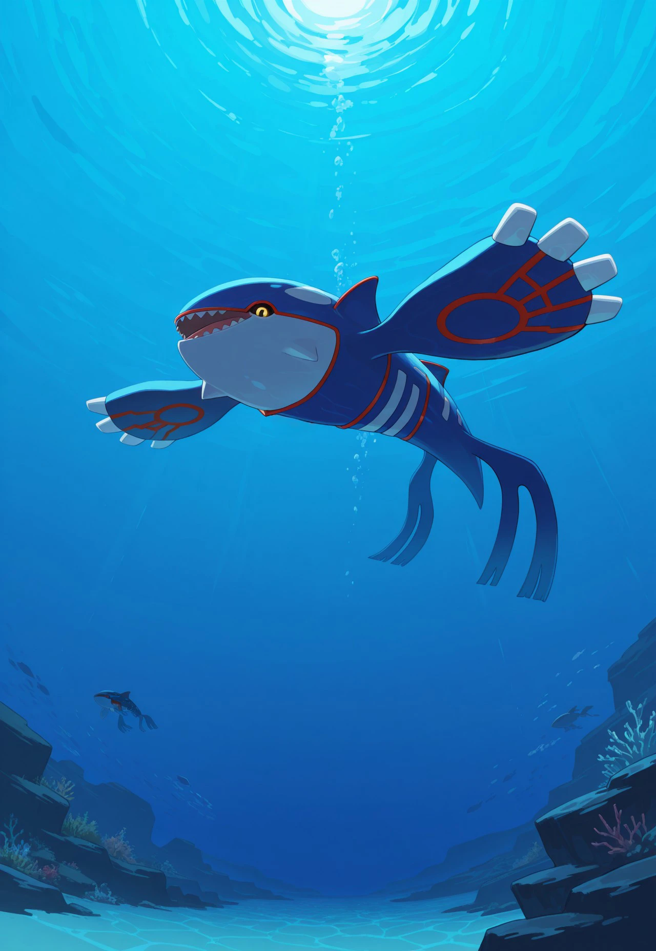PKMN_Kyogre, 1other, solo, pokemon focus, yellow eyes, black sclera, red body markings,