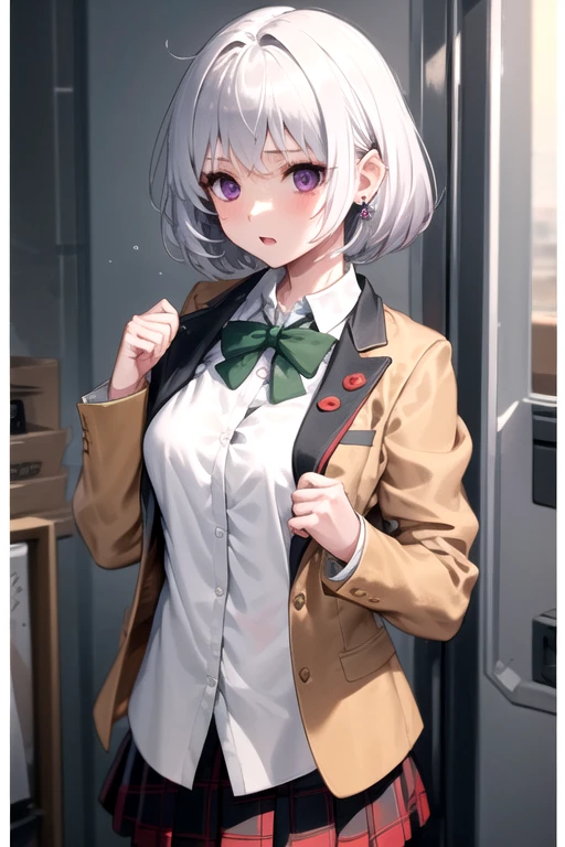 MichihoKinukawa, 1girl, solo, short hair, pleated skirt, medium breasts, white shirt, long sleeves, jewelry, purple eyes, grey hair, earrings, collared shirt, green bowtie, open blazer, sleeves past wrists, red skirt, plaid skirt, brown blazer
