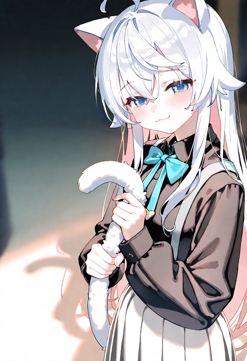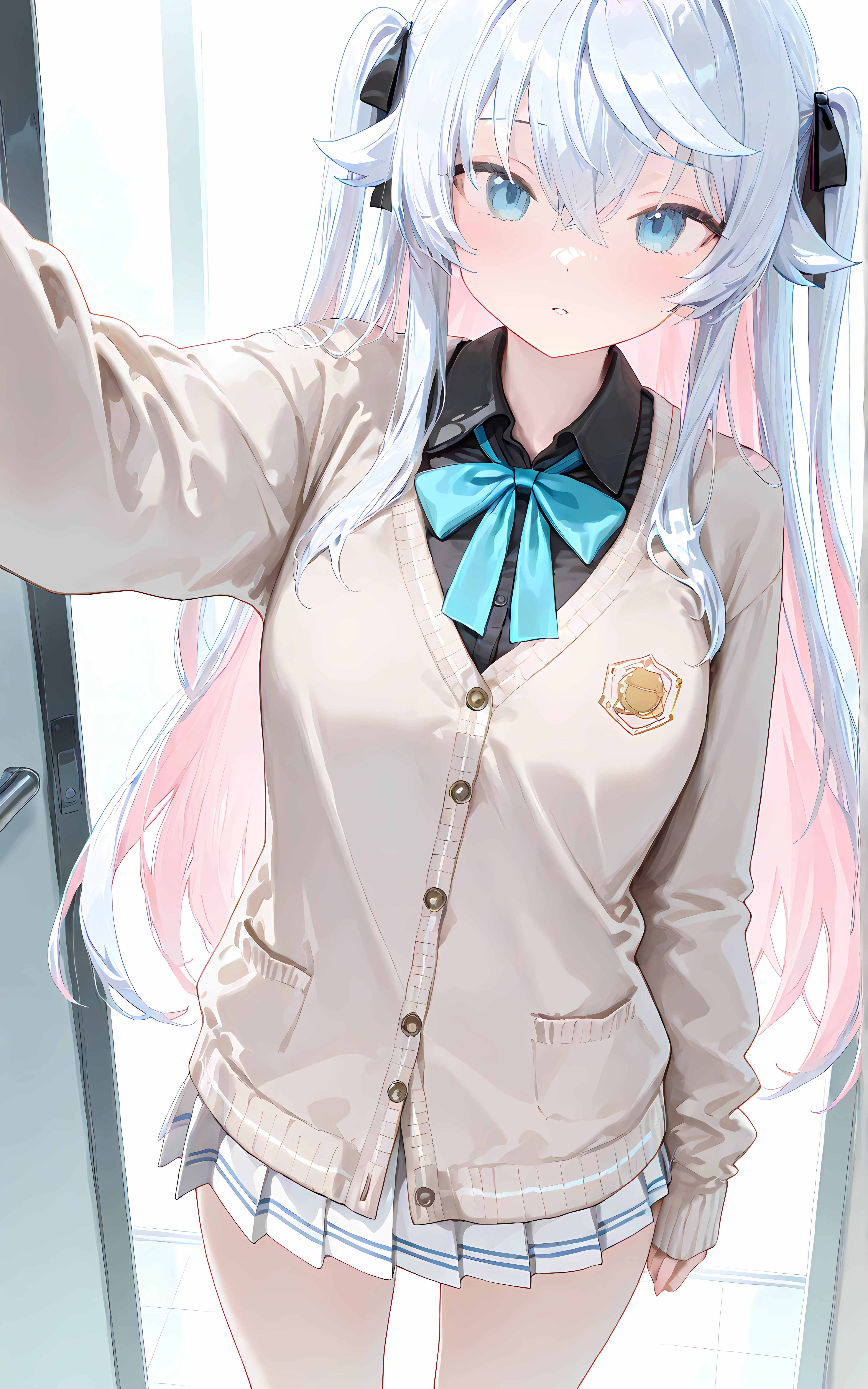 Kagura_Nana,white pleated striped skirt,black undershirt,blue bowtie,brown cardigan羊毛衫