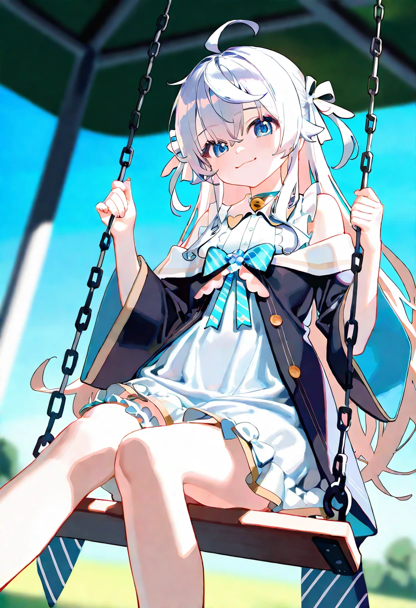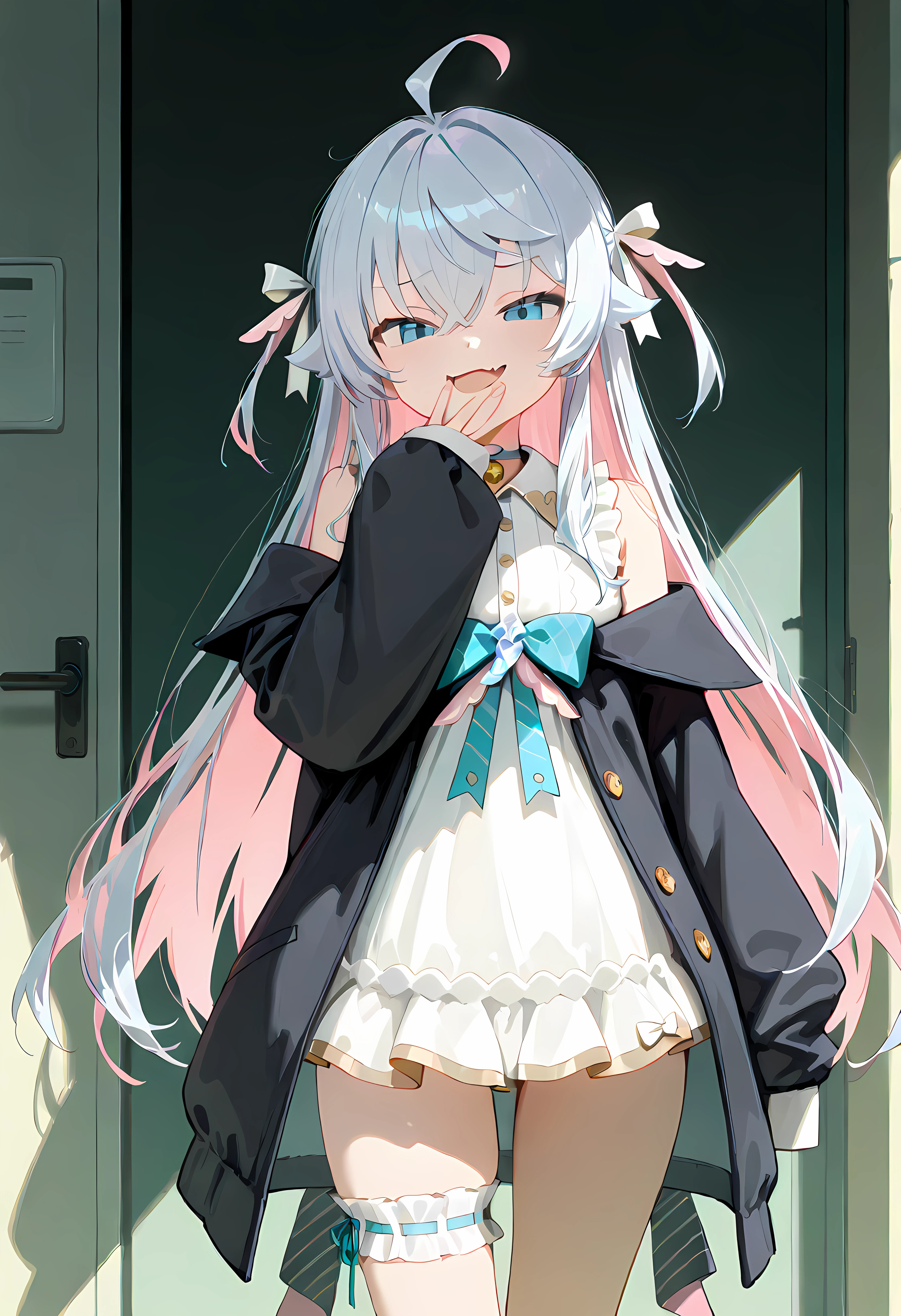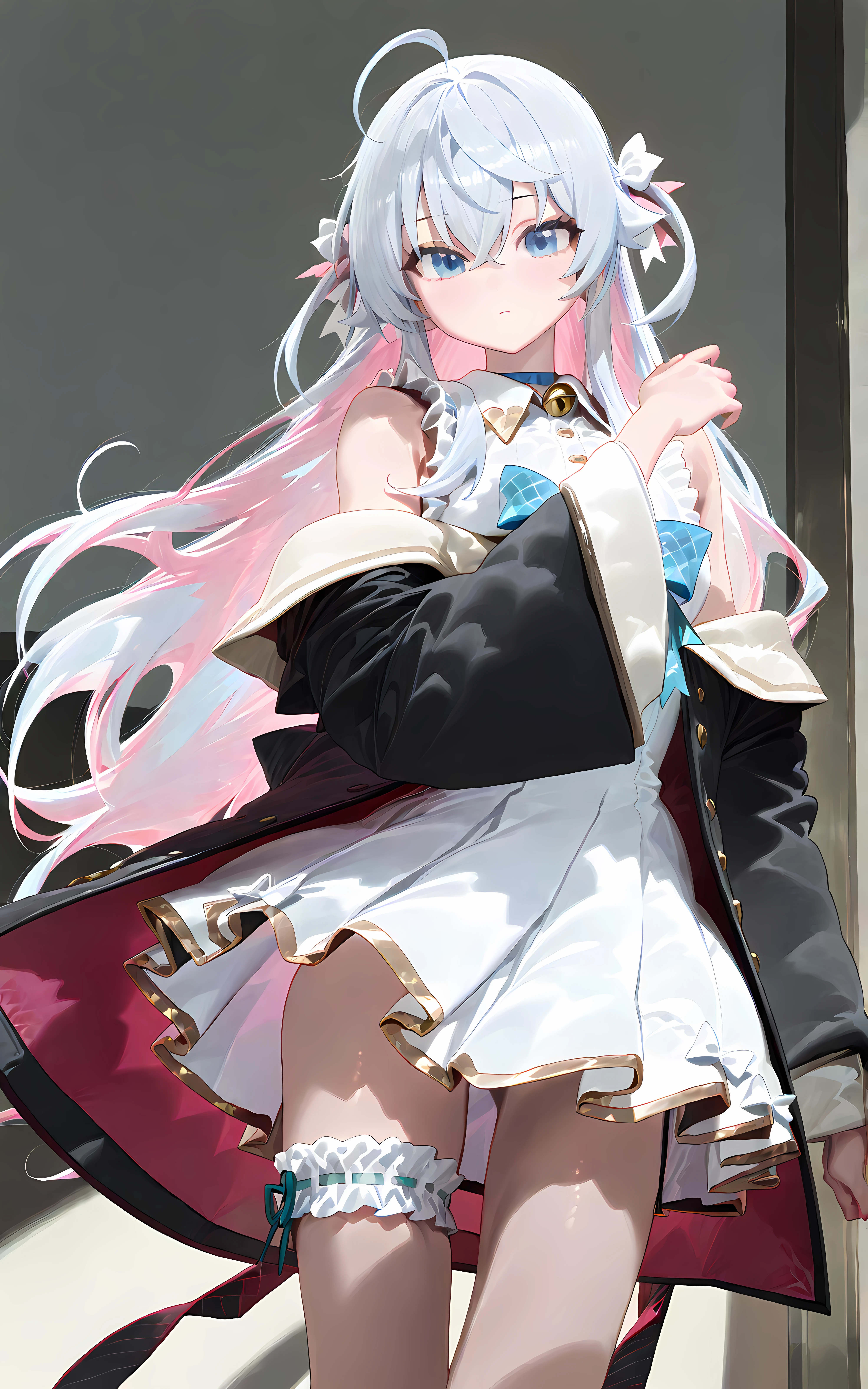 Kagura_Nana,white frilled dress, off-shoulder black jacket bow,bare shoulders,thigh strap,neck bell