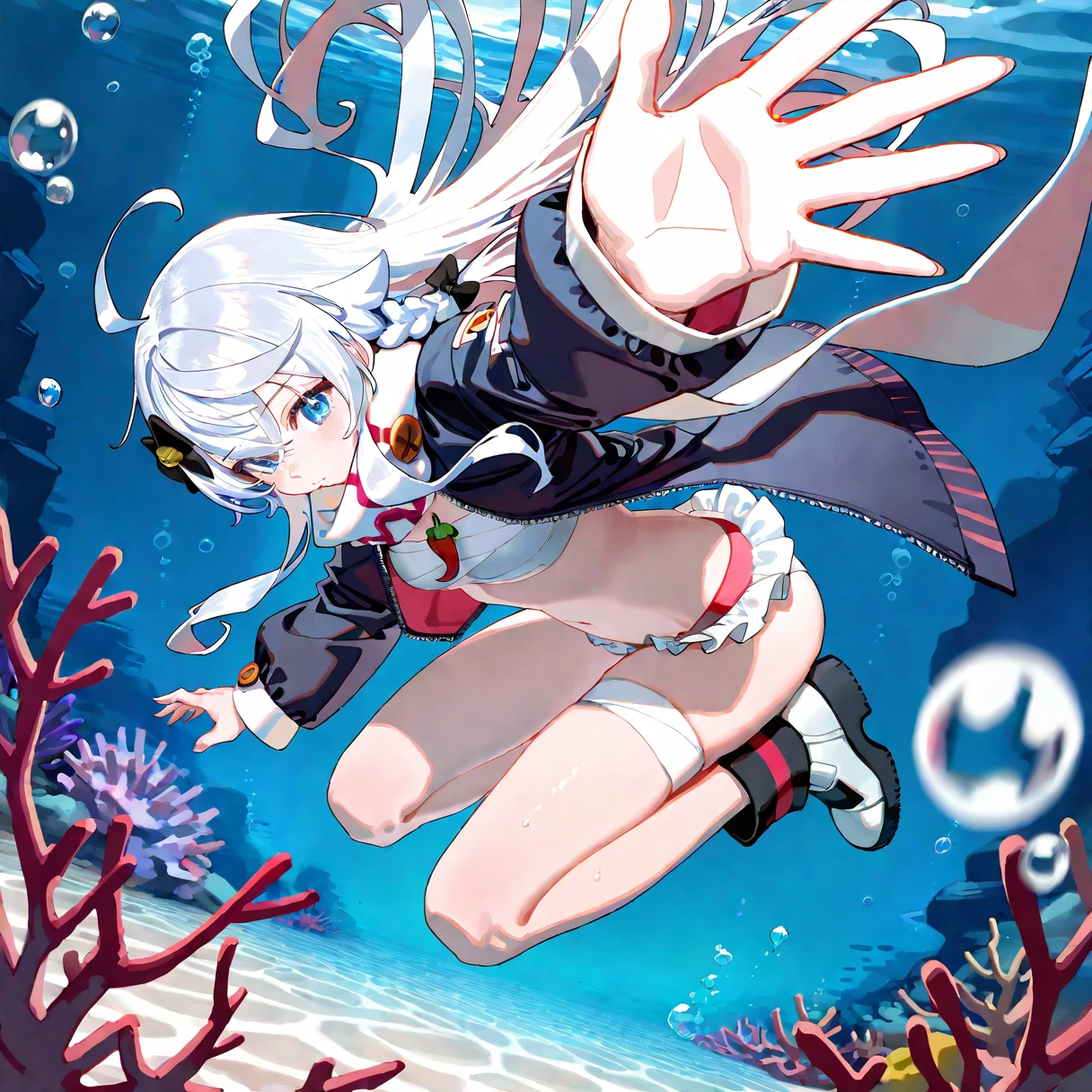Kagura_Nana,open black jacket,panties,scarf,bandages,hair black bow