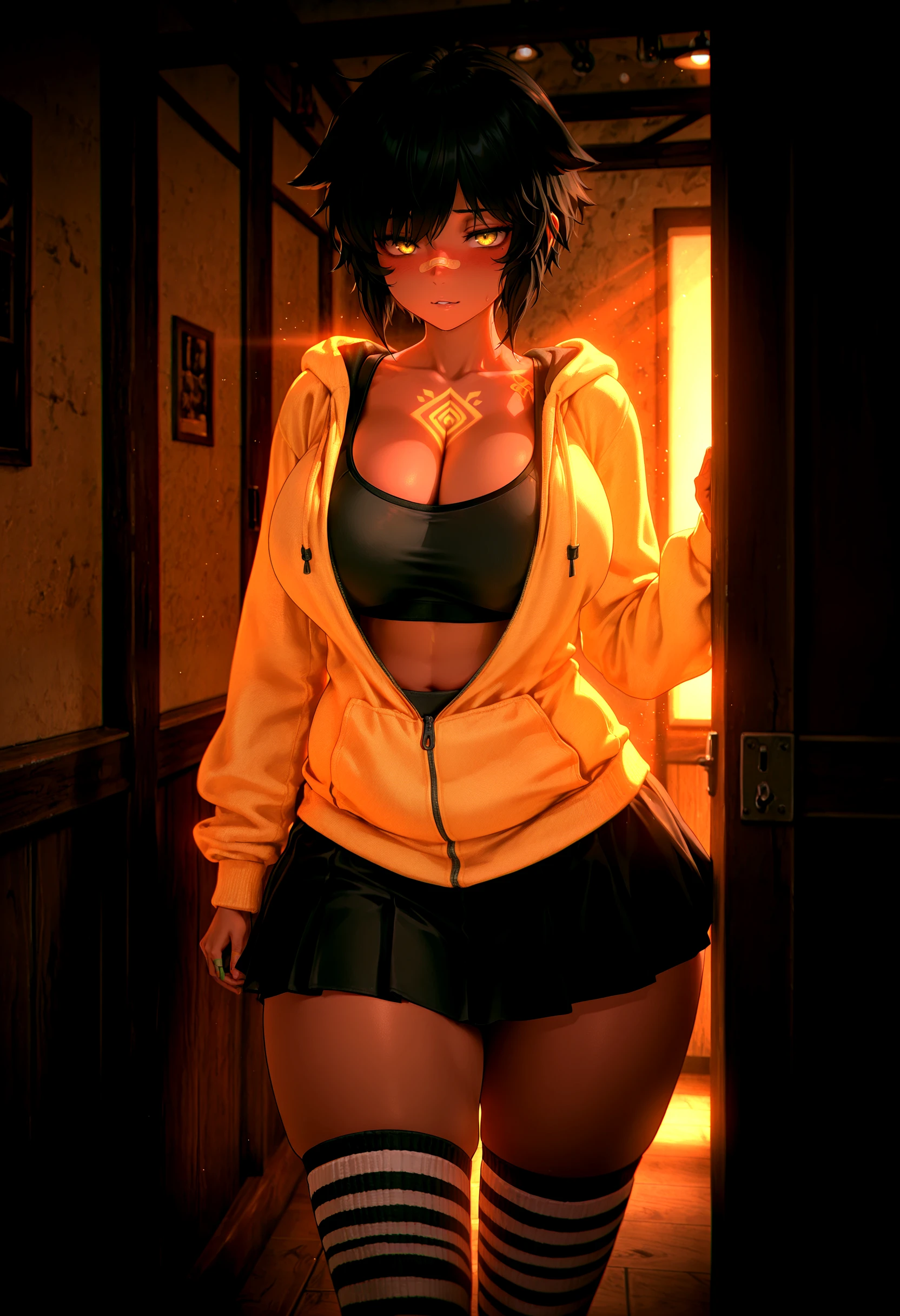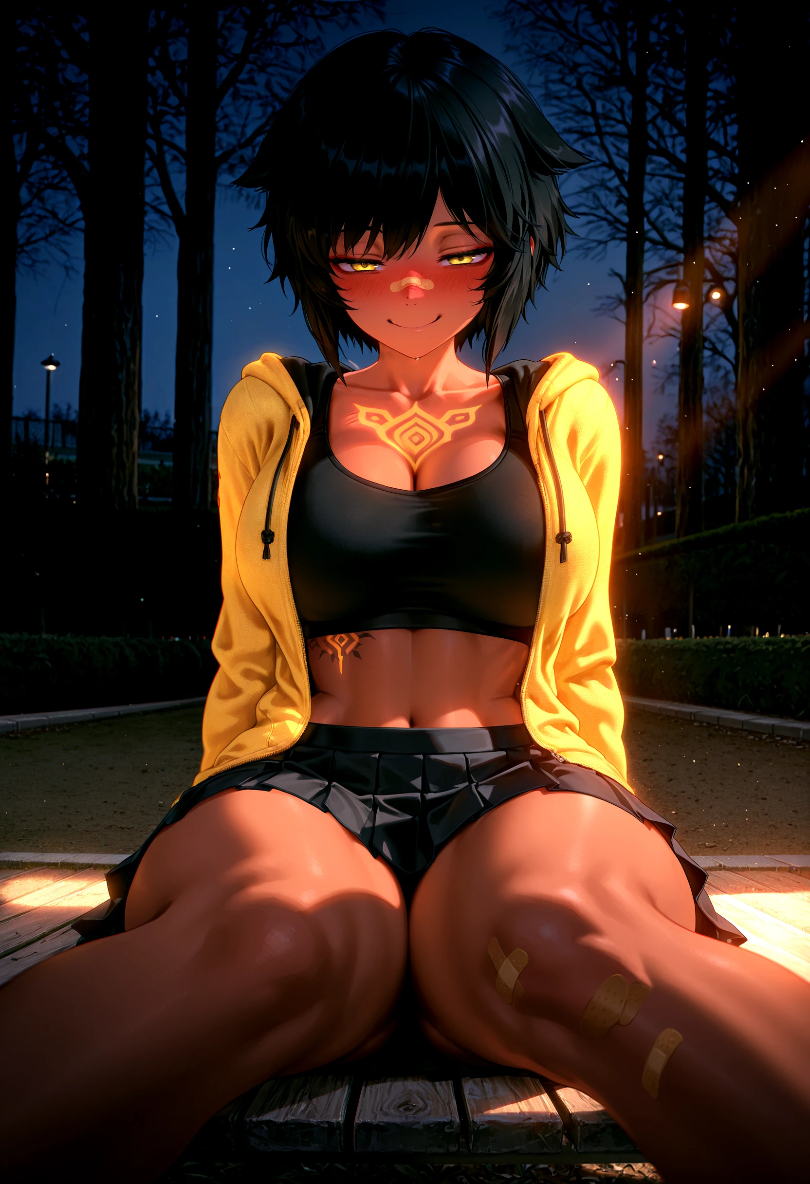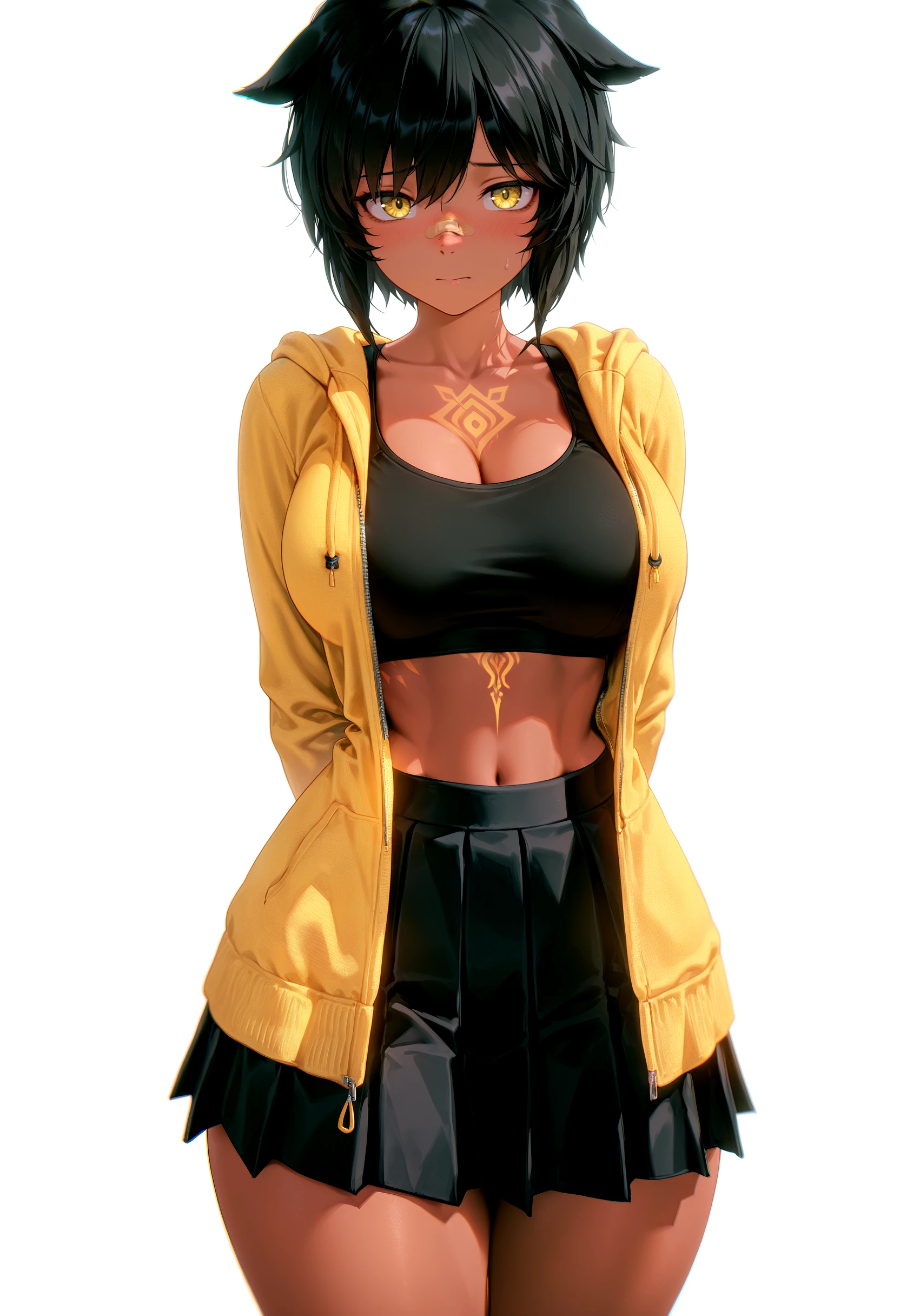 1girl, bandaid on nose, dark skin, yellow eyes, black hair, hair ears, short hair, bangs, large breasts, chest tattoo, wide hips, thick thighs,'Fit (inconsistent)
