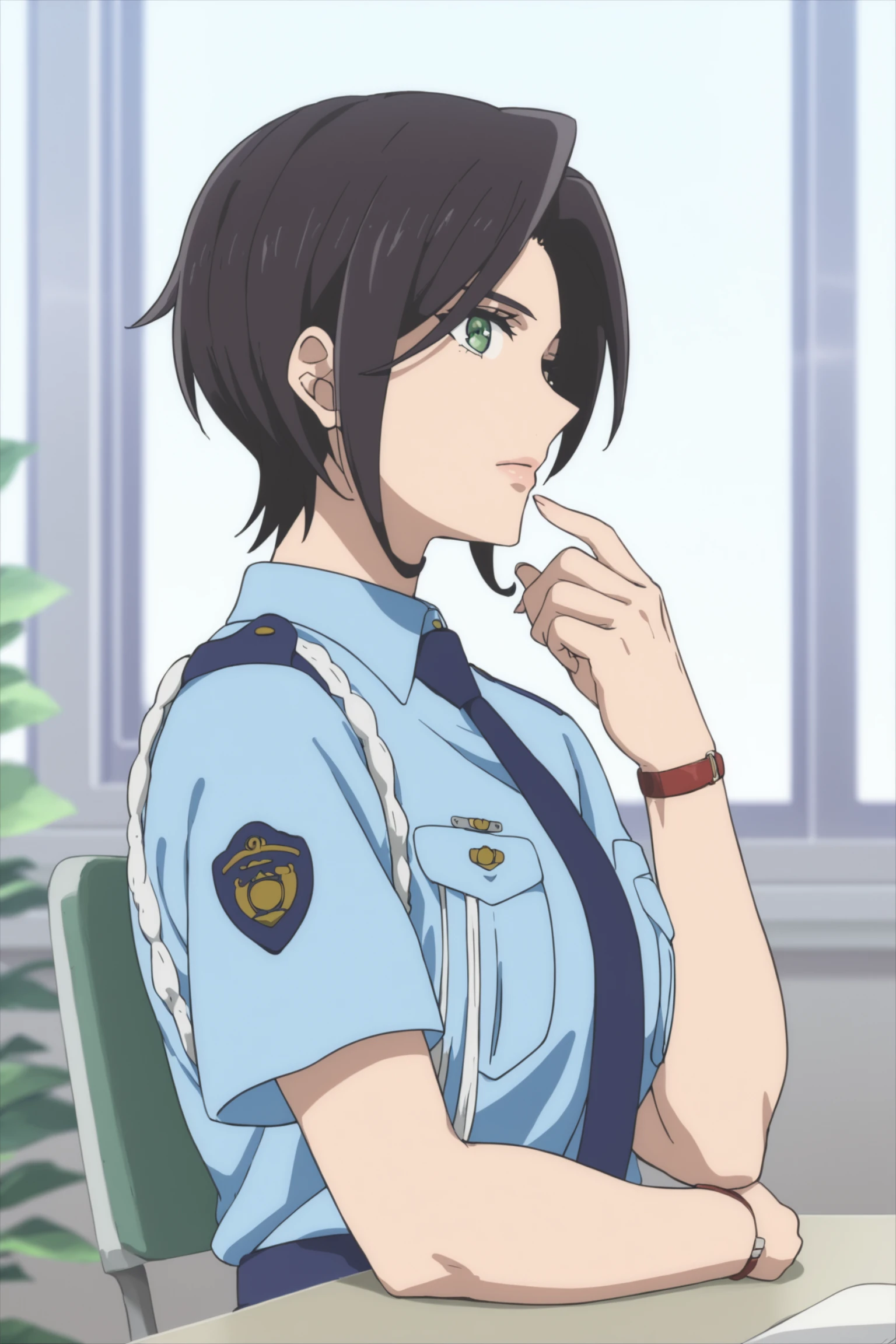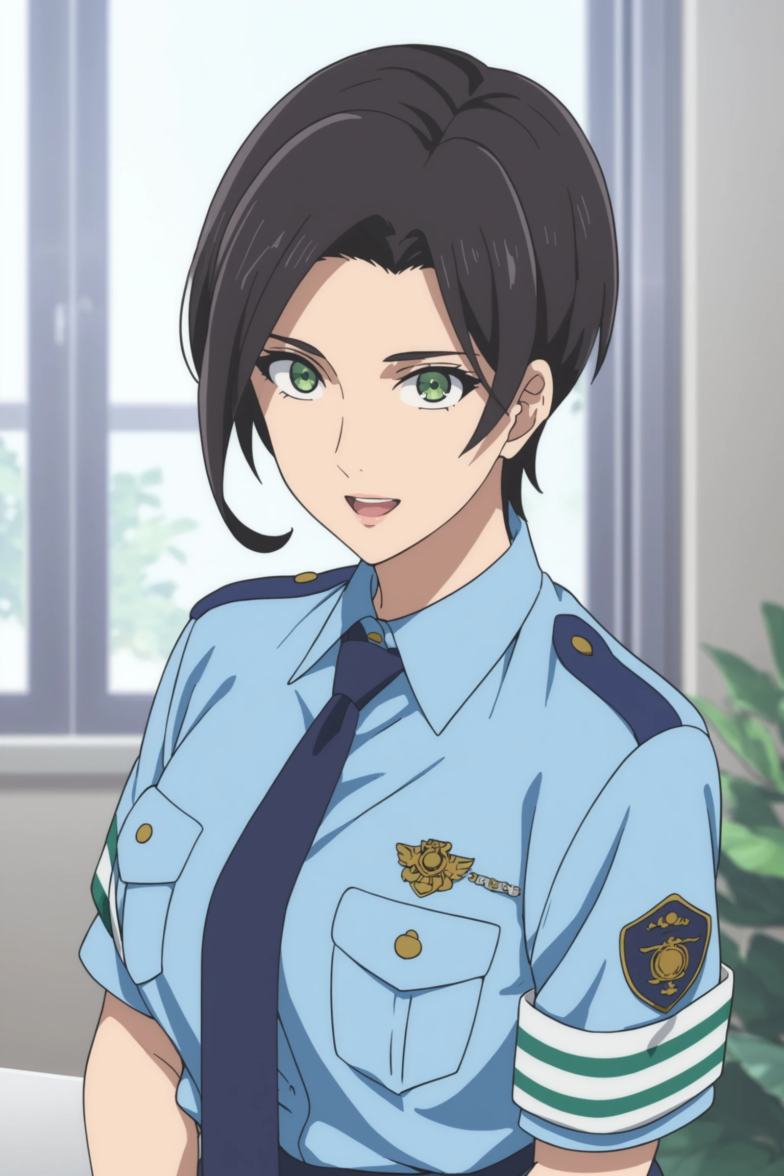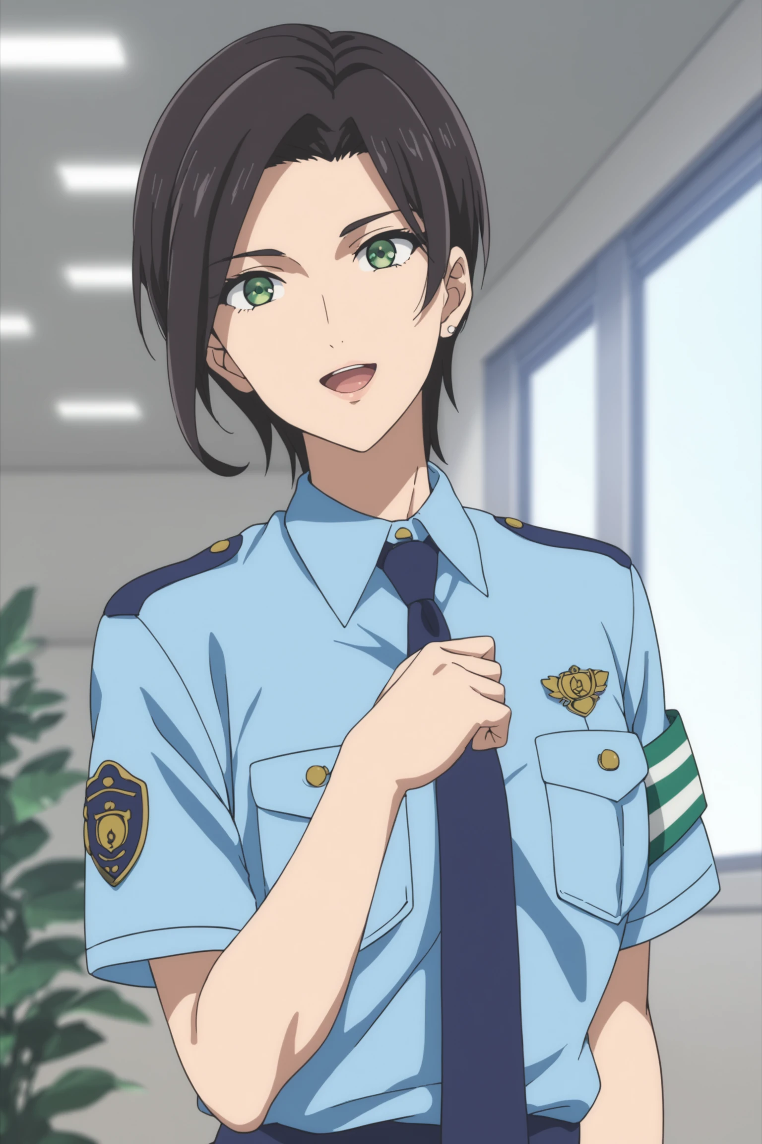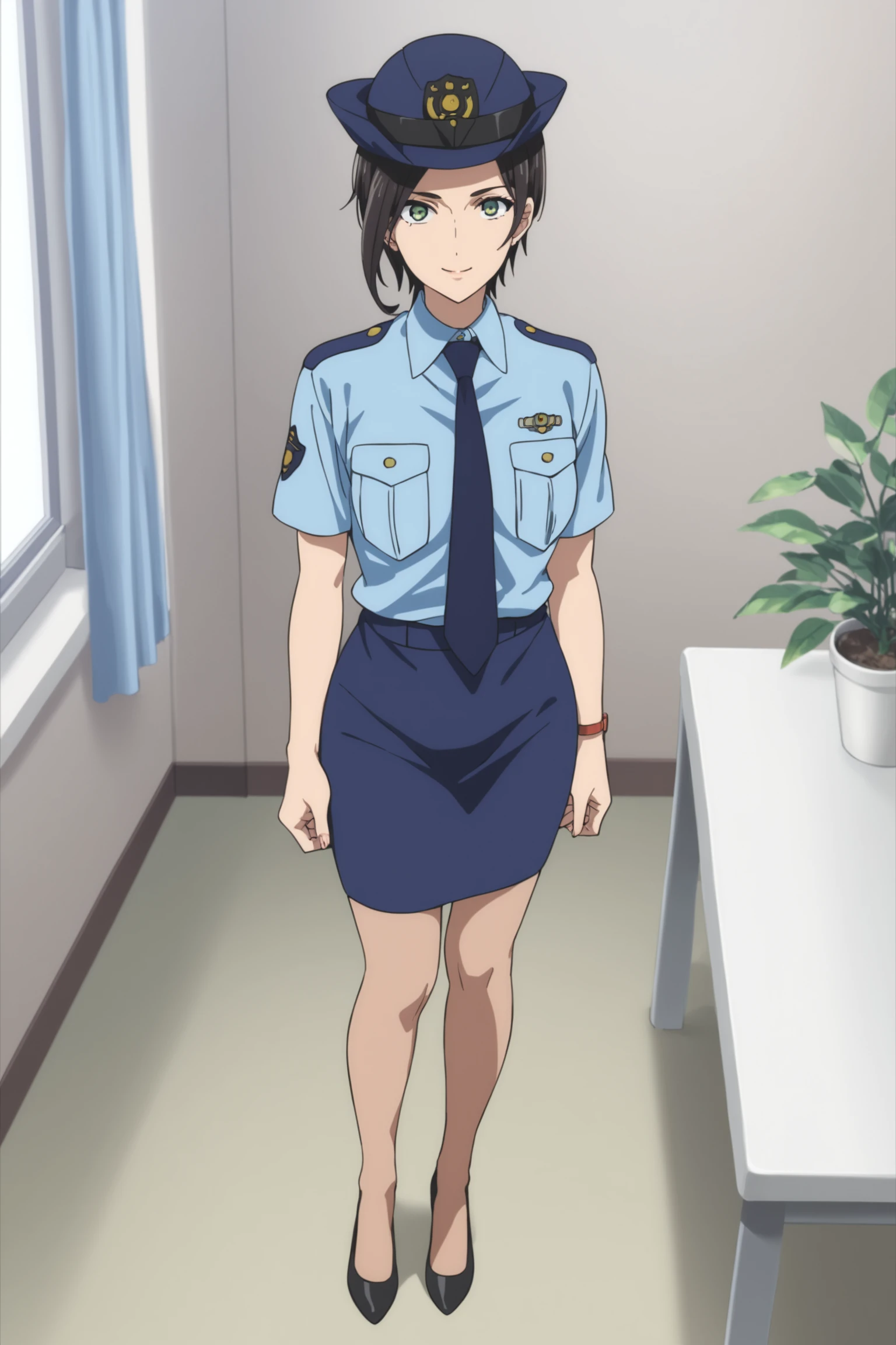 police uniform - yumihara saki, black hair, short hair, green eyes, sakipolice, policewoman, police uniform, short sleeves, blue shirt, collared shirt, blue necktie, blue skirt, black shoes