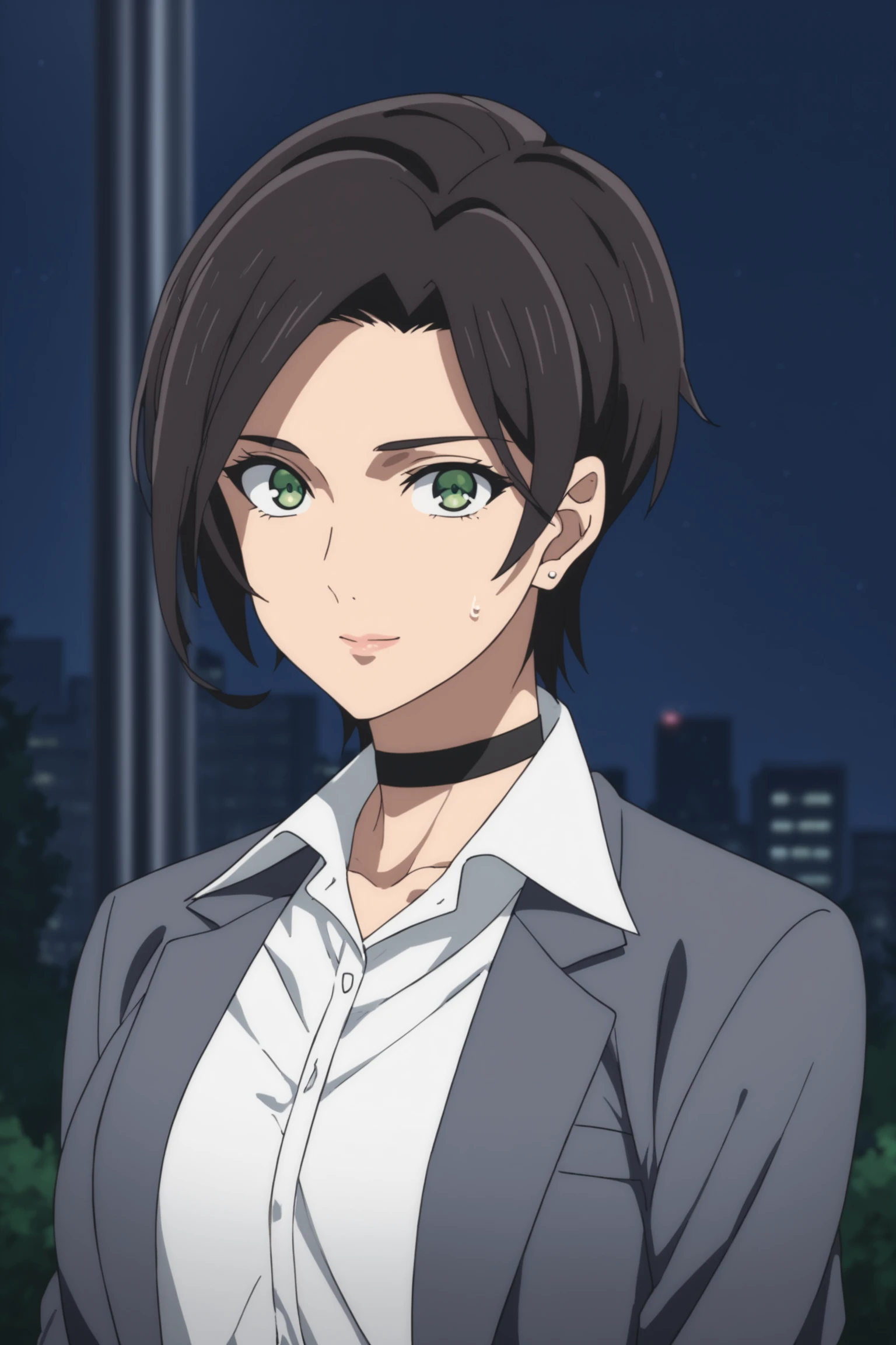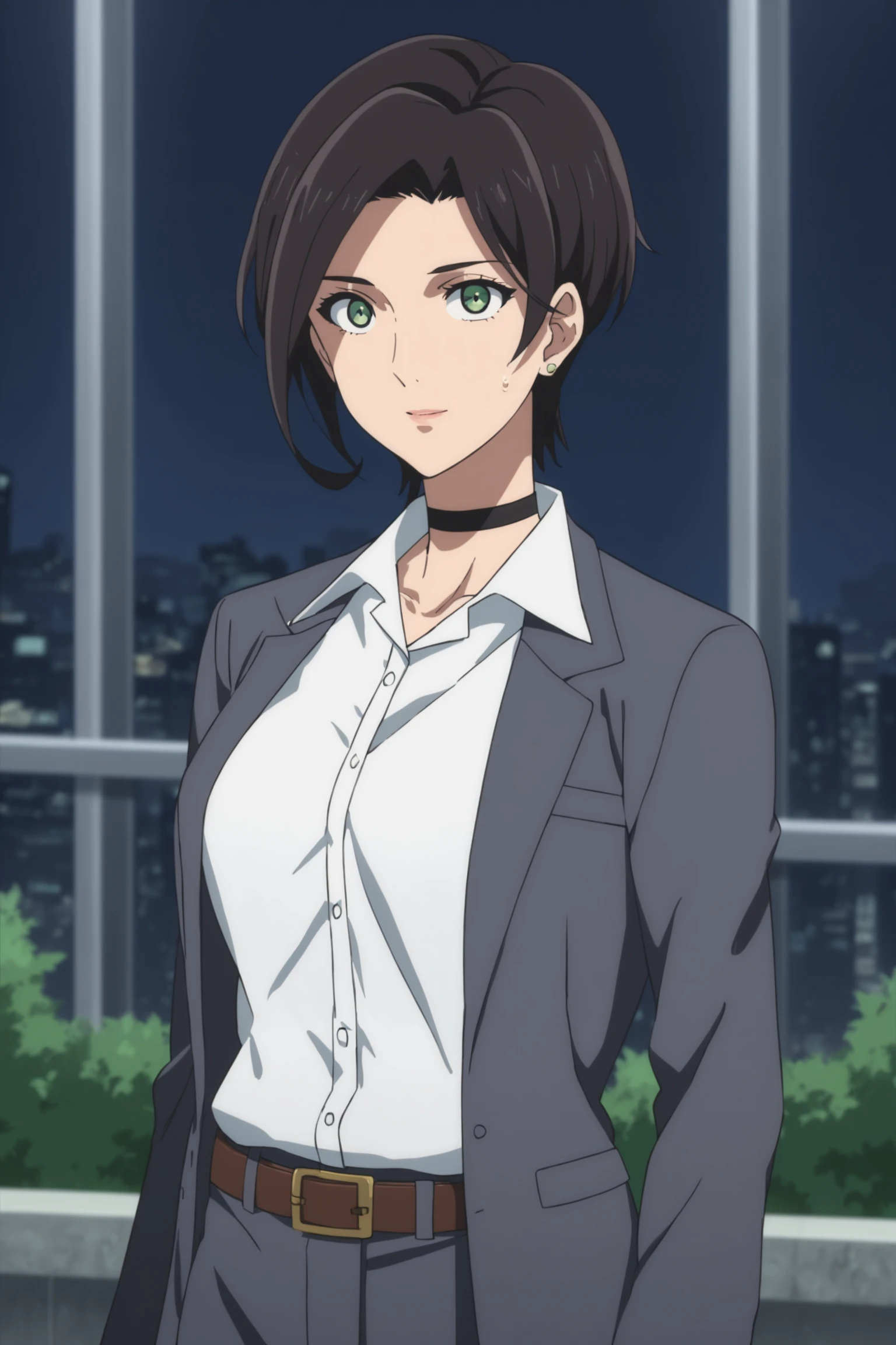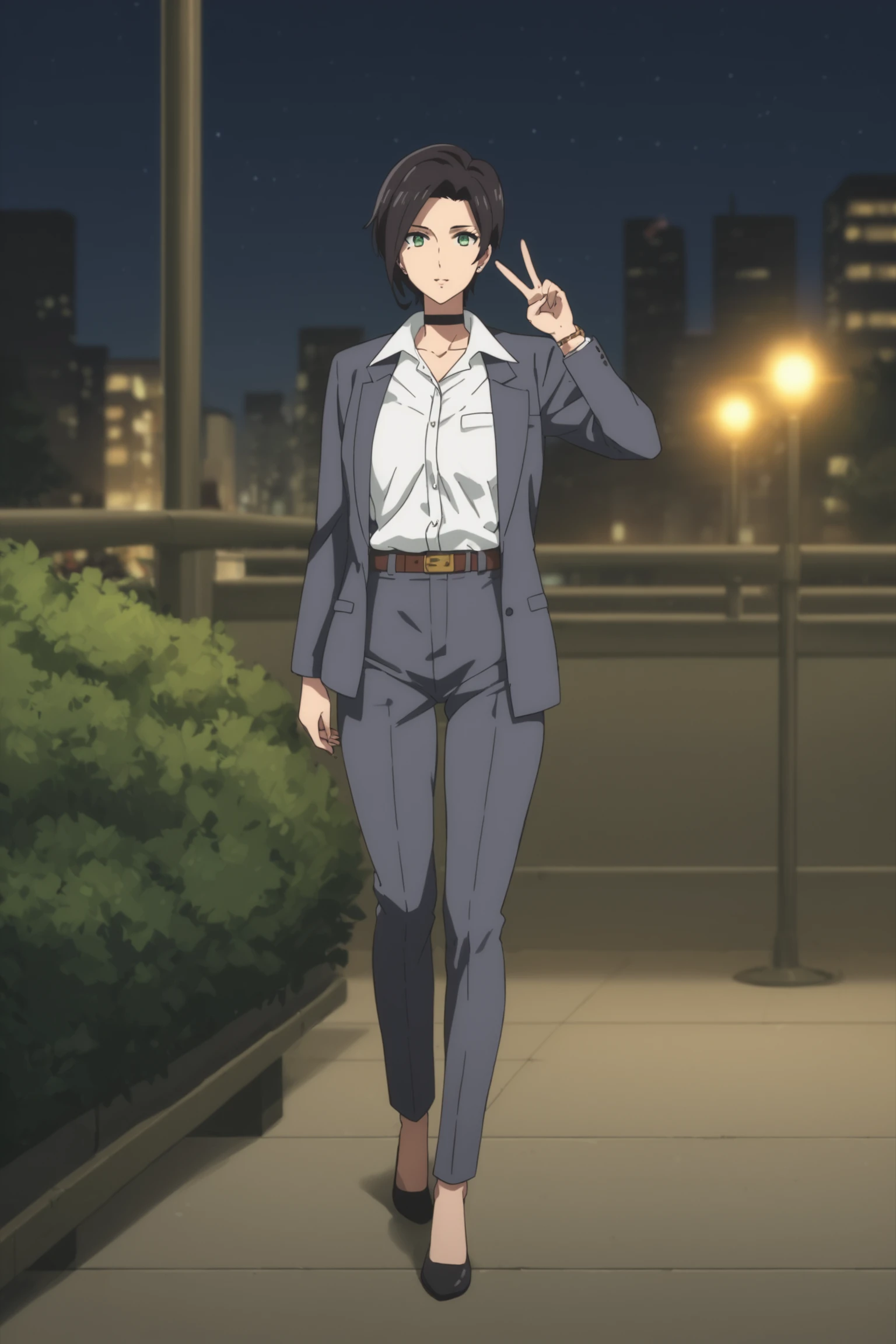 suit - yumihara saki, black hair, short hair, green eyes, sakisuit, formal, suit, black choker, grey jacket, white shirt, collared shirt, belt, grey pants, black shoes