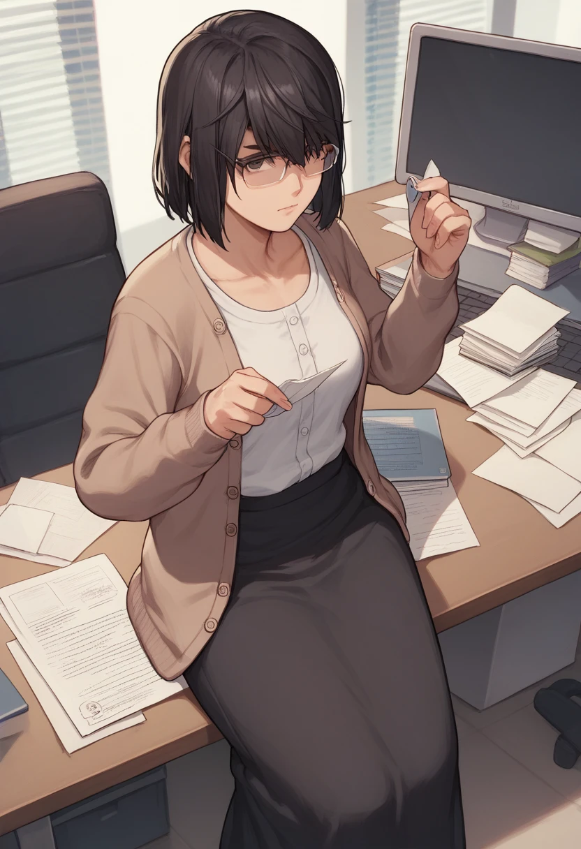 shirosakisaori, glasses, cardigan, black skirt, long skirt