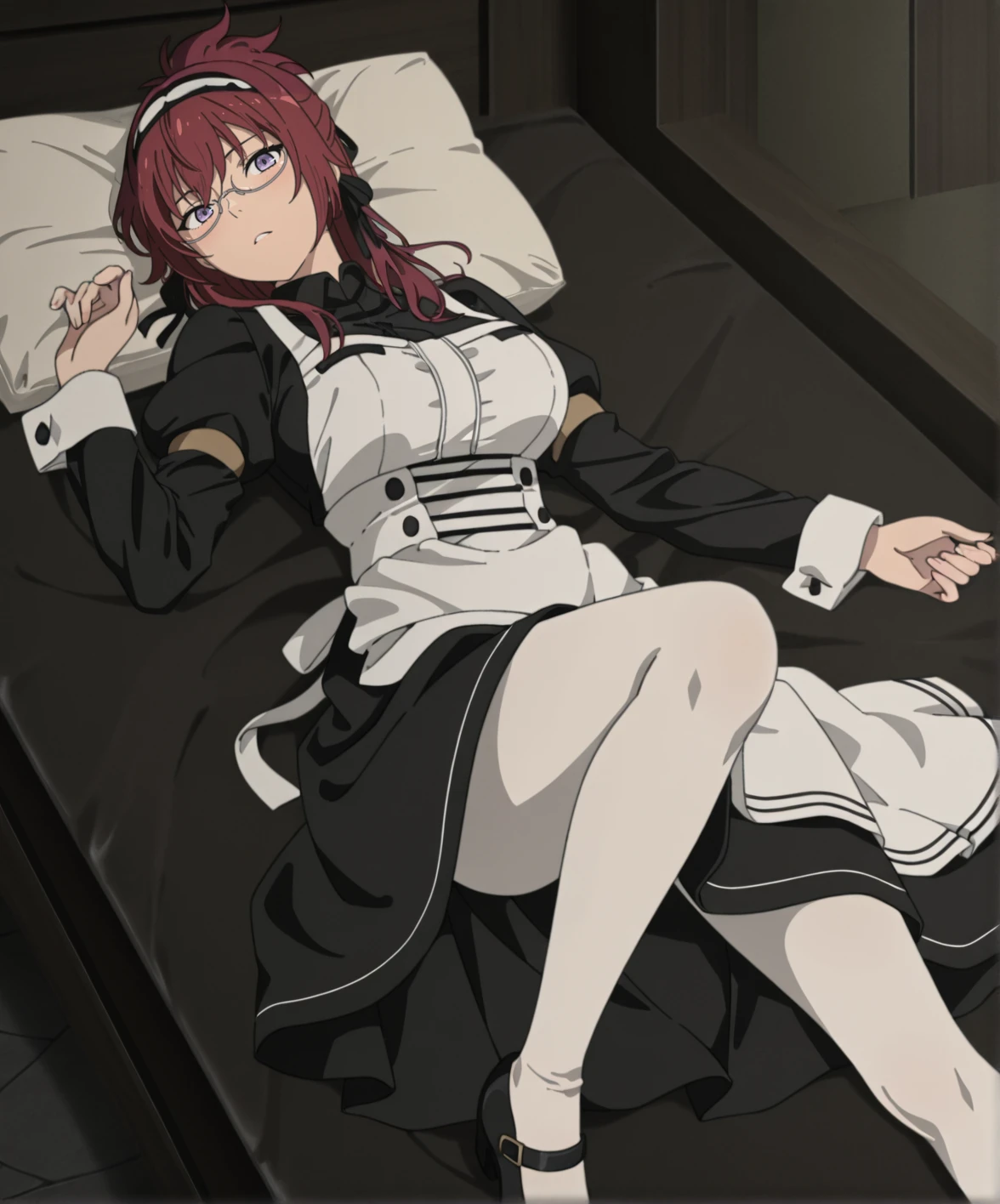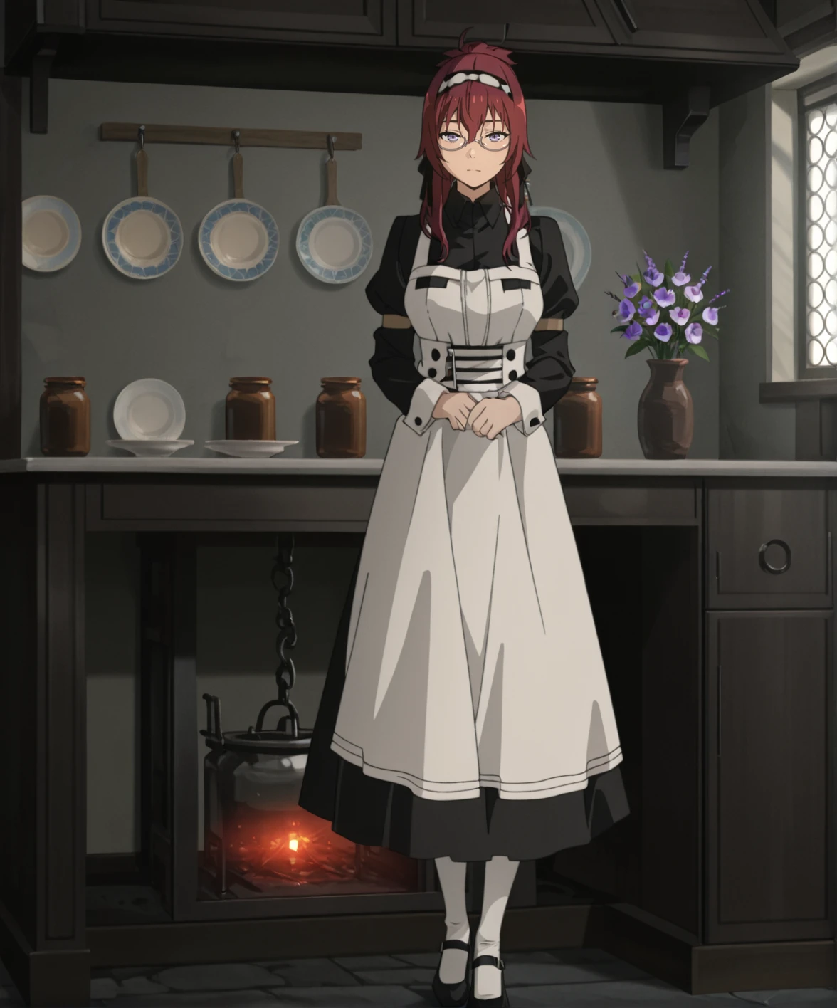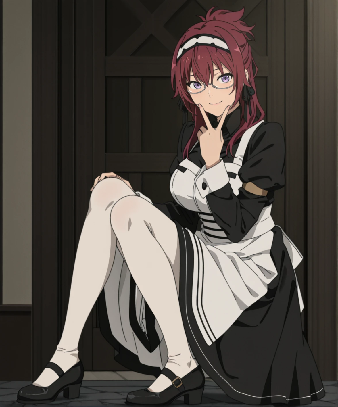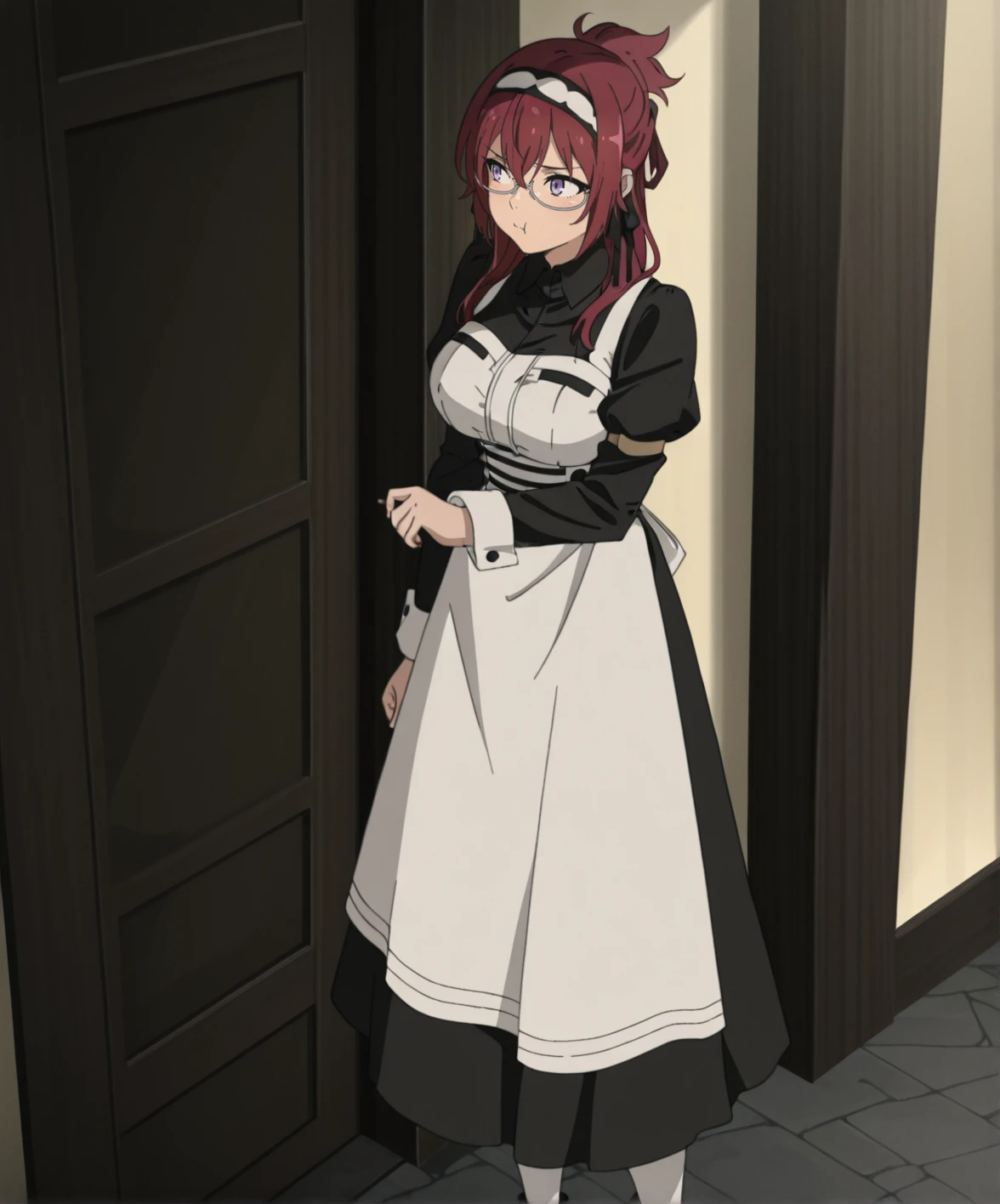 liliagreyratmt, 1girl, long hair, red hair, purple eyes, large breasts, maid headdress, black ribbon, under-rim eyewear, black dress, juliet sleeves, white apron, white pantyhose, black footwear