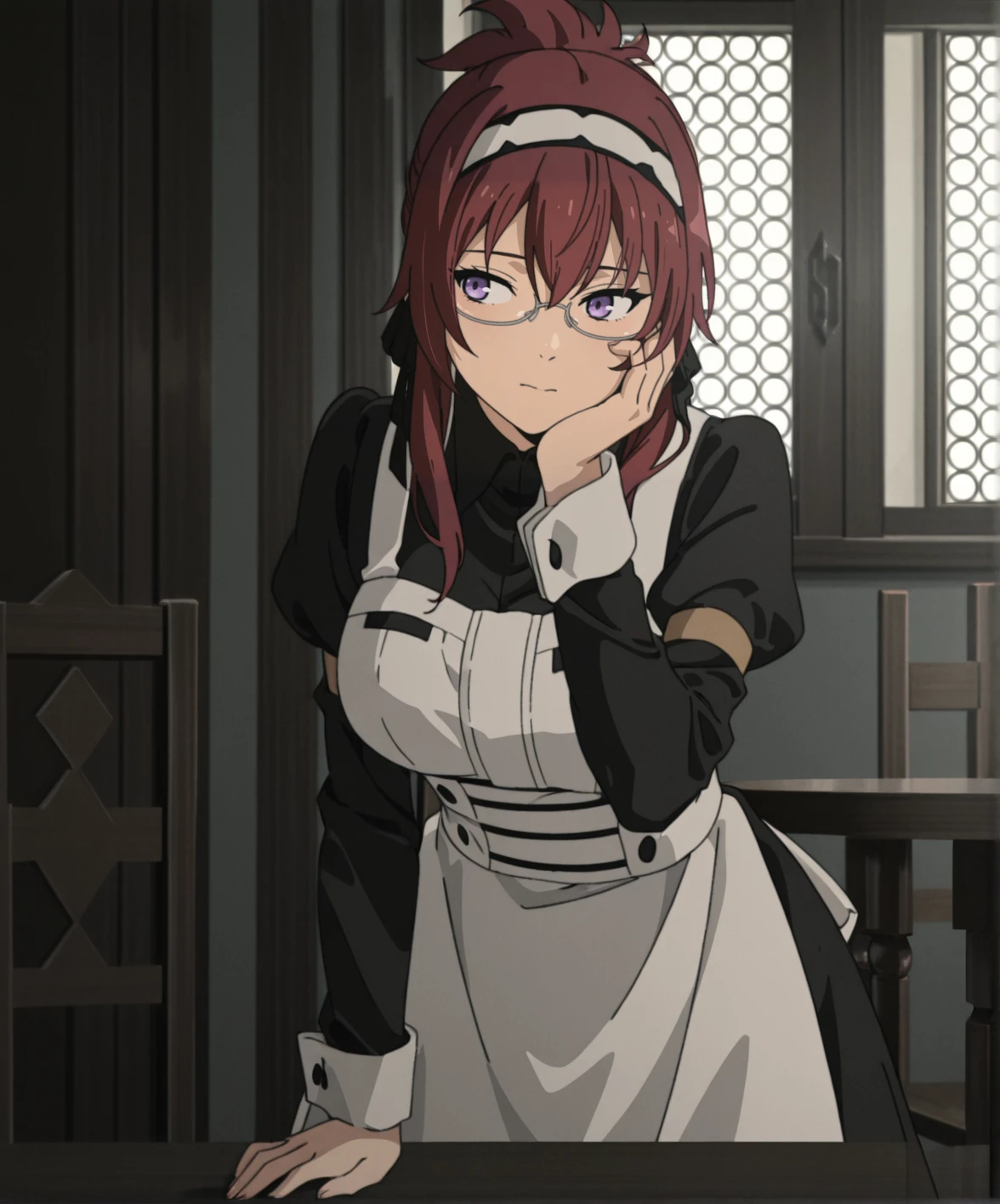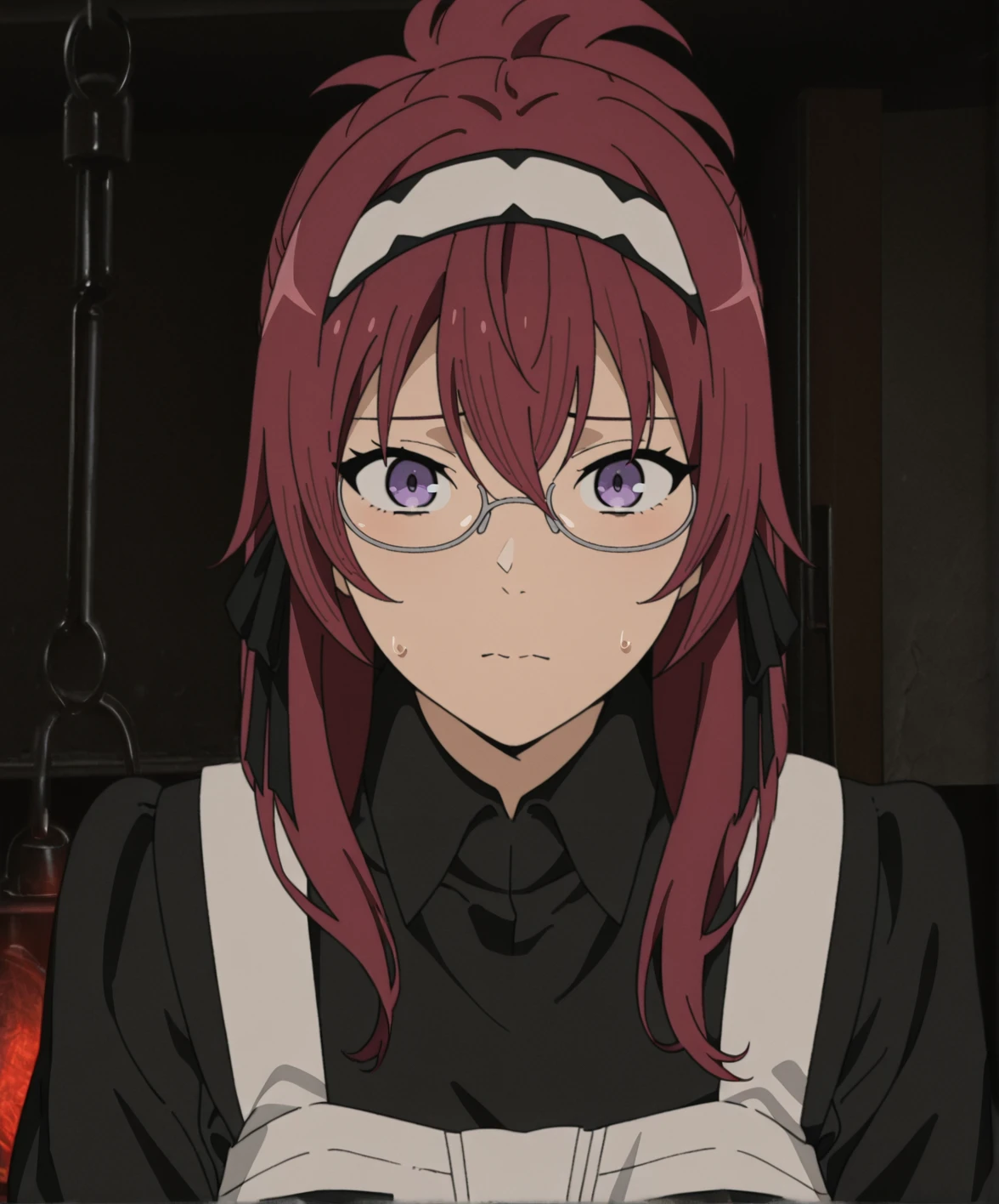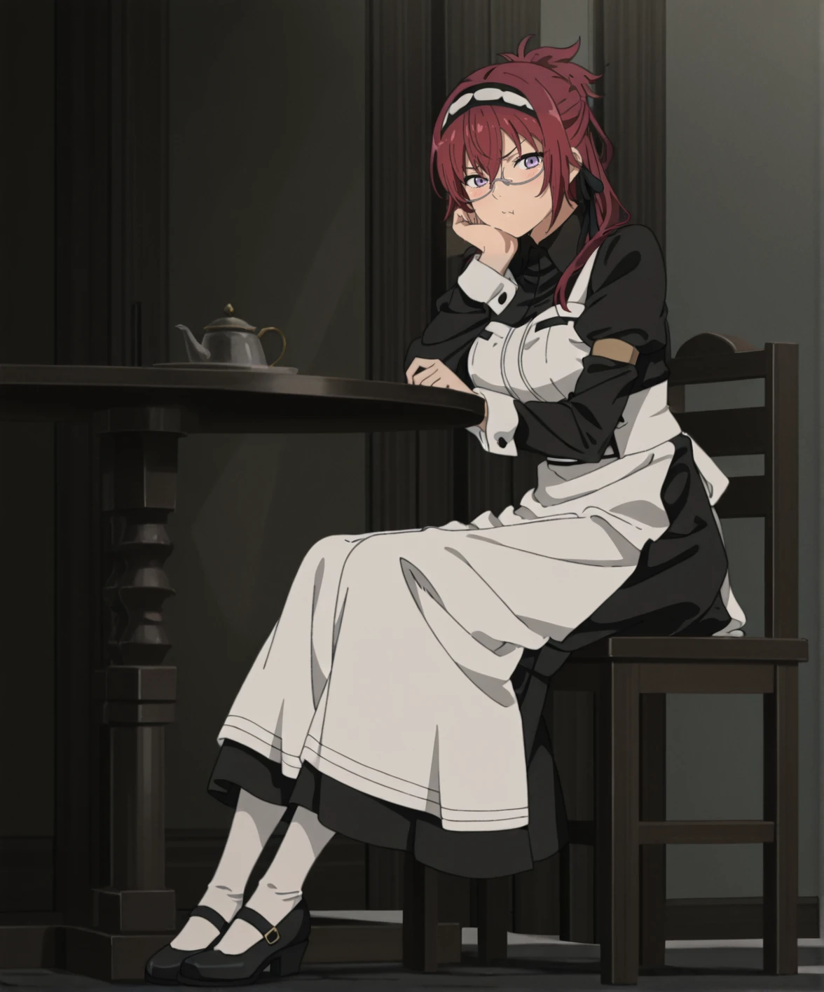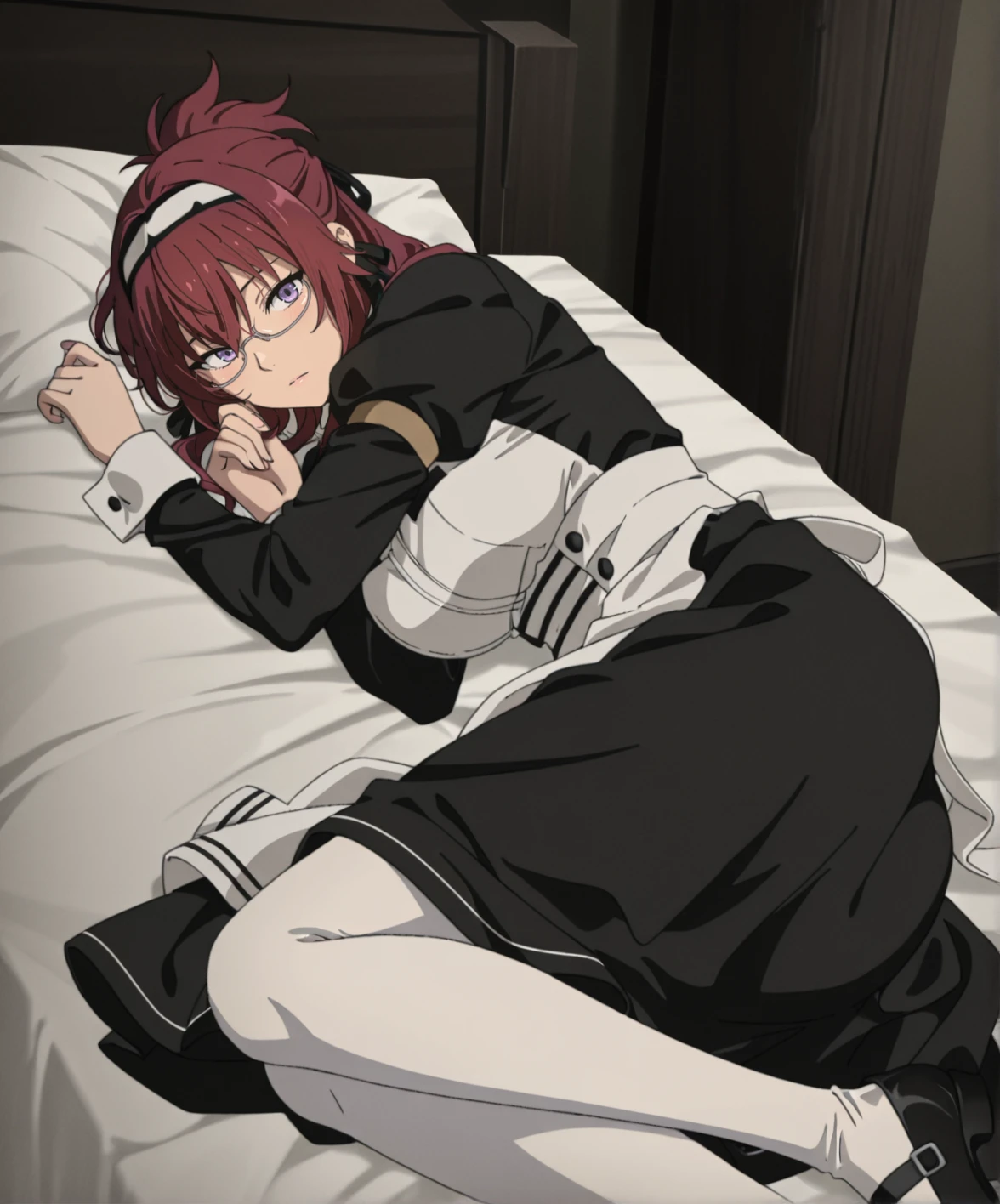 liliagreyratmt, 1girl, long hair, red hair, purple eyes, large breasts, maid headdress, black ribbon, under-rim eyewear, black dress, juliet sleeves, white apron, white pantyhose, black footwear