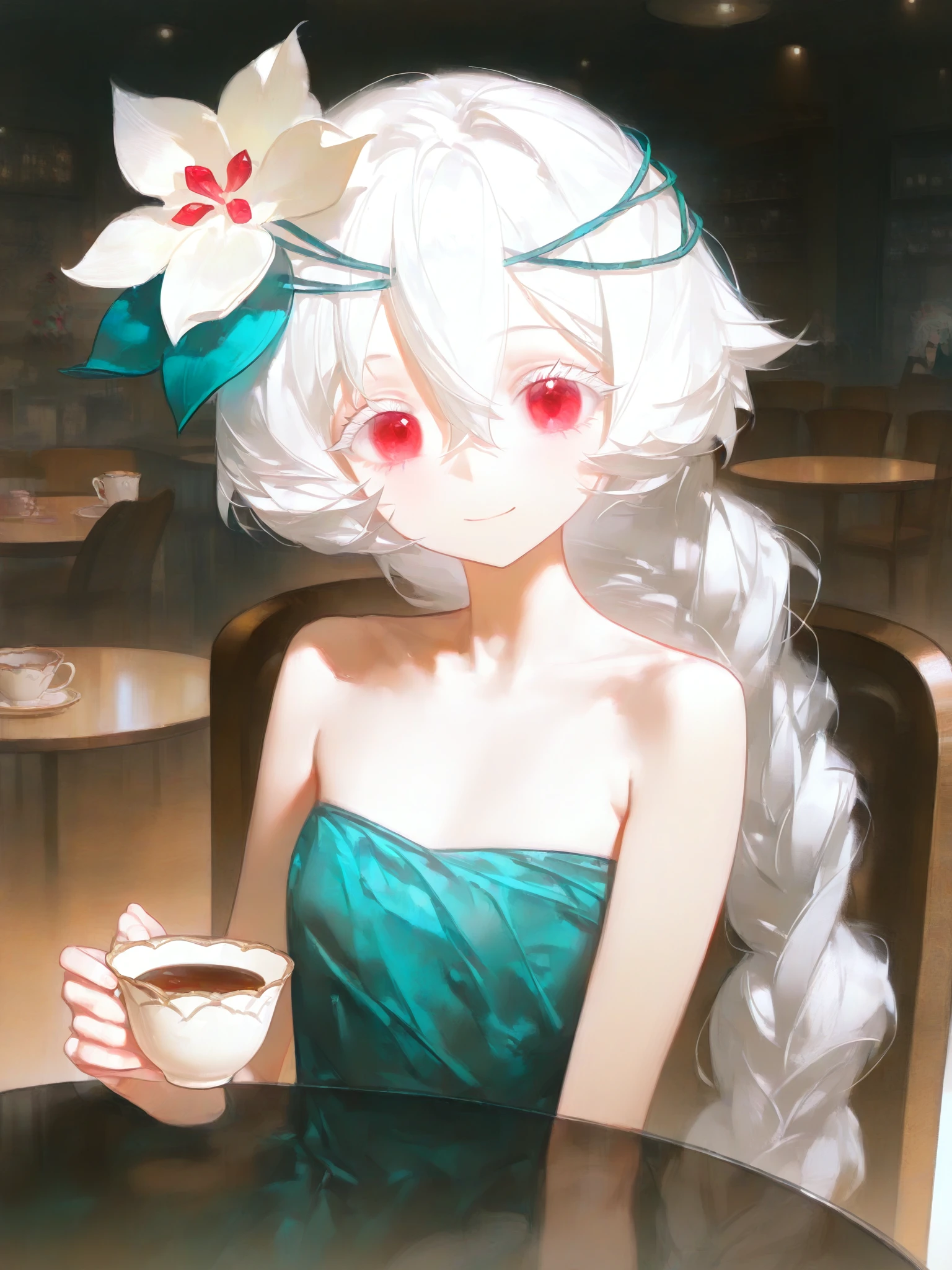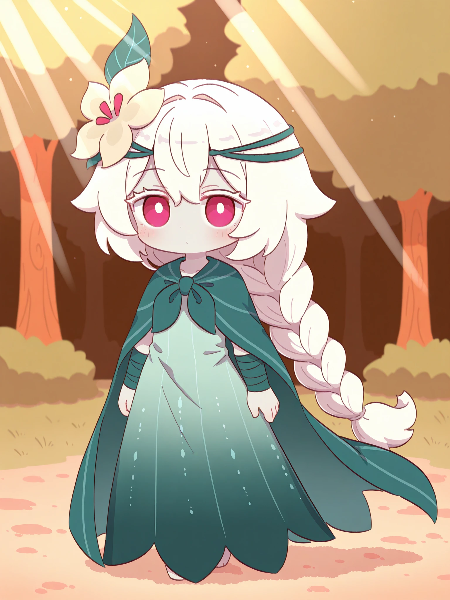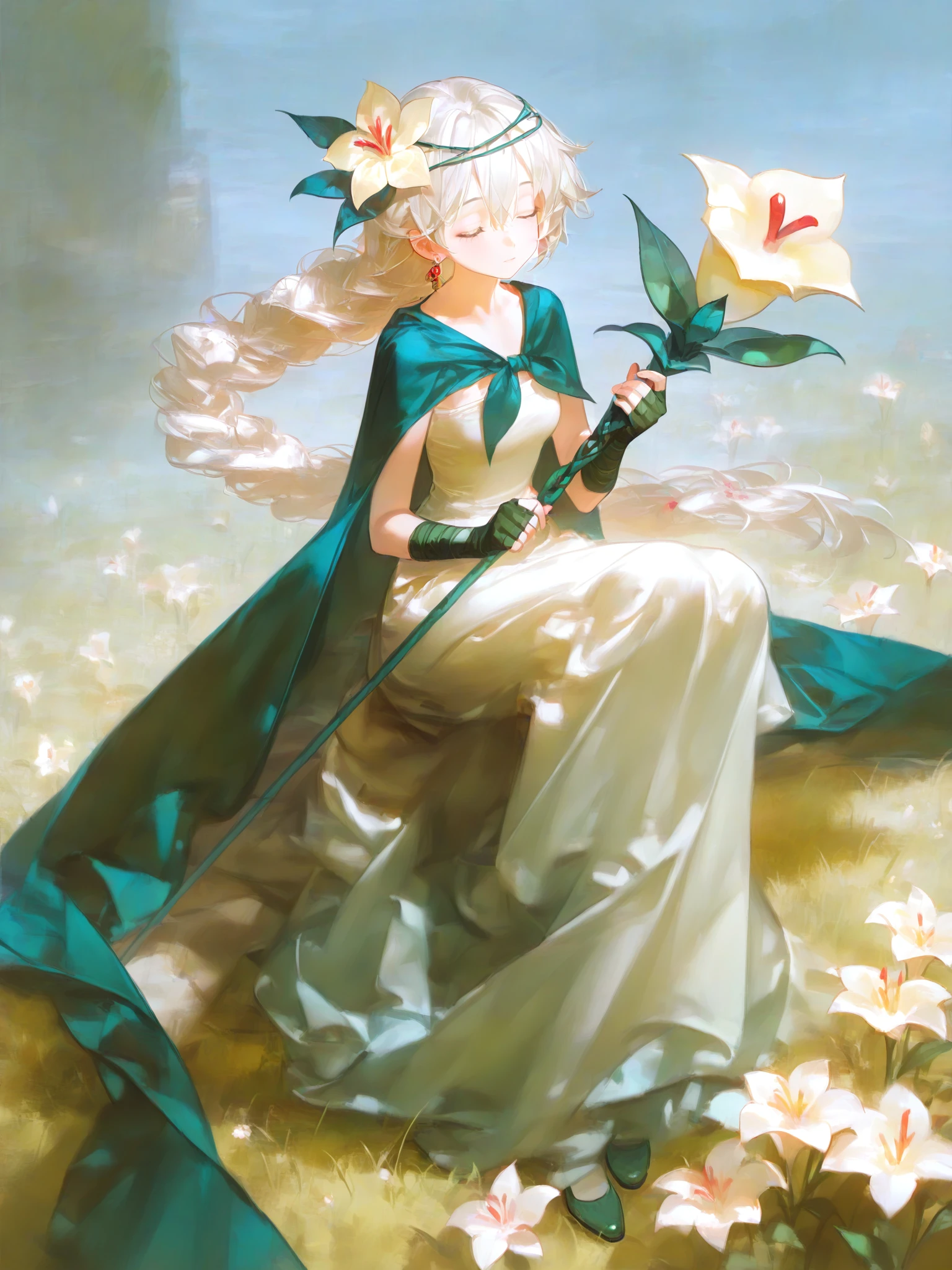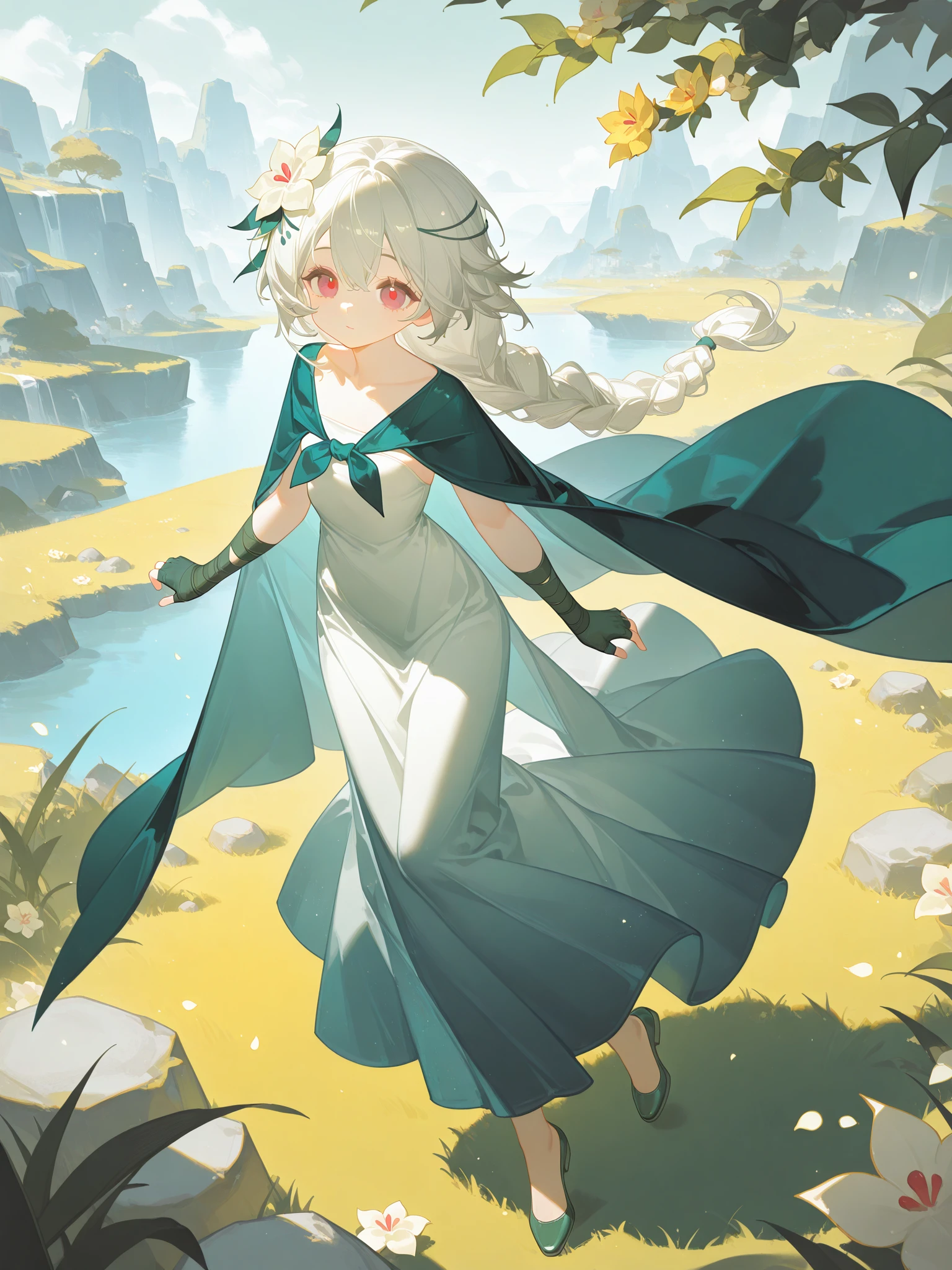 WLC, 1girl, strapless dress, cape, arm wrap, hair flower, long hair, single braid OR long braid, long dress, green footwear, fingerless gloves