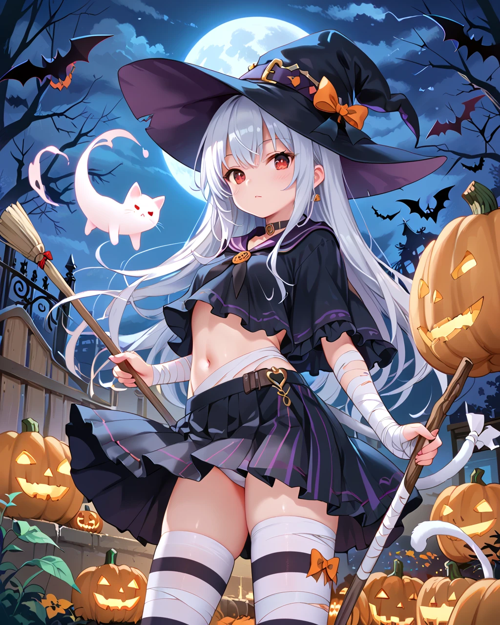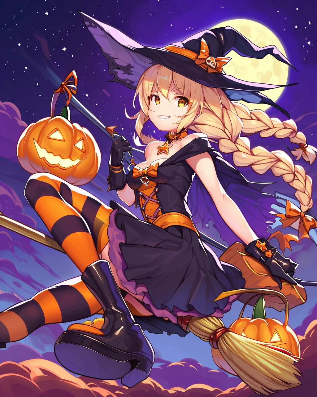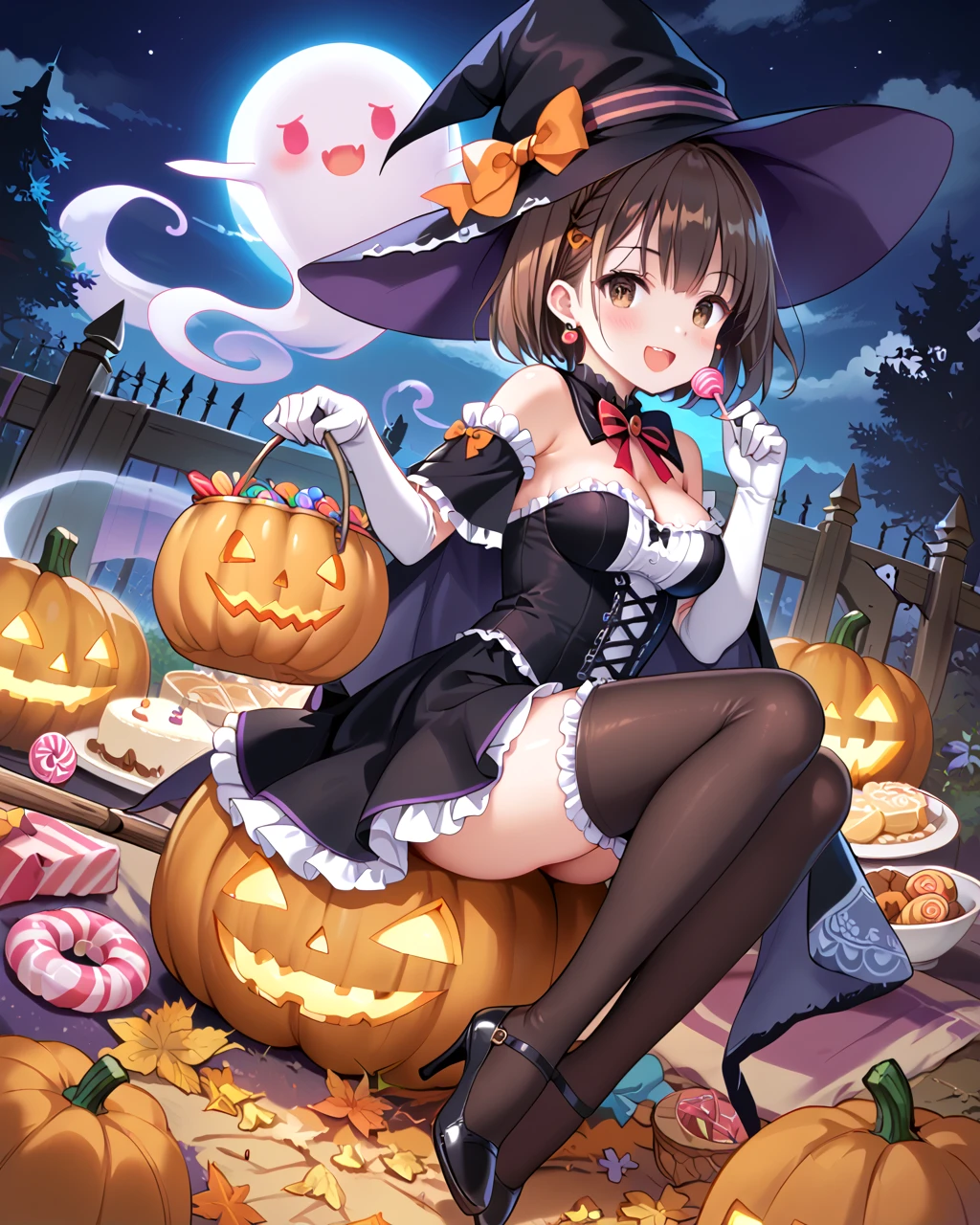 Trained tags: halloween, jack-o'-lantern, jack-o'-lantern bucket with candy, swirl lollipop, ghost, halloween striped thighhighs, string of flags, witch hat