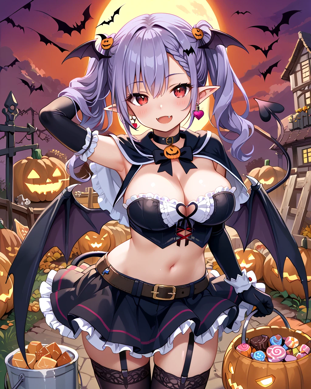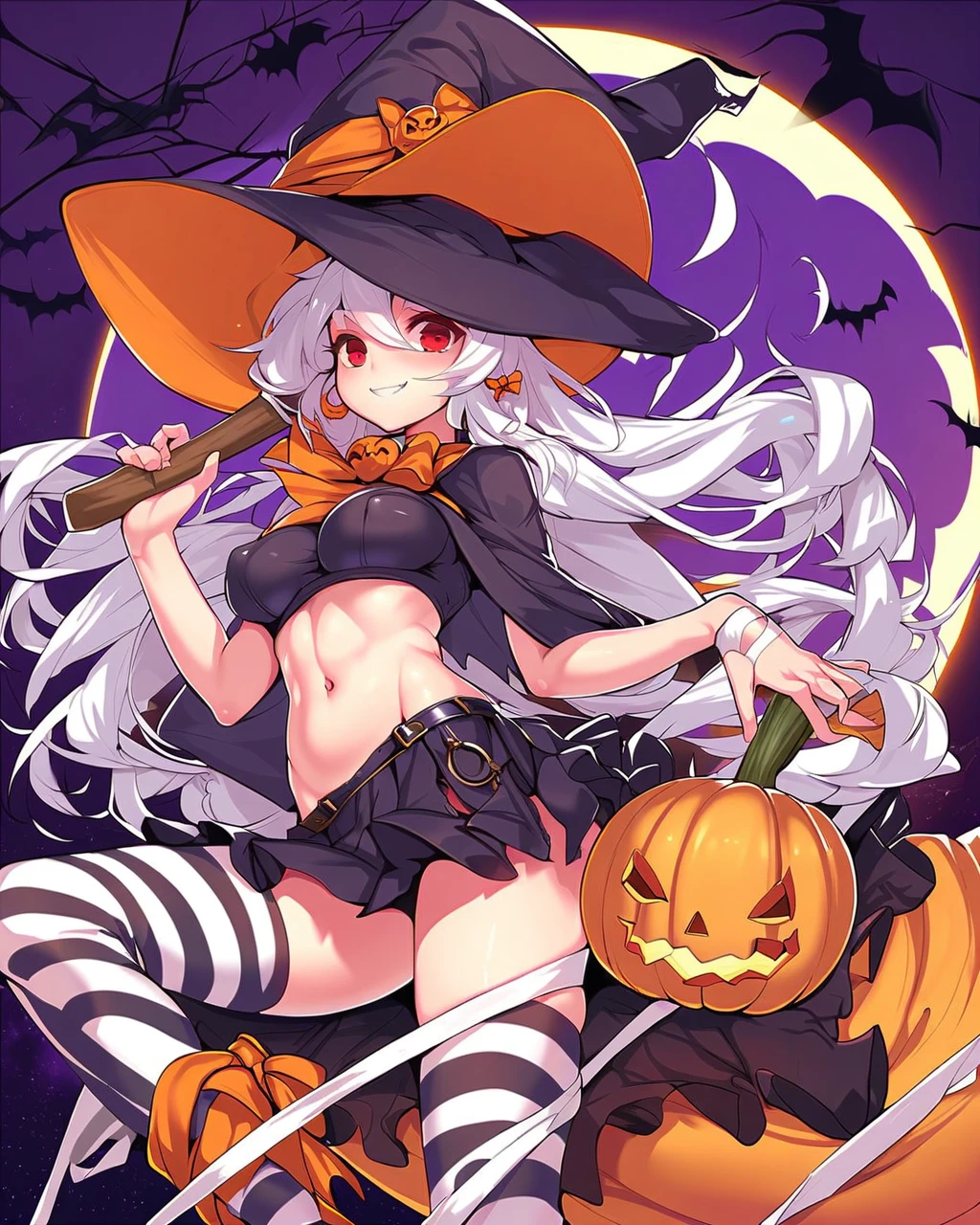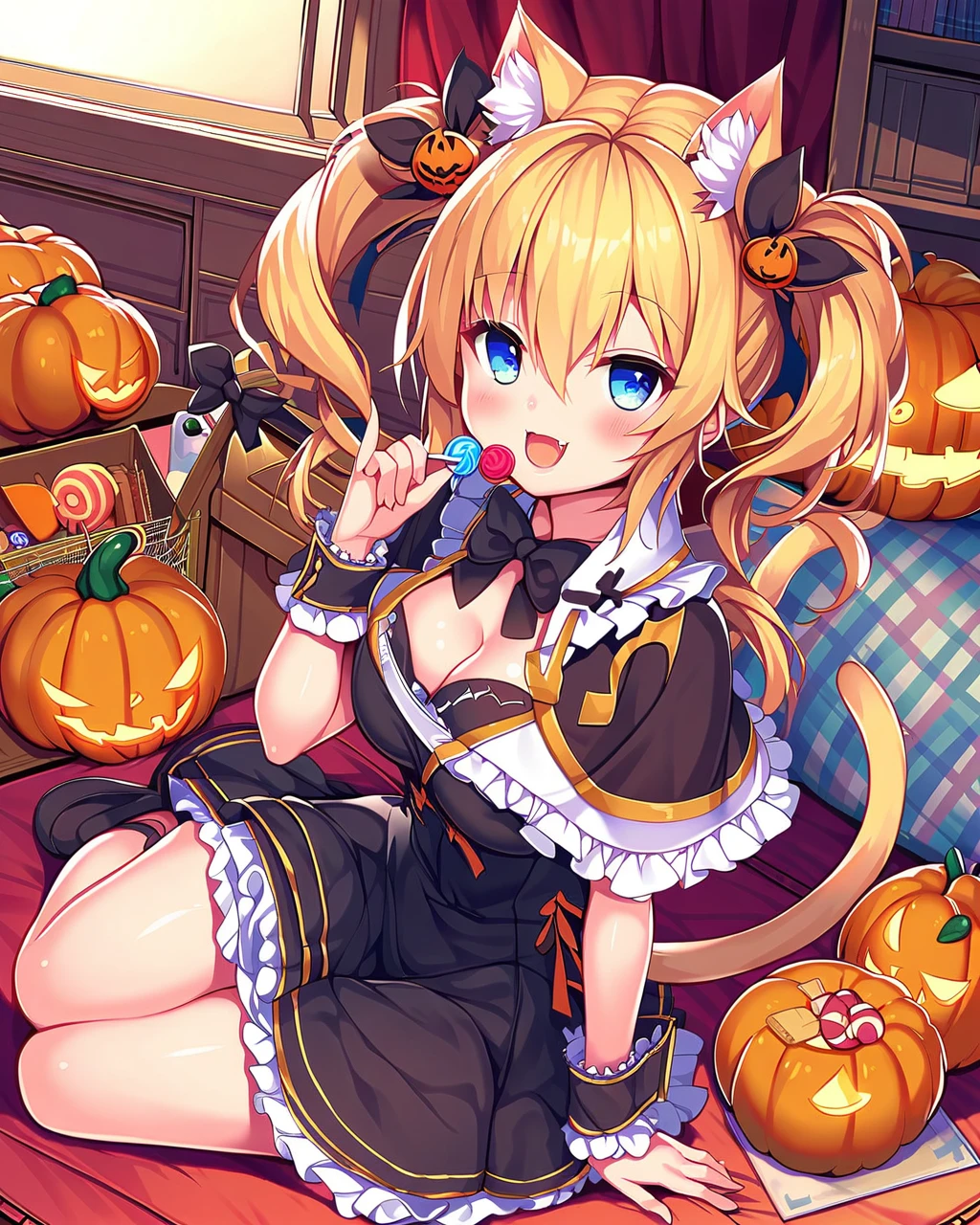 Trained tags: halloween, jack-o'-lantern, jack-o'-lantern bucket with candy, swirl lollipop, ghost, halloween striped thighhighs, string of flags, witch hat