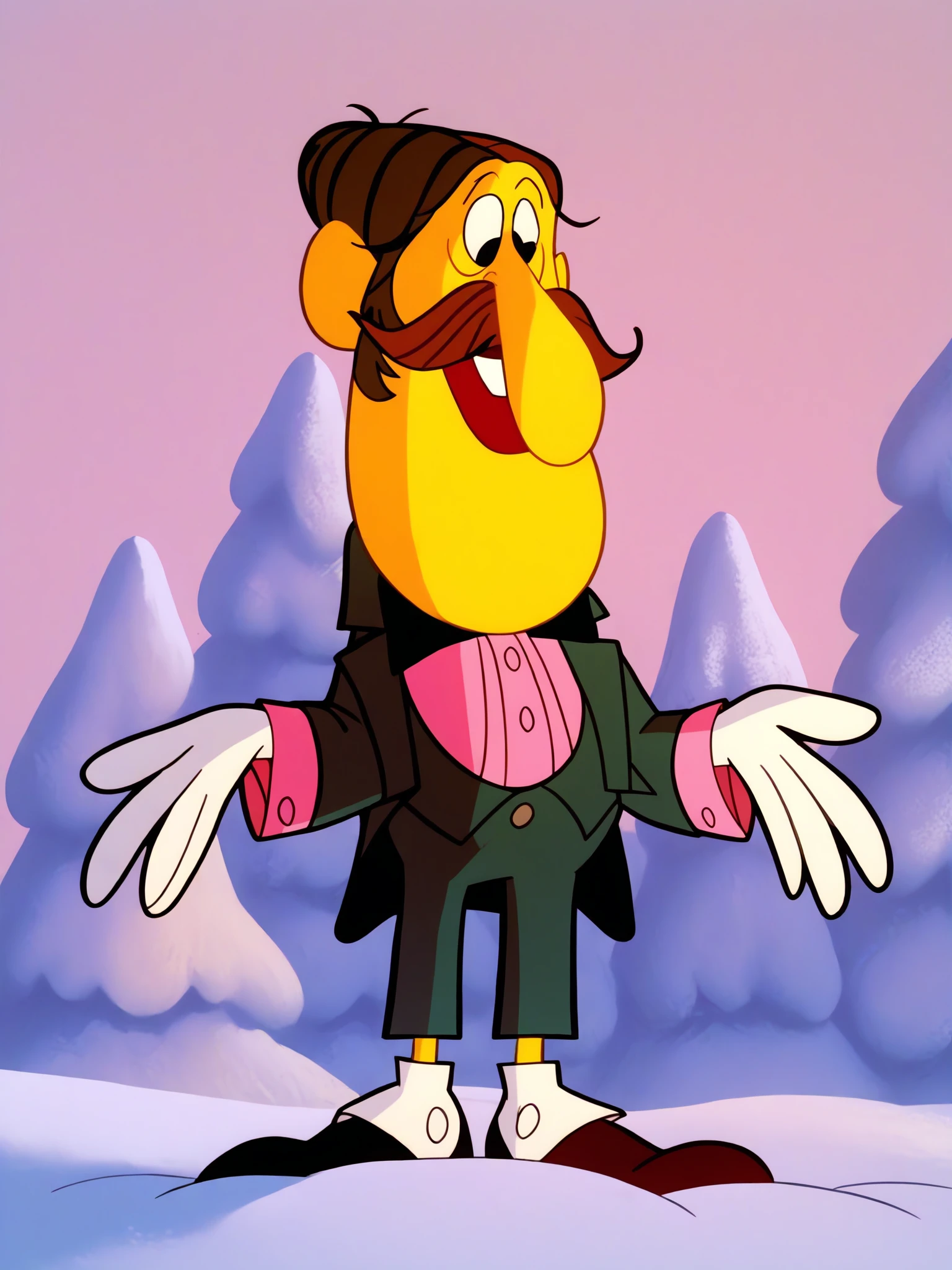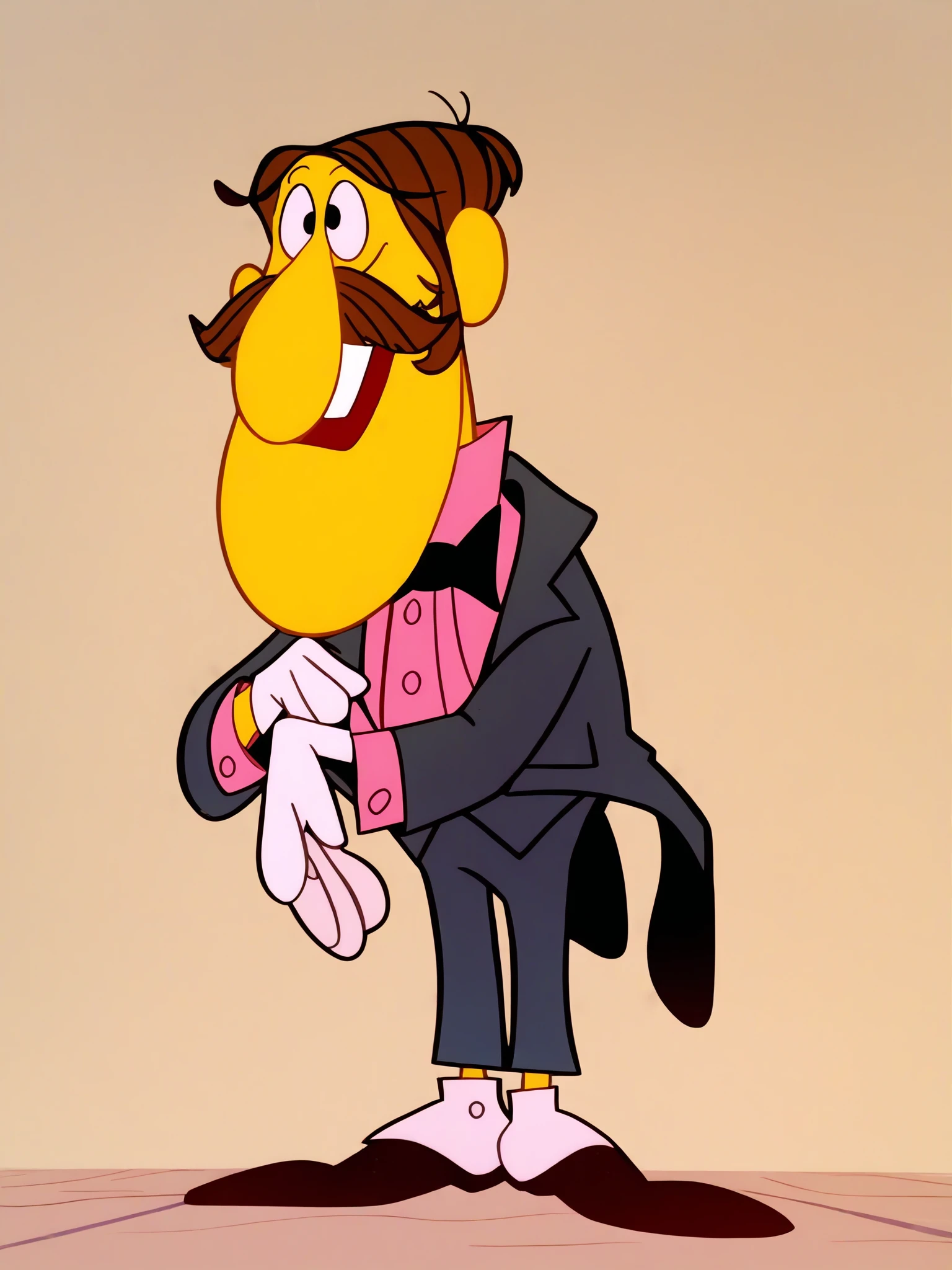Additionals: 1boy, solo, skinny, parody, brown hair, facial hair, mustache, formal, pink shirt, white gloves, suit, coat tails, bowtie