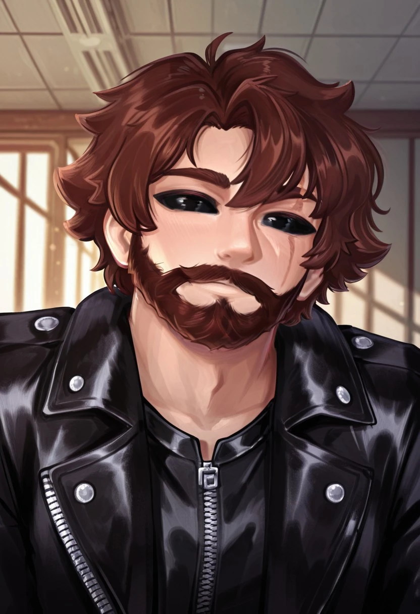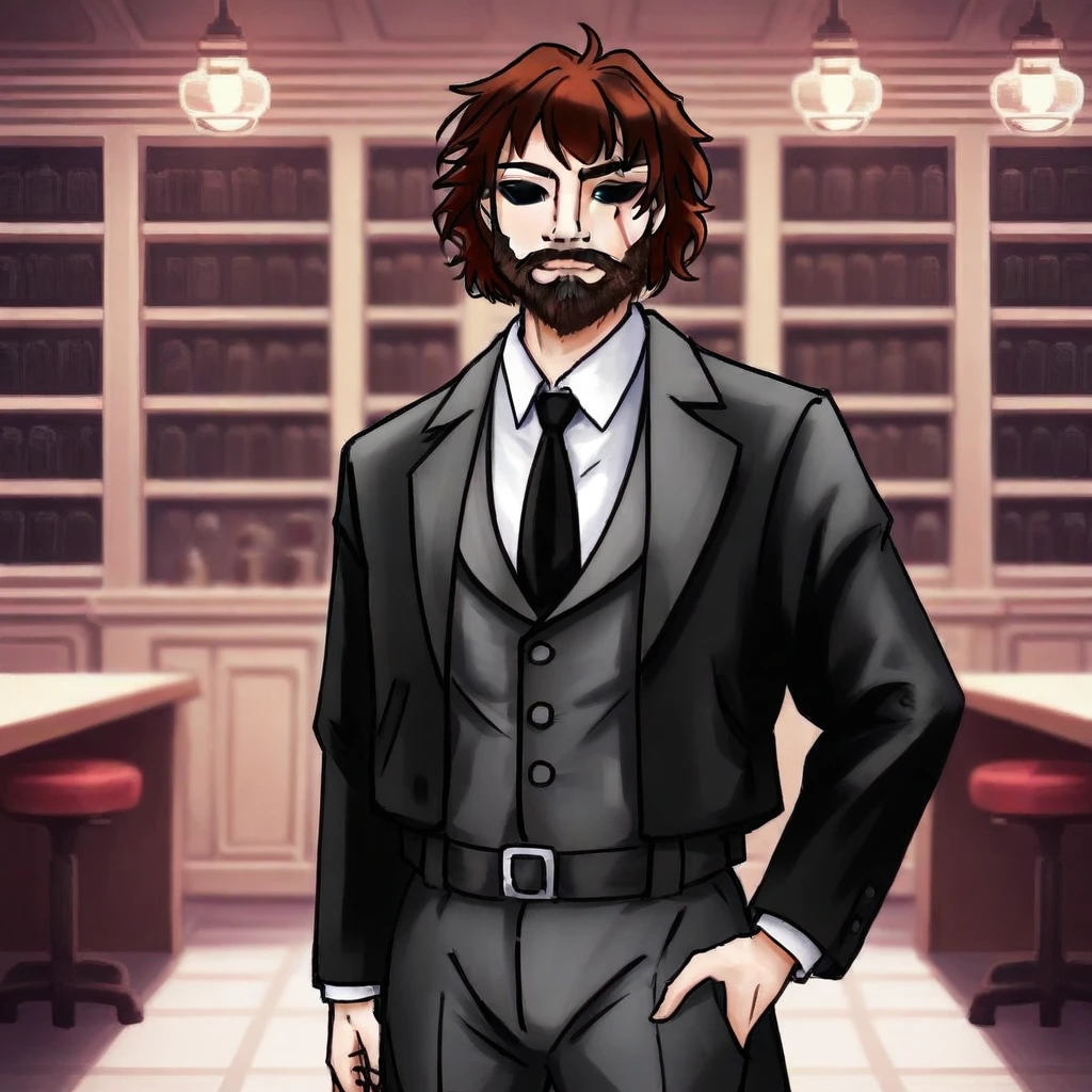 black eyes, brown hair, beard, mustache, scar, scar across the eye