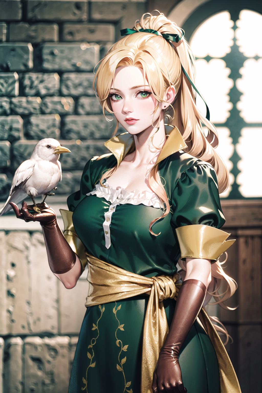maria, long hair, blonde hair, ponytail,wavy hair,green eyes, ribbon