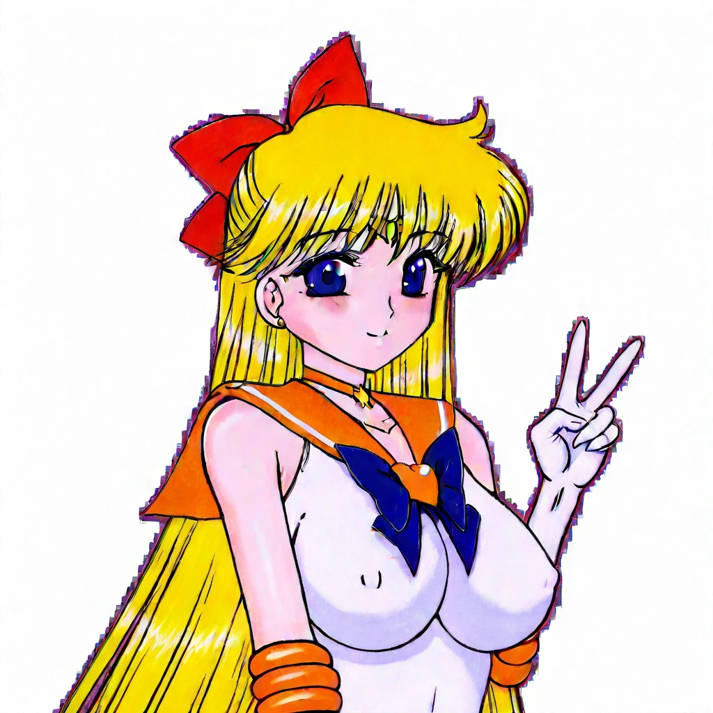 sailor venus, blonde hair, 1girl, solo, bow, long hair, sailor senshi uniform, skirt, blonde hair, jewelry, breasts, red bow, gloves, magical girl, blue eyes, back bow, hair bow, elbow gloves, white gloves, orange skirt, forehead tiara