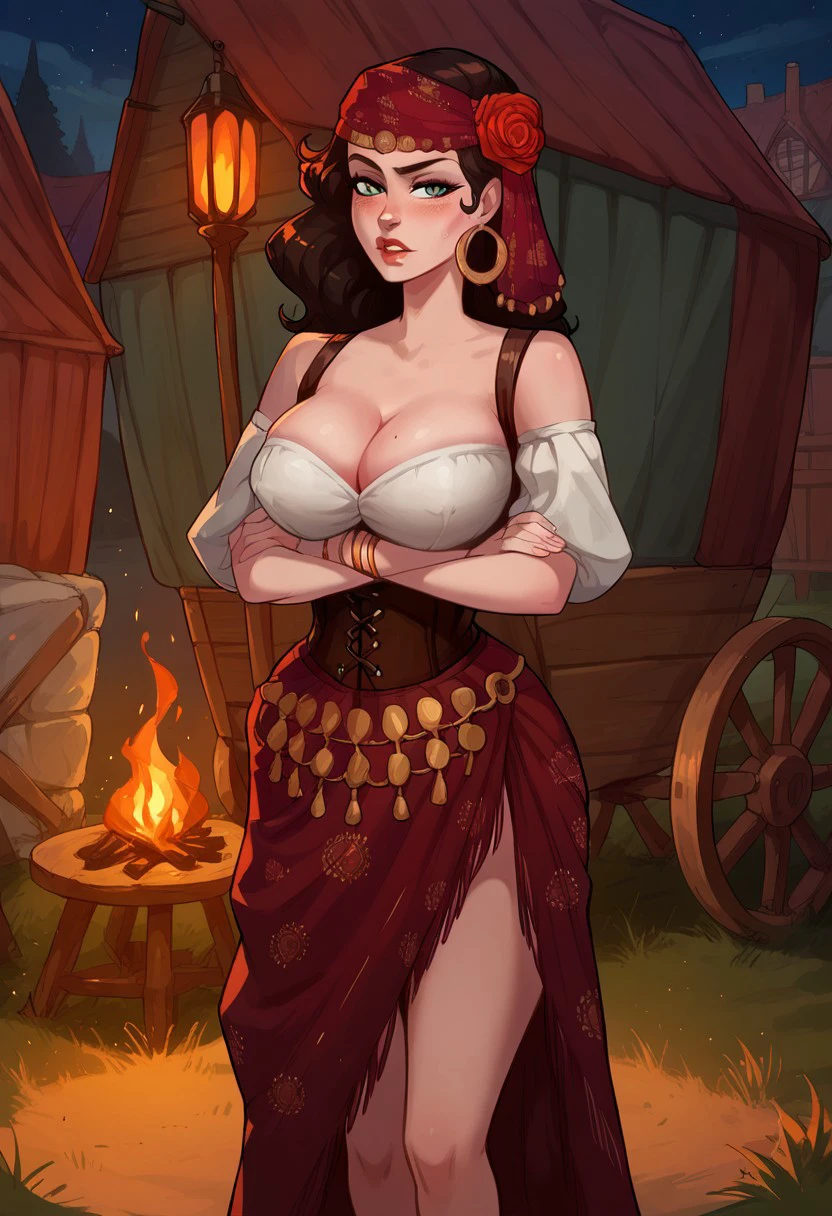 jewelry, earrings, head wrap, flower head ornament, off shoulder white blouse, corset, red skirt, gypsy belt