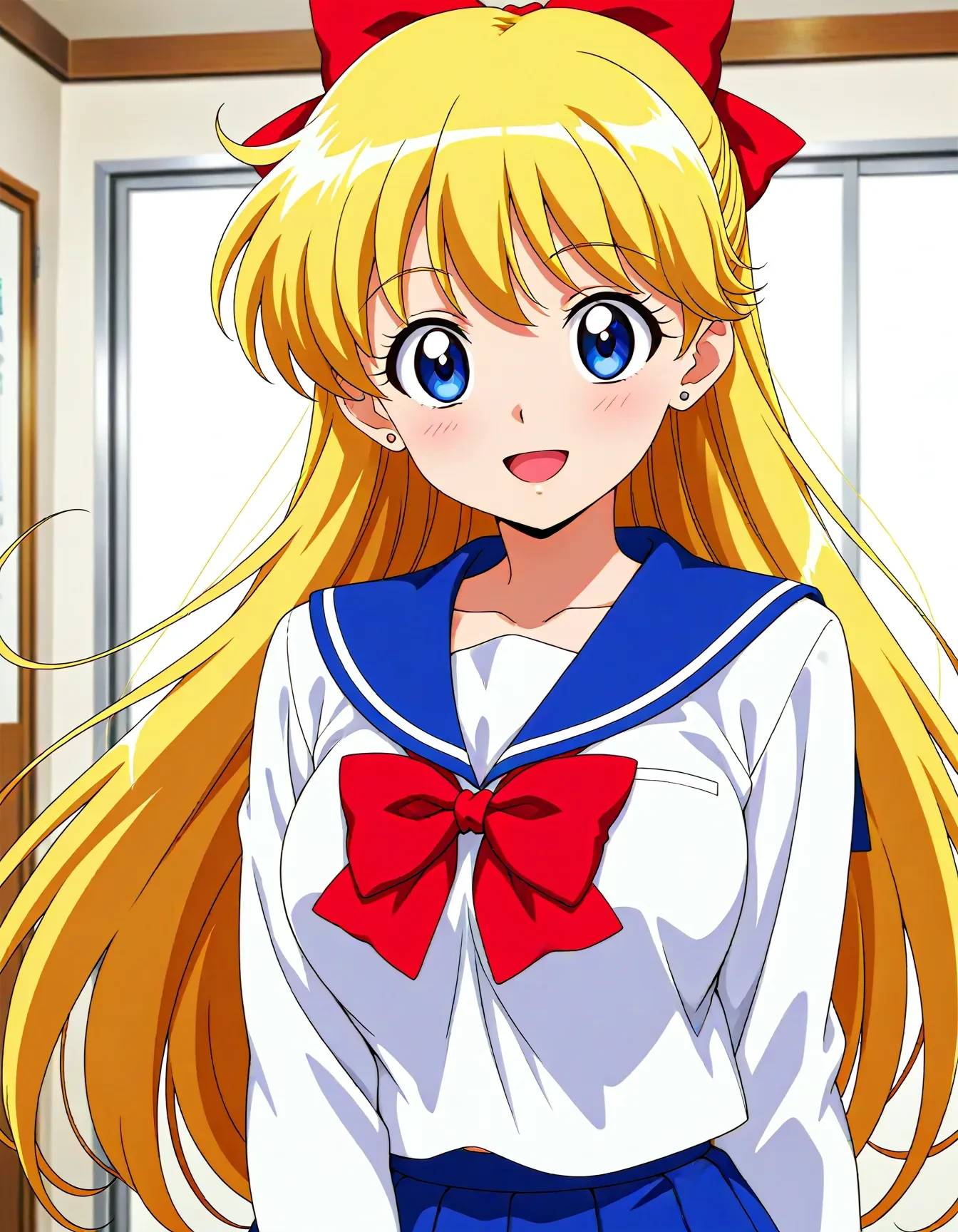 aino minako,solo,blonde hair,long hair,blue eyes,medium breasts,earrings,school uniform,blue skirt,hair bow,white shirt,blue sailor collar,serafuku,shirt,long sleeves,pleated skirt,red bowtie,bowtie,