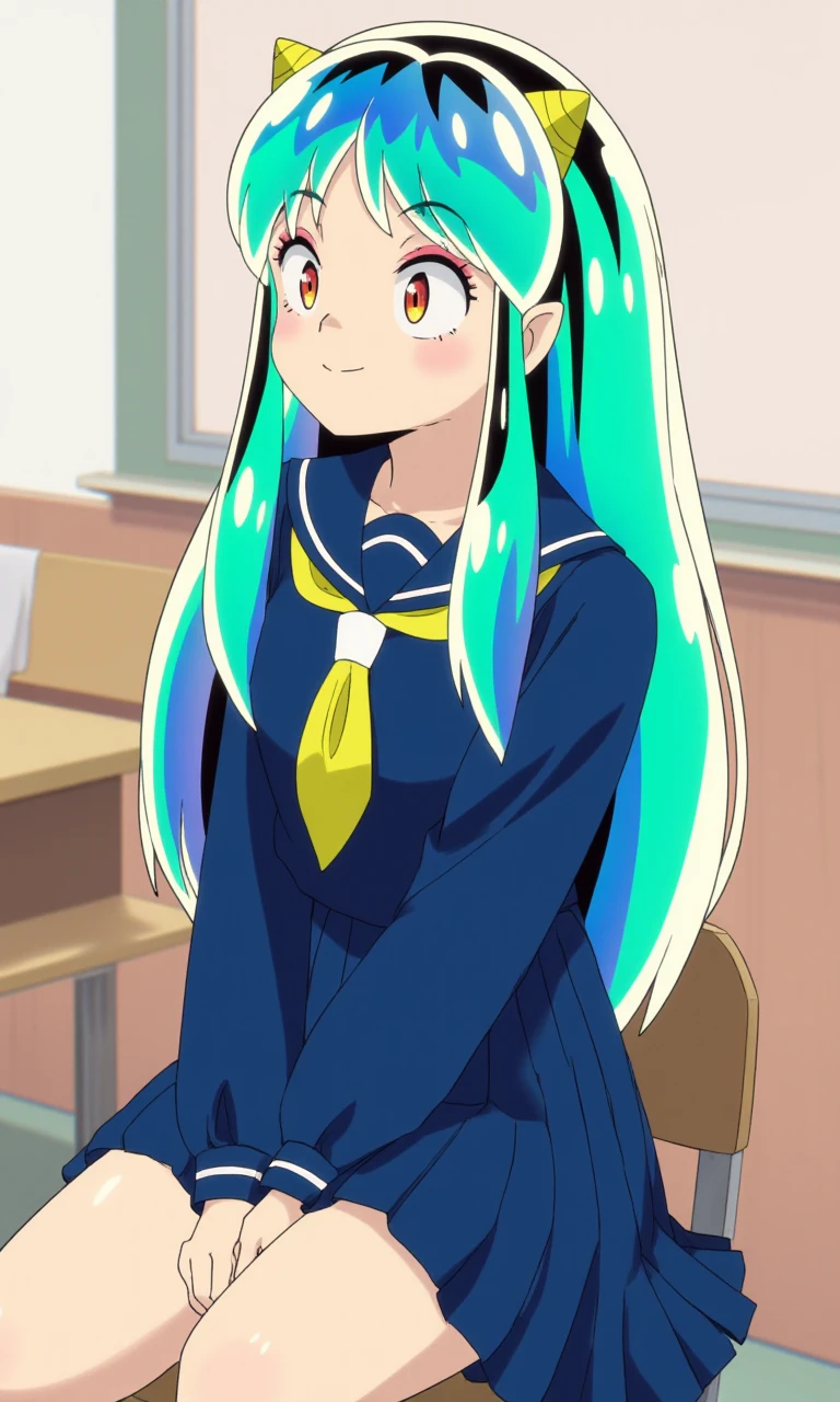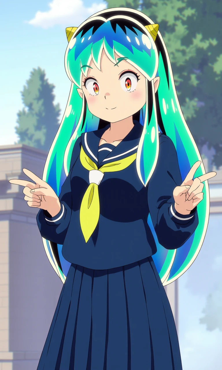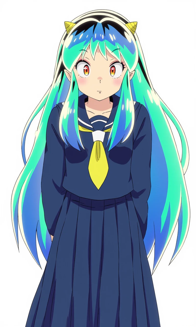 lum_flux, lum, long hair, green hair, aqua hair, multicolored hair, cone horns, serafuku, school uniform, blue shirt, long sleeves, blue skirt, pleated skirt, yellow neckerchief, sailor collar