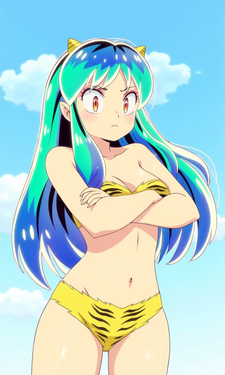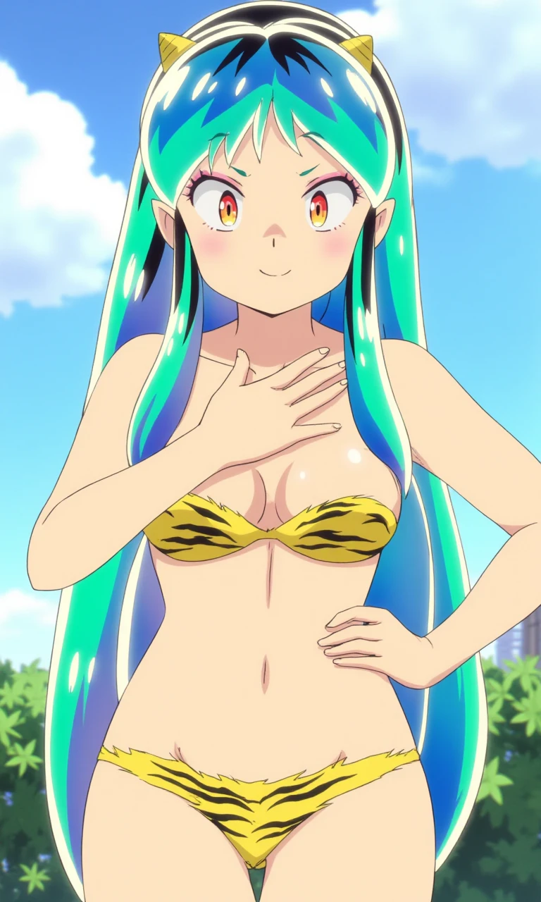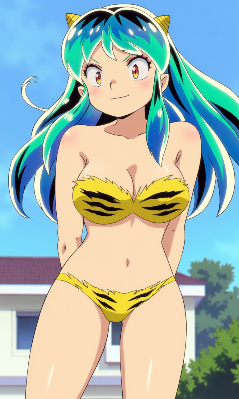 lum_flux,lum, long hair, green hair, aqua hair, multicolored hair, cone horns, pointy ears, animal print, tiger print, bikini, strapless bikini, navel, medium breasts, boots, orange eyes, yellow bikini, print bikini