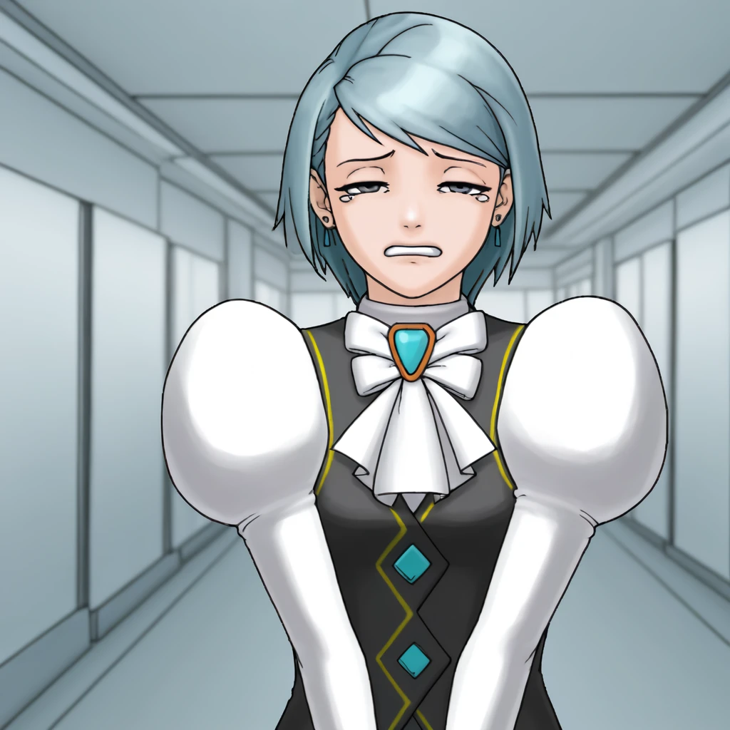 Outfit Tags: black vest, white shirt, juliet sleeves, miniskirt, pantyhose, black gloves, ascot, white bow, brooch, high heel boots, blue earrings